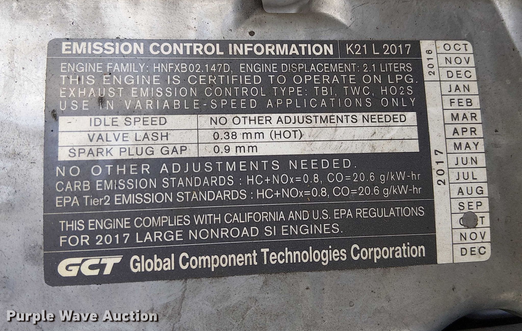 2017 UniCarriers CFS40 forklift. Hours: 1,494 on meter, Miles or hours may vary, unit still in use, Serial: CP1F1-9N21463, Unit #: SFS2709. Engine GCT K21L, Displacement: 2.1L, Cylinders: 4, Fuel type: LPG LP bottle: Not included. Transmission Automatic. Operators station OROPS. Features Maximum lift capacity: 3,000 lbs, Maximum lift height: 203", Collapsed mast height: 88", Mast stages: 3, Side shift, Mast tilt, Fork length: 48". Tires Front: 18X6x12 1/8, Rear: 14x5x10, Solid. Notes Warning indicator: Master warning, Front wheel damaged. Ferguson. Los Angeles, CA 91311