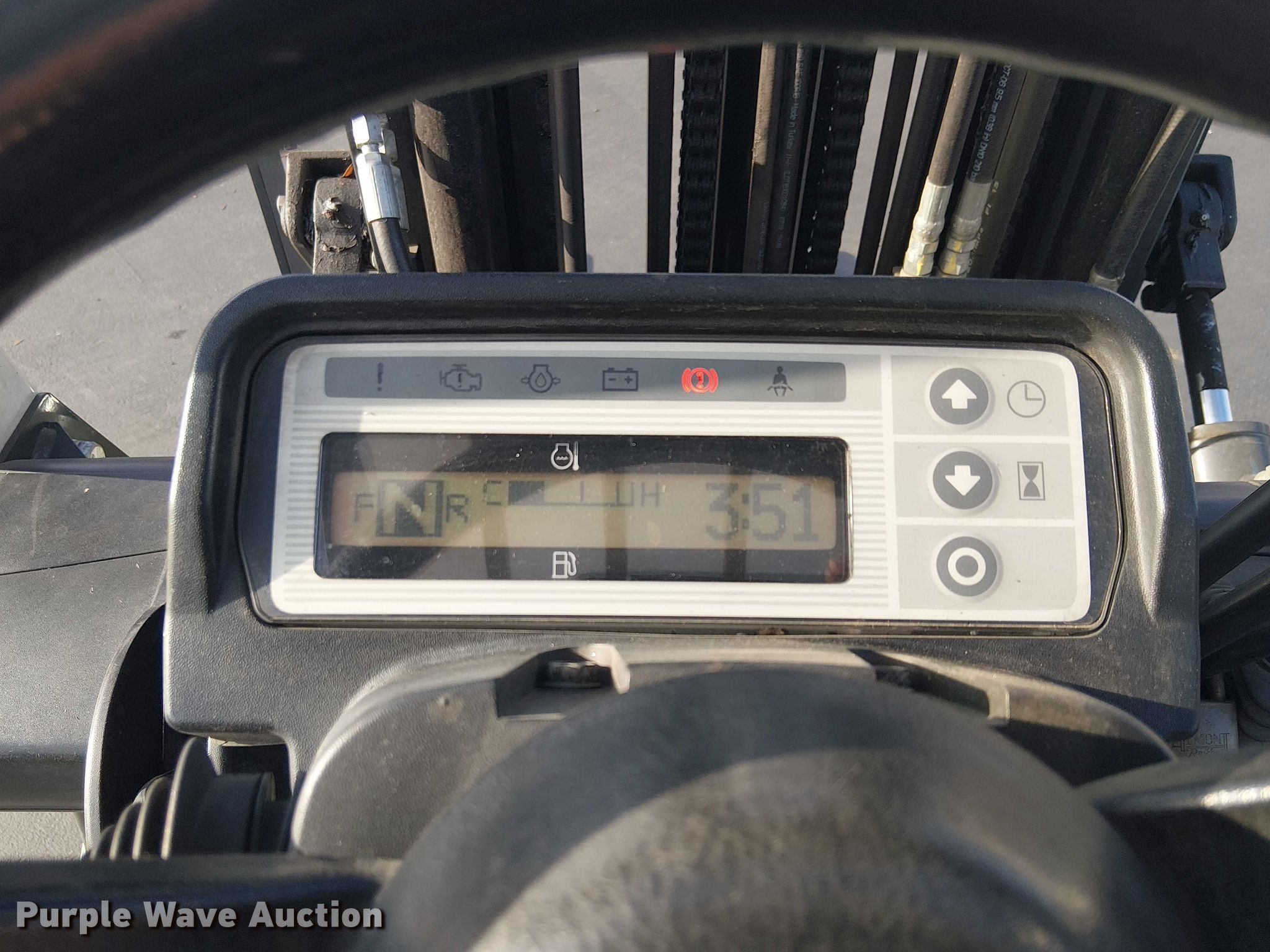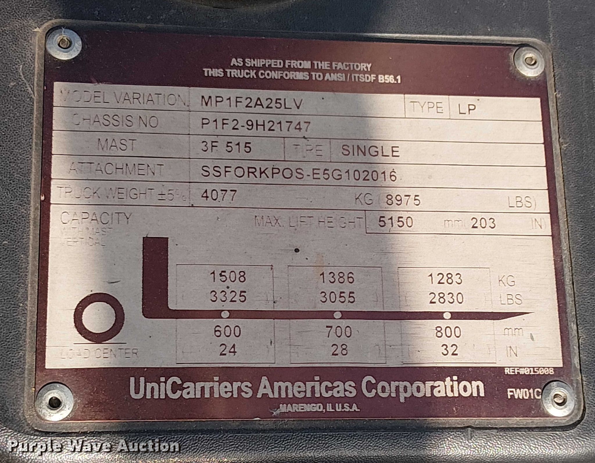 2016 UniCarriers PF50 forklift. Hours: 2,030 on meter, Miles or hours may vary, unit still in use, Serial: P1F2-9H21747, Unit #: SFS2741. Engine GCT K21L, Displacement: 2.1L, Cylinders: 4, Fuel type: LPG LP bottle: Not included. Transmission Automatic. Operators station OROPS, Canopy. Features Maximum lift capacity: 3,325 lbs, Maximum lift height: 203", Collapsed mast height: 88", Mast stages: 3, Side shift, Mast tilt, Fork positioner, Fork length: 48". Tires Front: 7.00-12, Rear: 6.00-9, Solid. Notes Warning indicator: Master warning. Ferguson. Santa Ana, CA 92705