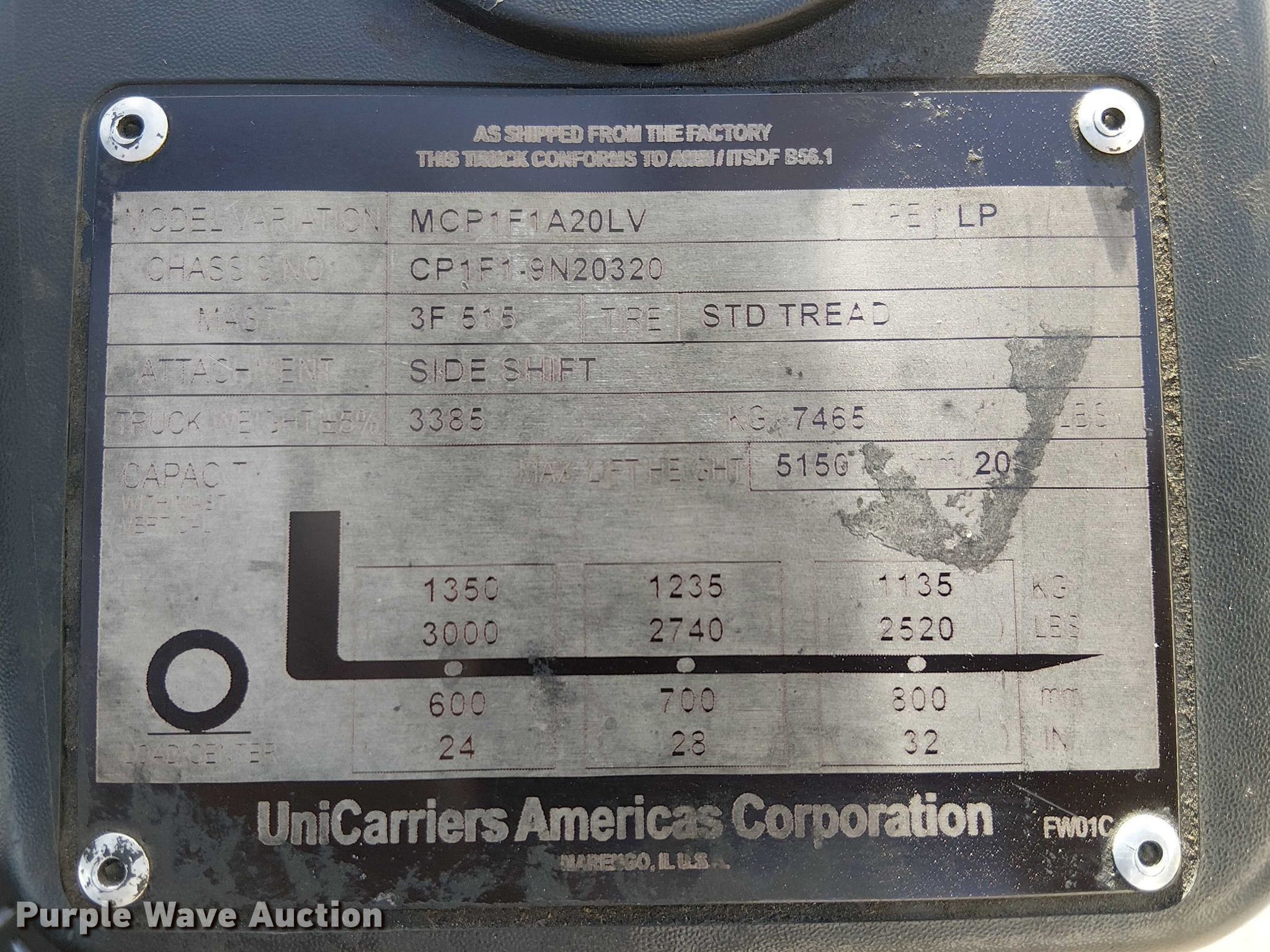 2016 UniCarriers CFS40 forklift. Hours: 7,041 on meter, Miles or hours may vary, unit still in use, Serial: CP1F1-9N20320, Unit #: SFS2737. Engine GCT K21L, Displacement: 2.1L, Cylinders: 4, Fuel type: LPG LP bottle: Not included. Transmission Automatic. Operators station OROPS. Features Maximum lift capacity: 3,000 lbs, Maximum lift height: 203", Collapsed mast height: 88", Mast stages: 3, Side shift, Mast tilt, Fork length: 48". Tires Front: 18X6x12 1/8, Rear: 14x5x10, Solid. Notes Warning indicator: Master warning. Ferguson. El Cajon, CA 92020