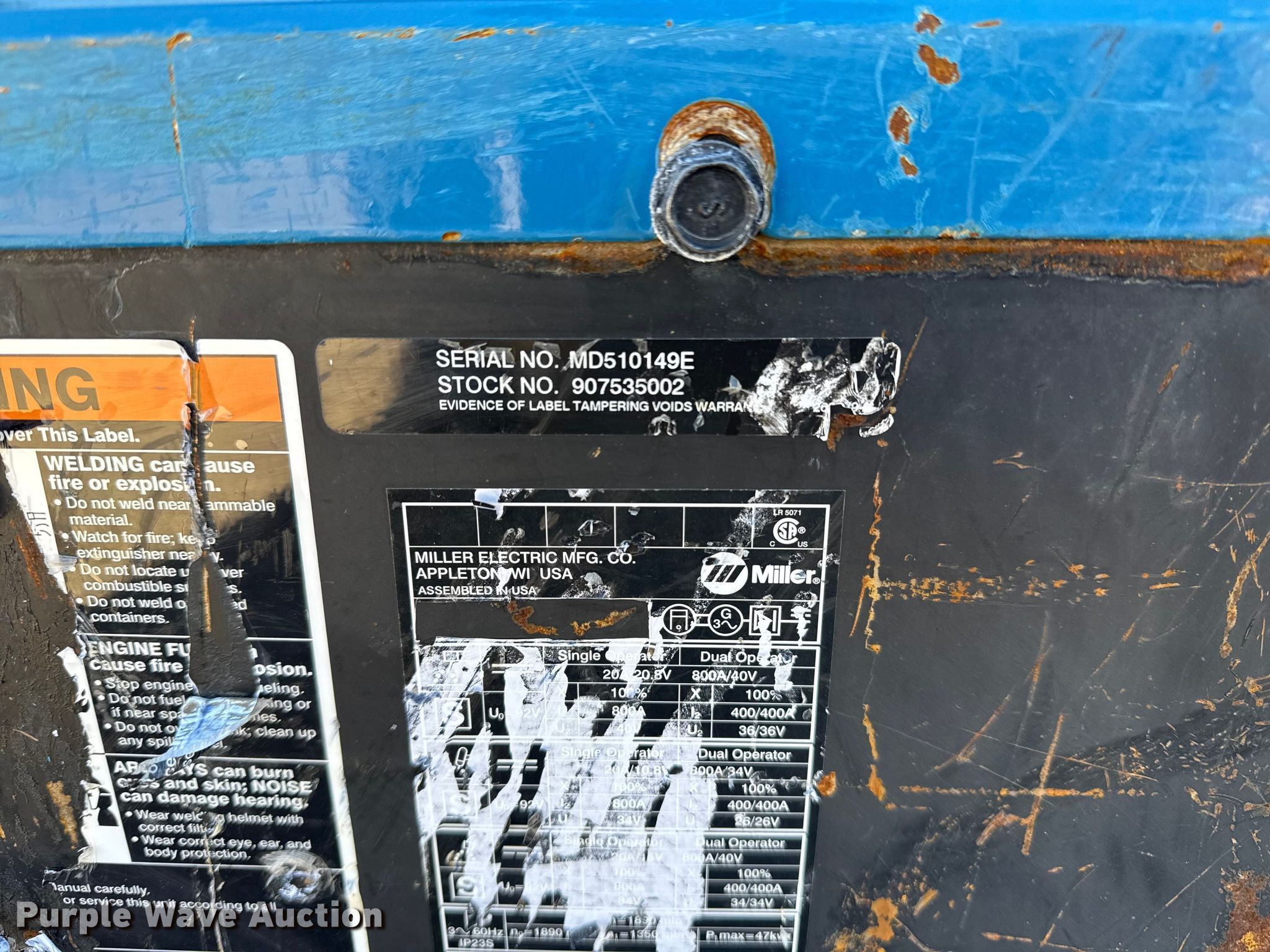 Purple Wave is selling a used Welder (Manual) in Oklahoma. This item is a Miller Big Blue 800 Duo Air Pak welder/generator with the following: Hours: 569 on meter, Serial: MD510148E