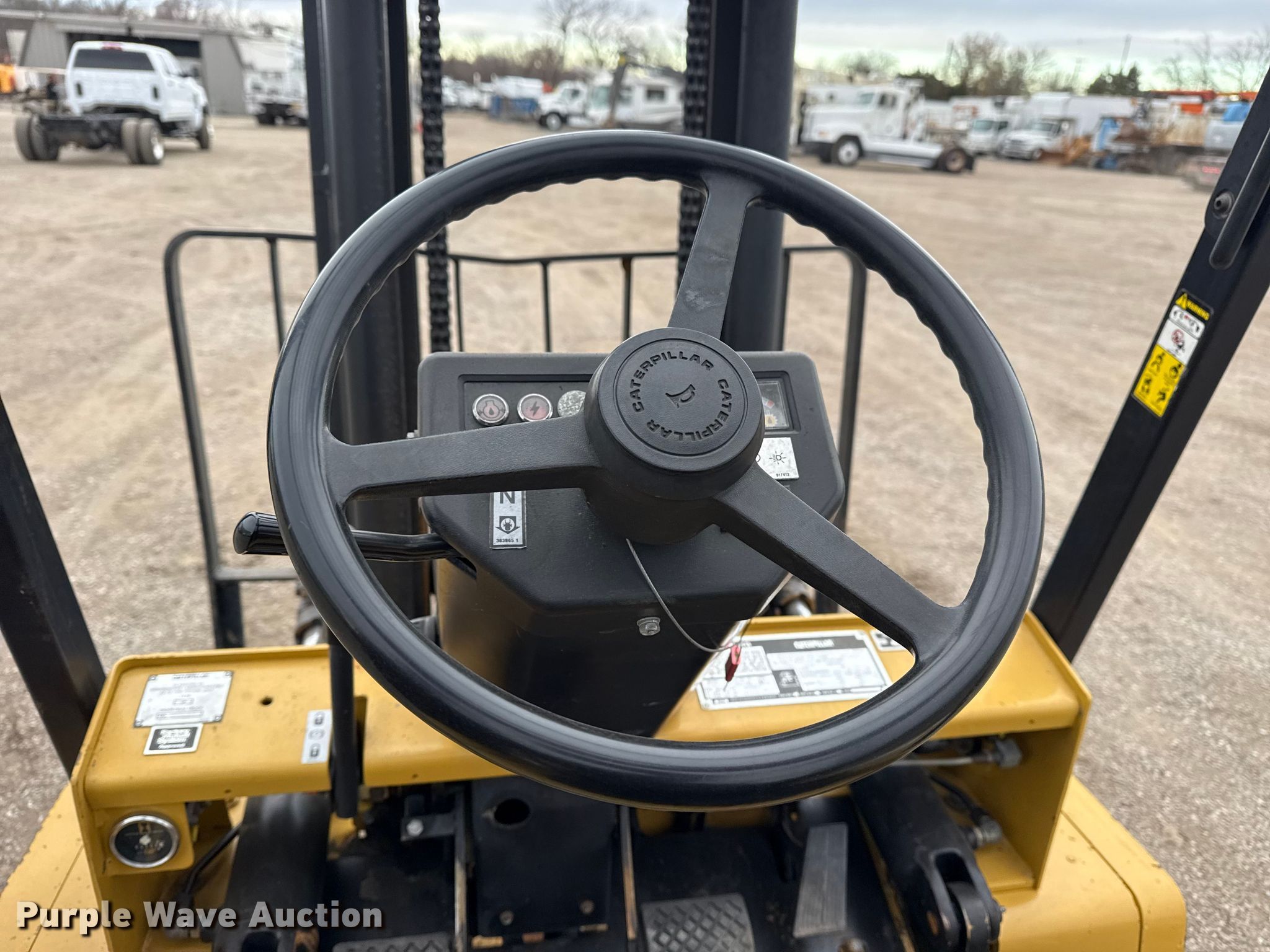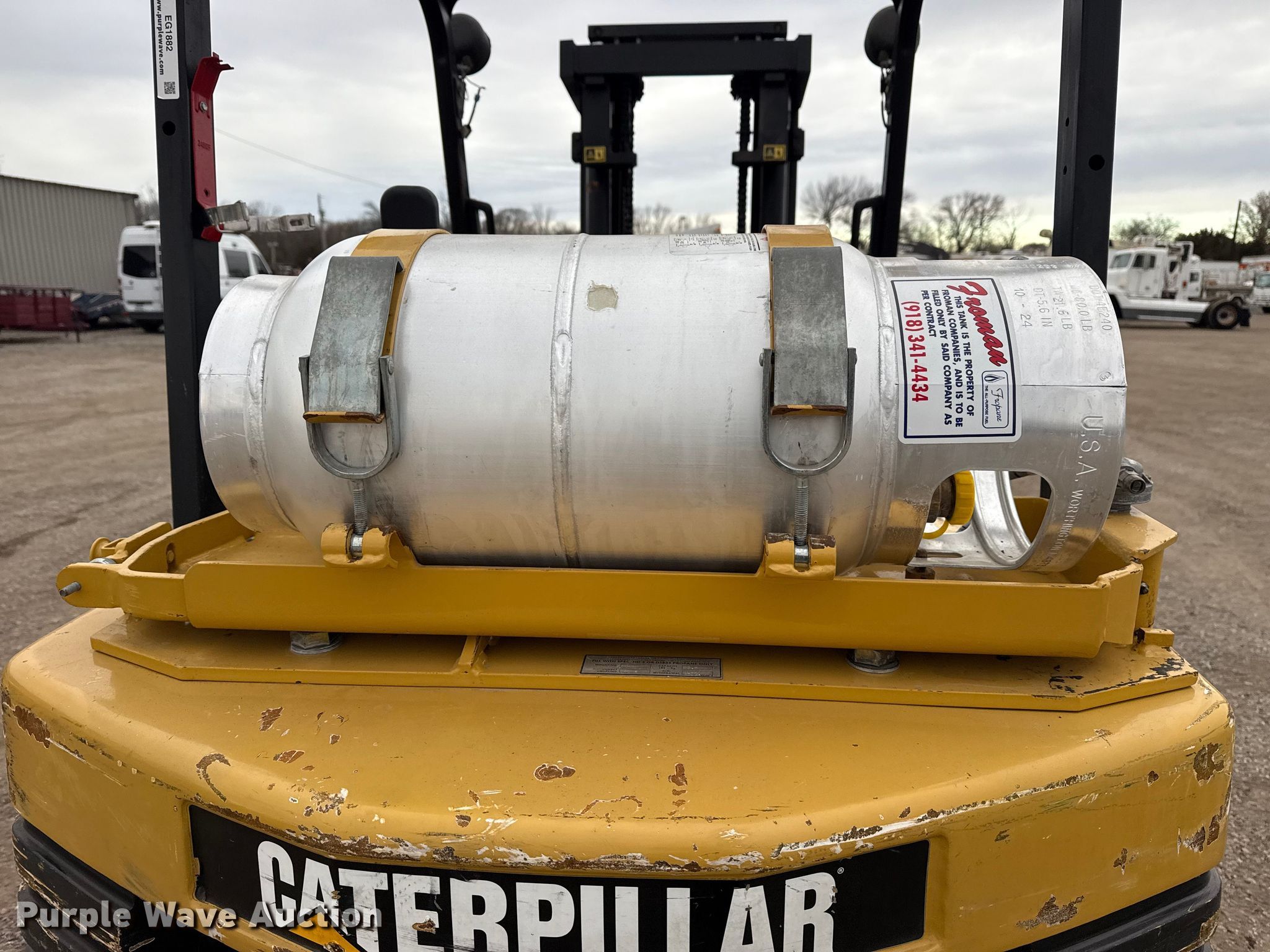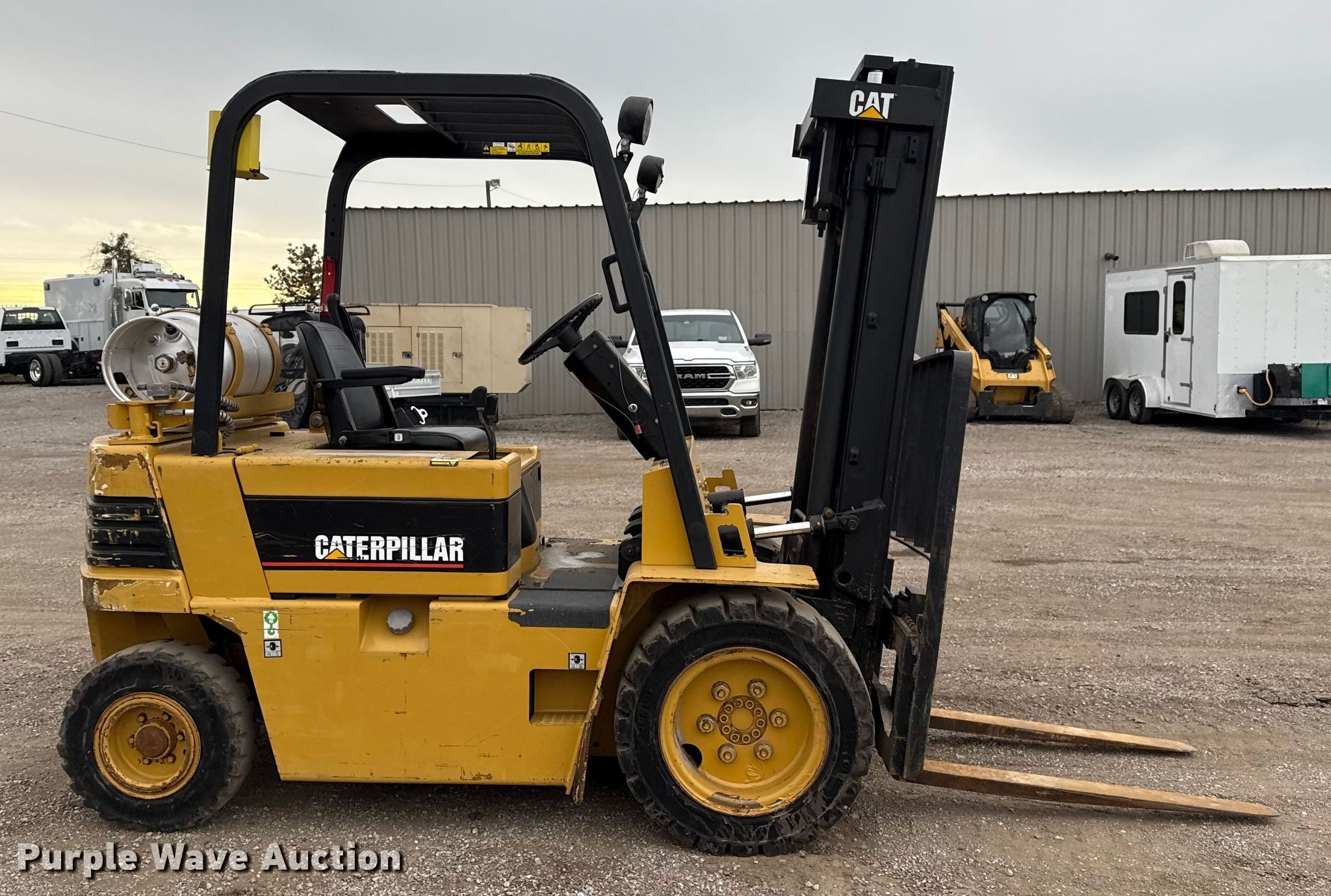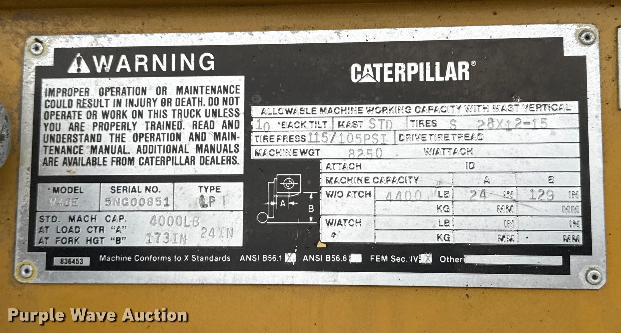 1993 Caterpillar V40E forklift. Hours: 4,358 on meter, Serial: 5NG00851. Engine Caterpillar, Cylinders: 4, Fuel type: LPG LP bottle: Included. Transmission Powershift. Operators station OROPS. Features Maximum lift capacity: 4,400 lbs, Maximum lift height: 129", Collapsed mast height: 84", Mast stages: 2, Mast tilt, Fork length: 42". Tires Front: 28x12.5-15, Rear: 6.50-10, Solid. Collinsville, OK 74021