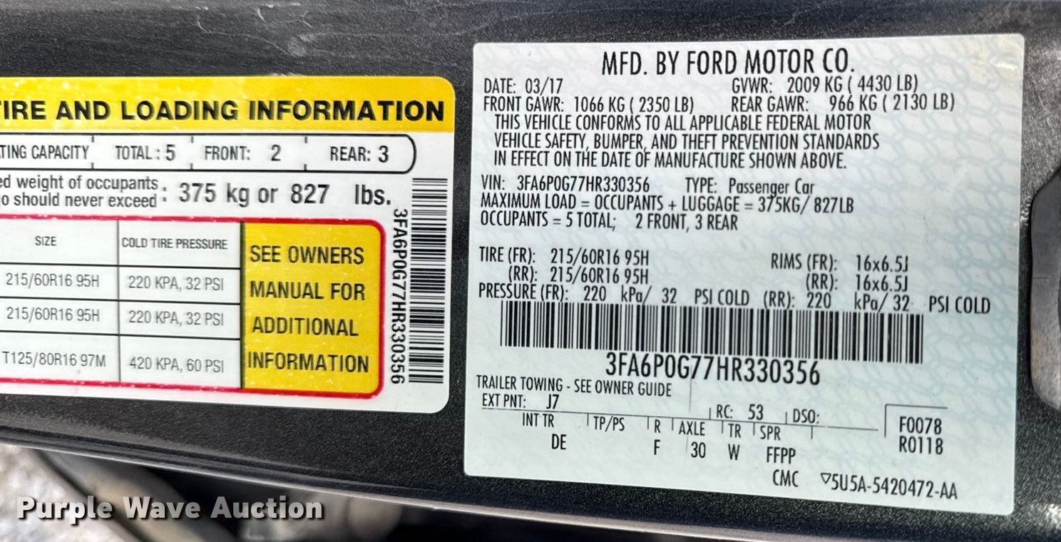 2017 Ford Fusion. Miles: 120,111 on odometer, VIN: 3FA6P0G77HR330356. Engine Displacement: 2.5L, Cylinders: 4, Fuel type: Gas. Transmission Automatic. Interior AC, Heat, Power windows, Power locks, Cruise control. Tires Size: 215/60R16. Notes Dash warning indicator: TPMS. Kansas title. Title distribution may be delayed up to 30 days from verification of funds. Southeast Kansas Mental Health Center. Chanute , KS 66749