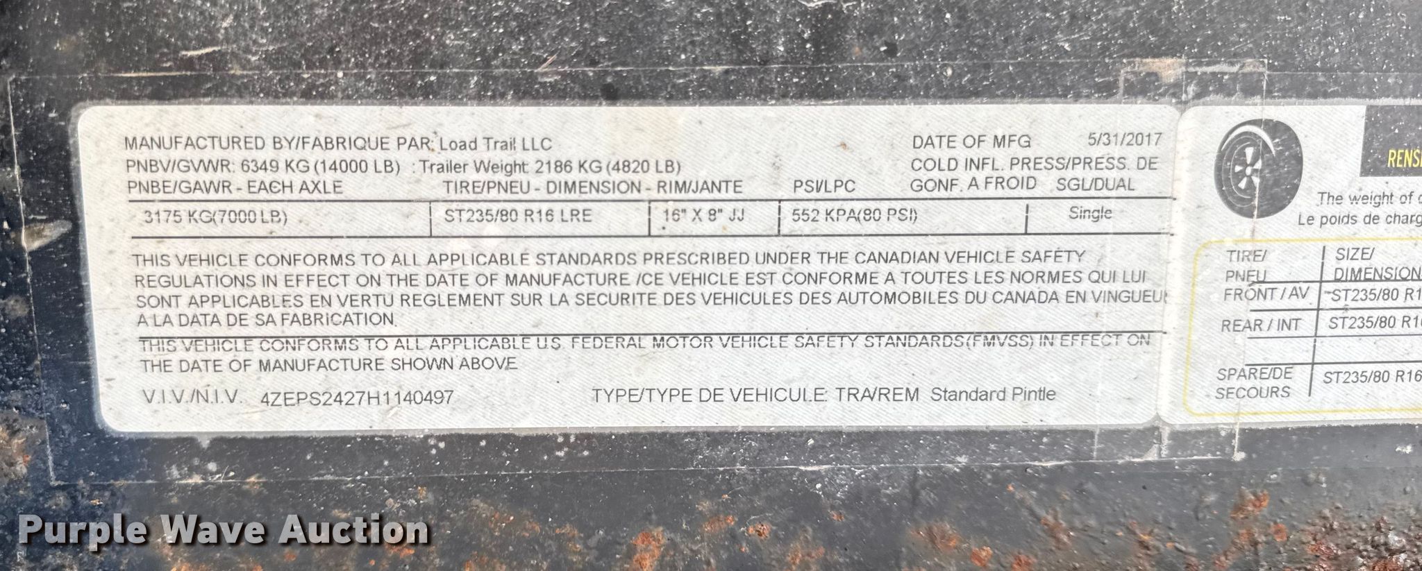 2017 Load Trail equipment trailer. VIN: 4ZEPS2427H1140497. Dimensions Overall Length: 30', Width: 102", Deck Length: 18' 6", Width: 97", Deck height: 31", Tail length: 5' 6", Ramps: Manual Length: 60". Features Deck type: Wood. Chassis Ball hitch: 2 5/16", Landing gear: Dual, Suspension: Spring, Brakes: Electric, Axles: Tandem, GVWR: 14,000 lbs, GAWR: 7,000 lbs. Tires Steel wheels, Size: 235/80R16. Notes Ramp welds damaged. Illinois title. Heritage Tractor. Aledo, IL 61231