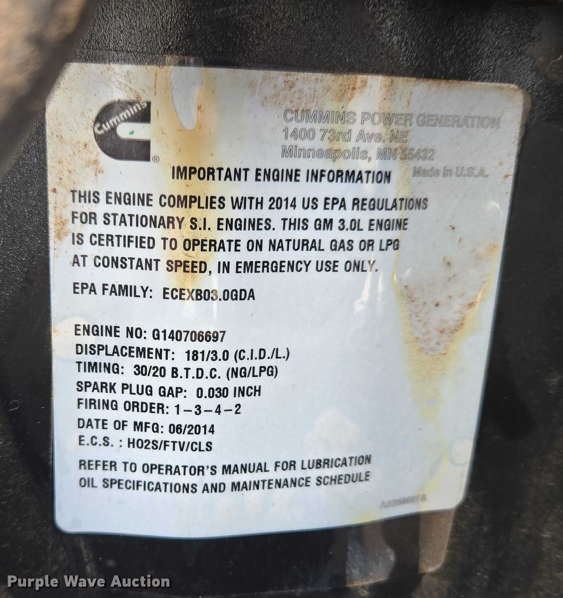 Cummins GGMB-1408154 generator. Hours: 481 on meter, Serial: G140706697. Engine Cummins, Serial: G140706697, Displacement: 3.0L, Cylinders: 4, Fuel type: LPG, Natural gas LP bottle: Not included. Features Generator Cummins GGMB-1408154, kVA: 25, kW: 25, Phase: Single, Electric start. Notes Transfer switch and battery not included. Pioneer Telephone Company. Kingfisher, OK 73750
