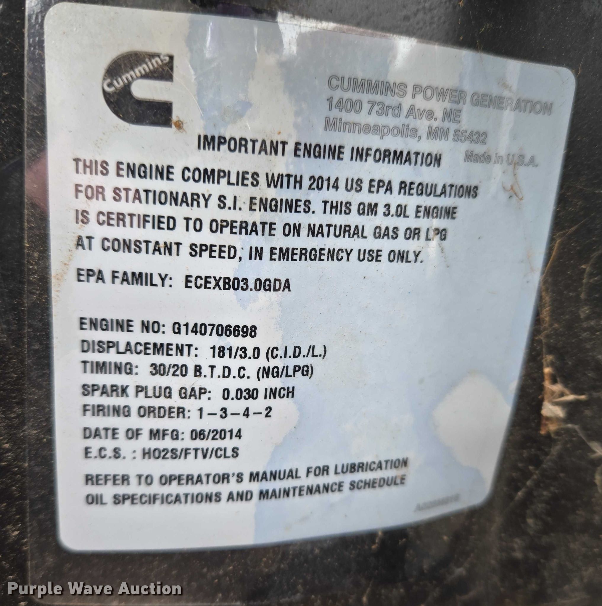 Purple Wave is selling a used Generator Set in Oklahoma. This item is a Cummins GGMB-1408154 generator with the following: Hours: 541 on meter, Serial: G140706698