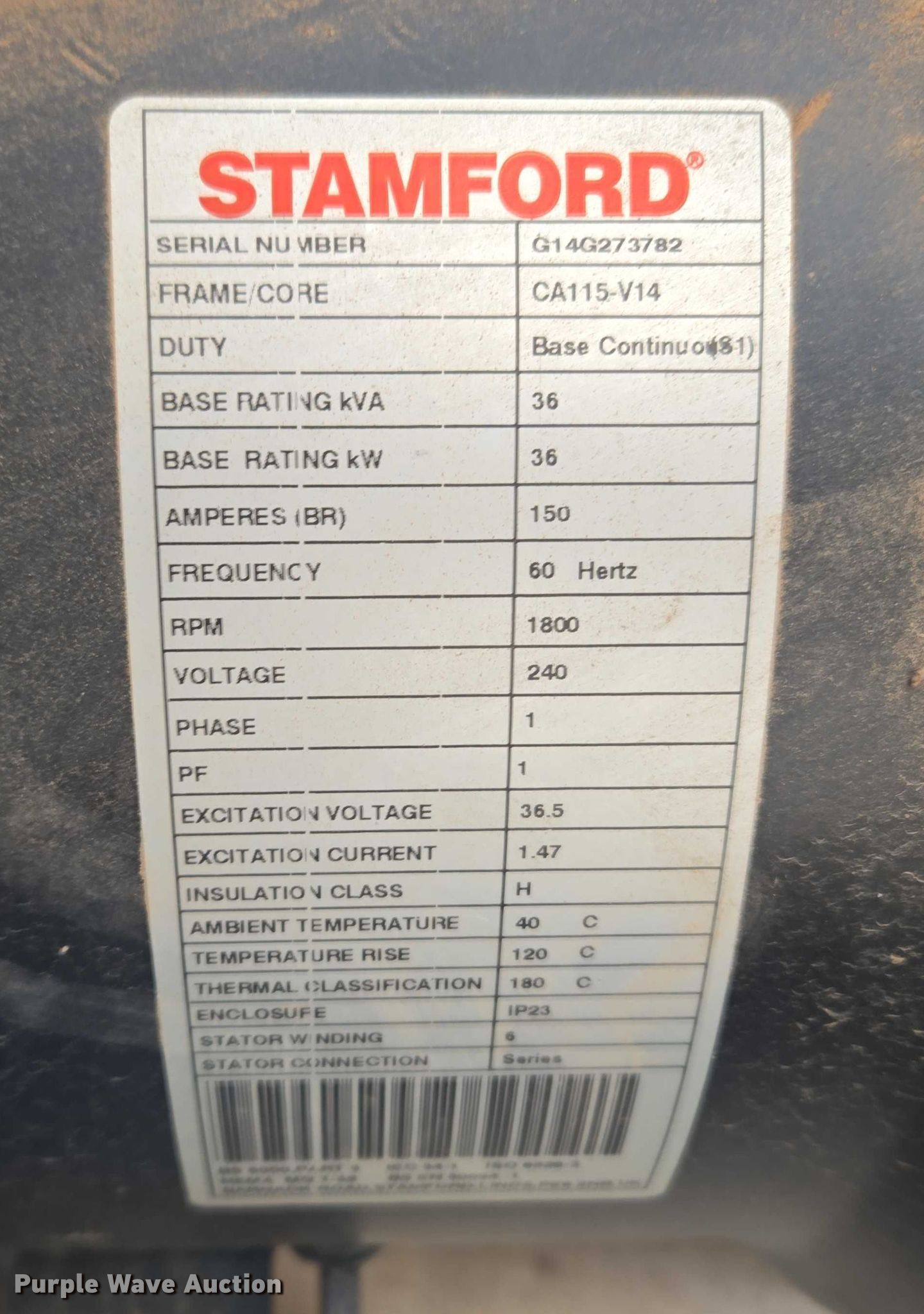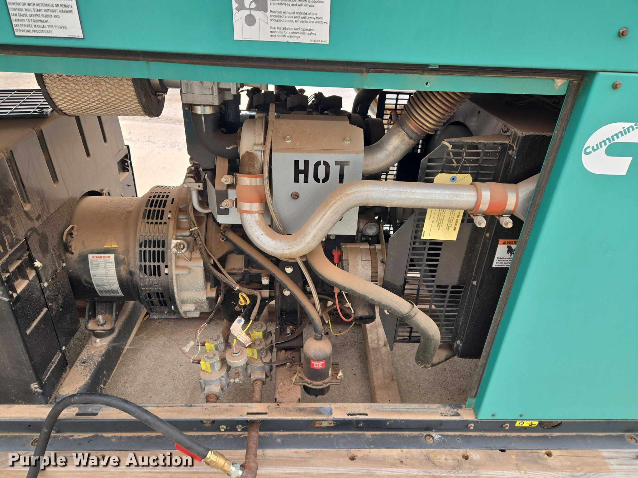 Cummins C36 N6 generator. Hours: 595 on meter, Serial: H140734349. Engine Cummins, Serial: H150734349, Displacement: 2.4L, Cylinders: 4, Fuel type: LPG, Natural gas LP bottle: Not included. Features Generator STAMFORD, kVA: 36, kW: 36, Phase: Single, Electric start. Notes Transfer switch and battery not included. Pioneer Telephone Company. Kingfisher, OK 73750