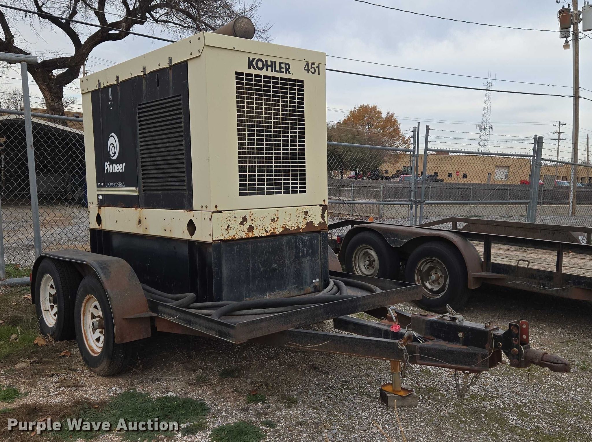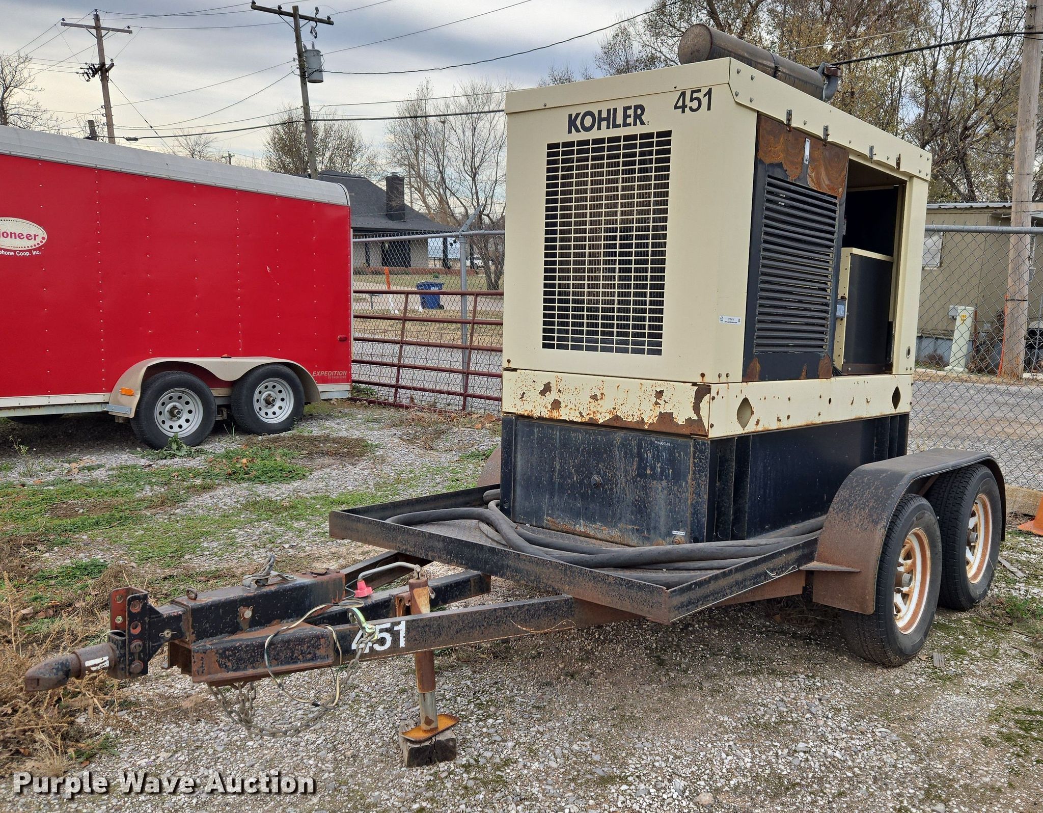 Kohler 40RE0ZJB generator. Hours: 3,888 on meter, Serial: 2033888. Engine John Deere 3029TF270, Cylinders: 3, Fuel type: Diesel. Features Generator Phase: Single, Electric start, Fuel tank, Skid mounted. Trailer 2005 Starlite trailers, 15' L x 81" W, Ball hitch size: 2", Suspension: Spring, Brakes: Hydraulic, Axles: Tandem, Tire size: ST205/75R15. Notes Possible control board issues, Door missing, Tire damage, Non-operational unit. Transfer of ownership documentation will be a bill of sale. Pioneer Telephone Company. Kingfisher, OK 73750