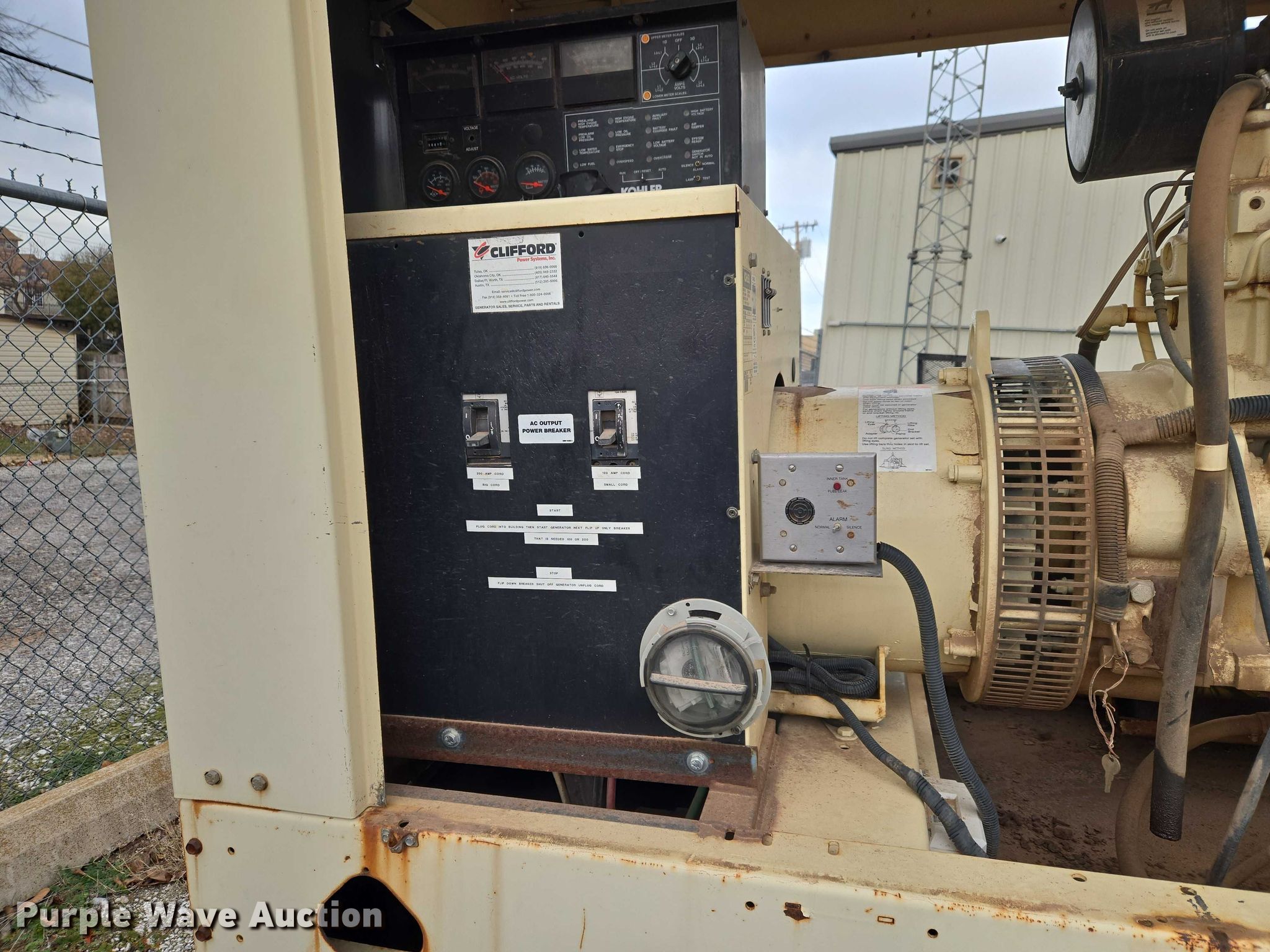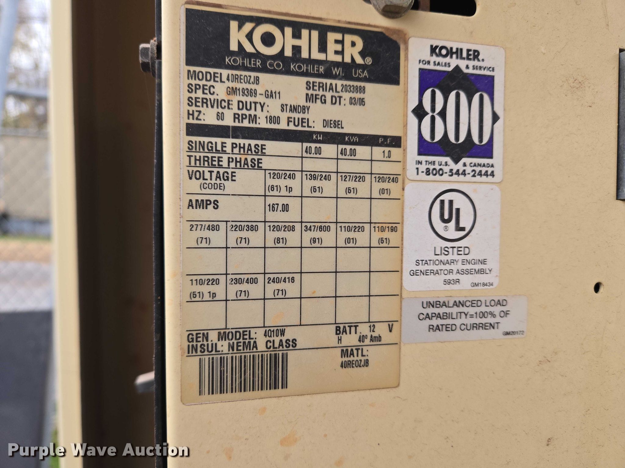 Purple Wave is selling a used Generator Set in Oklahoma. This item is a Kohler 40RE0ZJB generator with the following: Hours: 3,888 on meter, Serial: 2033888
