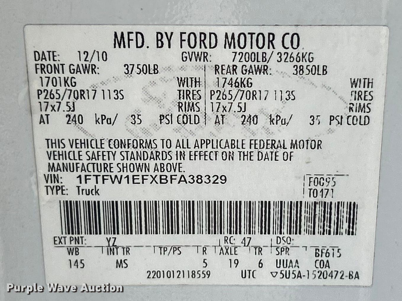 - VIN: 1FTFW1EFXBFA38329