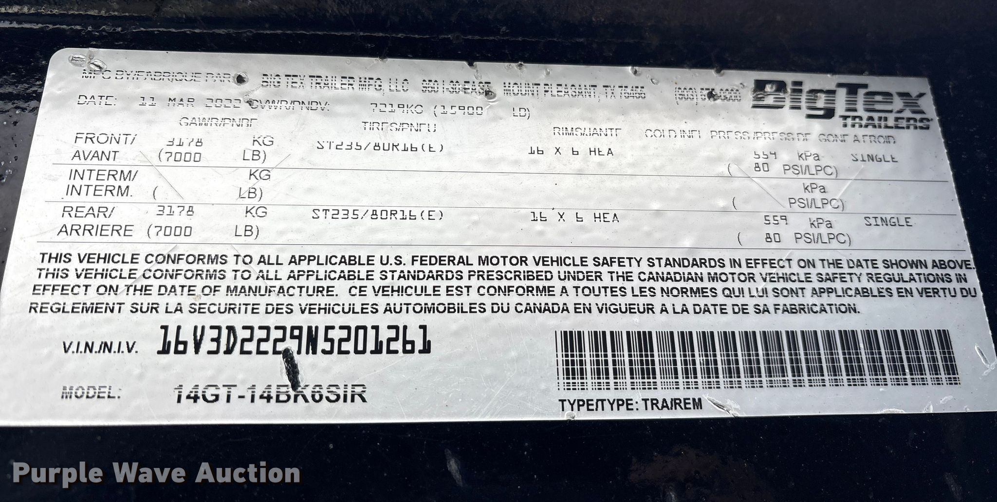 Take a look at this used 2022 Big Tex 14GT-14BK6SIR dump trailer being sold on January 14th, 2026 in the Wednesday January 14 Vehicles and Equipment Auction made by Big Tex. Take a look at all of the item information below or take a look at similar auctions for Trailers.