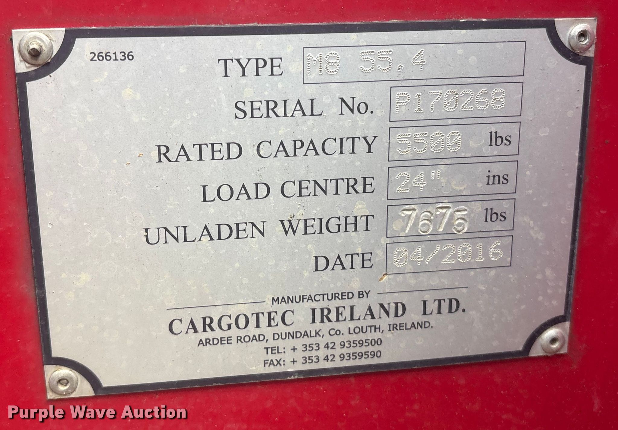 2016 Moffett M85501 forklift. Hours: 524 on meter, Serial: P170268, Unit #: SFS2748. Engine Kohler KD1 1903TCR/26B, Serial: 4606800470, Cylinders: 4, Fuel type: Diesel. Transmission Hydrostatic. Operators station OROPS, Canopy. Features Maximum lift capacity: 5,500 lbs, Maximum lift height: 144", Collapsed mast height: 106", Mast stages: 2, Side shift, Mast tilt, Reach / retract, Fork length: 40". Tires Size: 31.5x13-16.5. Notes Engine oil leak. Ferguson. Beltsville, MD 20705