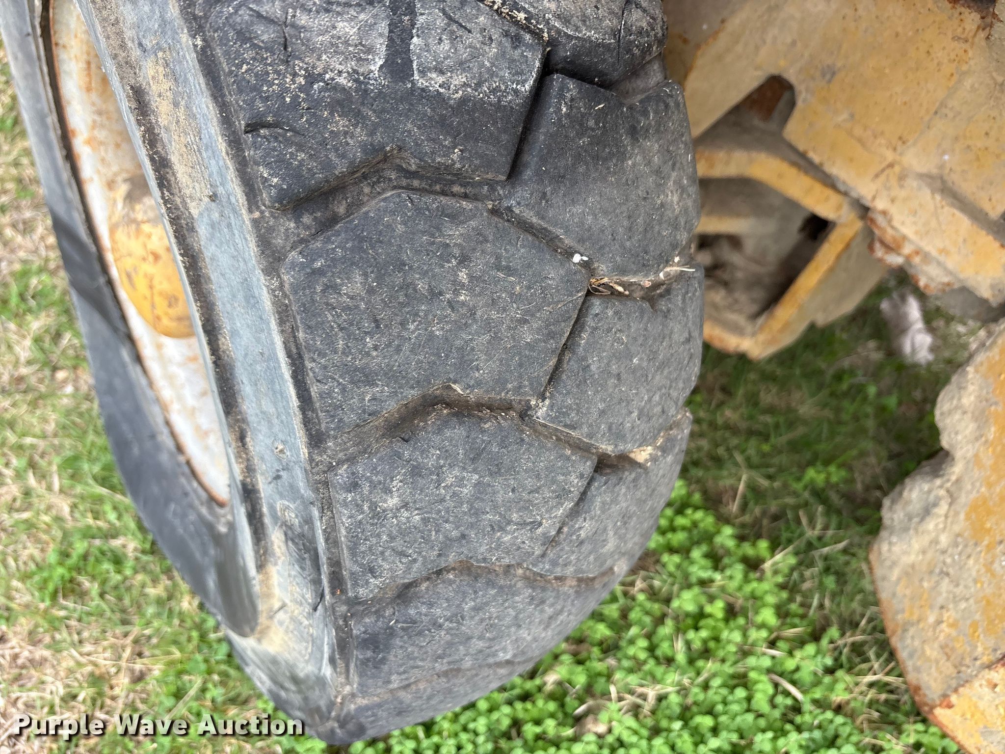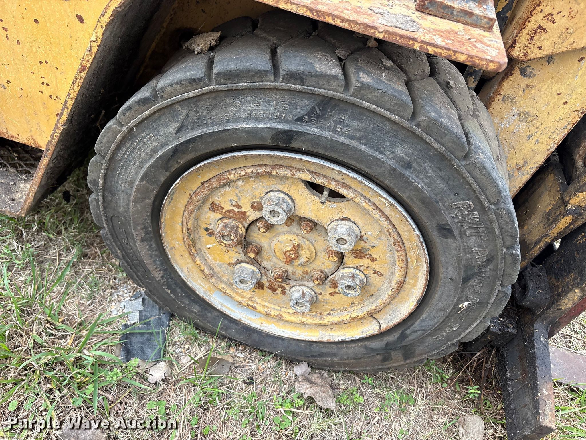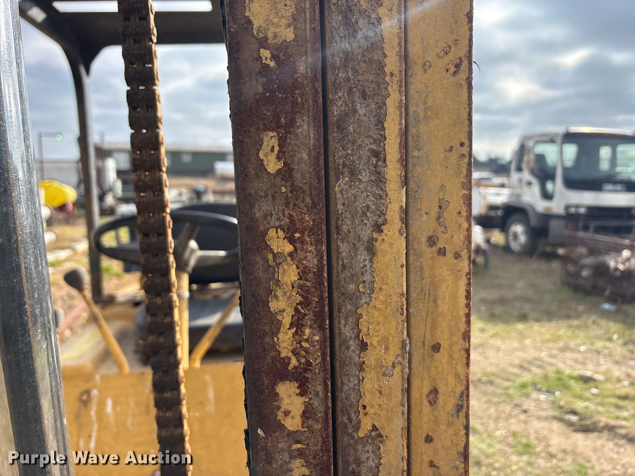 Caterpillar V50C forklift. Hours: 2,552 on meter, Serial: 02Y00725. Engine Caterpillar, Cylinders: 4, Fuel type: LPG LP bottle: Included. Transmission Manual. Operators station OROPS. Features Maximum lift capacity: 500 lbs, Maximum lift height: 159", Collapsed mast height: 38", Mast stages: 3, Side shift, Mast tilt, Fork length: 42". Tires Front: 29x8-15, Rear: 6.50X10. Notes Mast cylinder leaks. Delta Ag, LLC. Ben Franklin, TX 75415