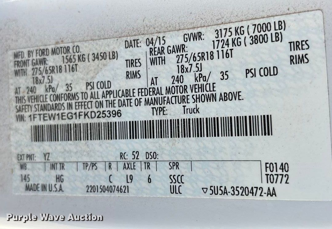 Purple Wave is selling a used 1/2 Ton Pickup or Van in Texas. This item is a 2015 Ford F150 Crew Cab pickup truck with the following: Miles: 155,139 on odometer, Hours: 7,183 on meter, VIN: 1FTEW1EG1FKD25396