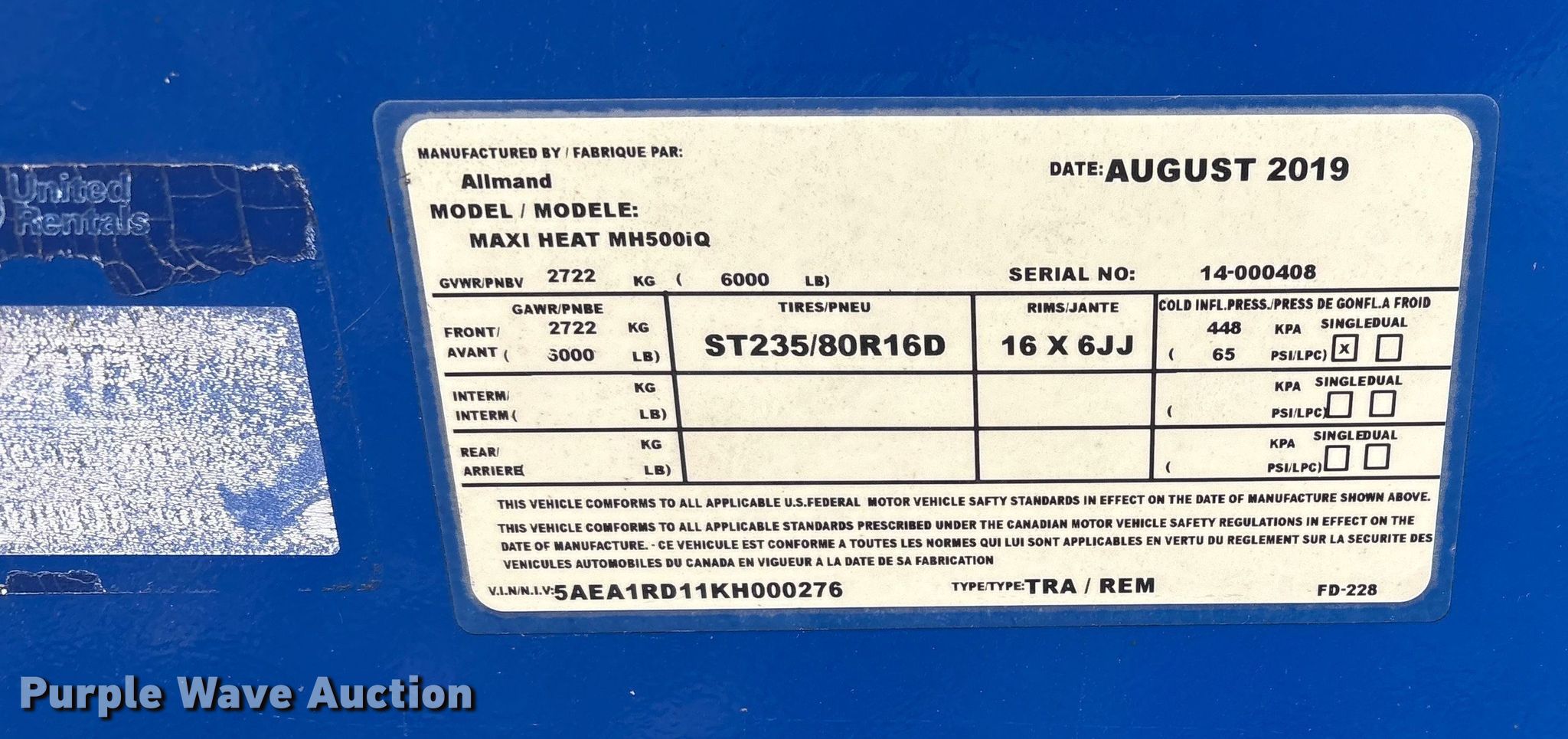 Purple Wave is selling a used Portable Heater or Fan in Oklahoma. This item is a 2019 Allmand Maxi Heat MH500iQ header adapter with the following: Hours: 2,593 on meter, VIN: 5AEA1RD11KH000276, Serial: 14-000408