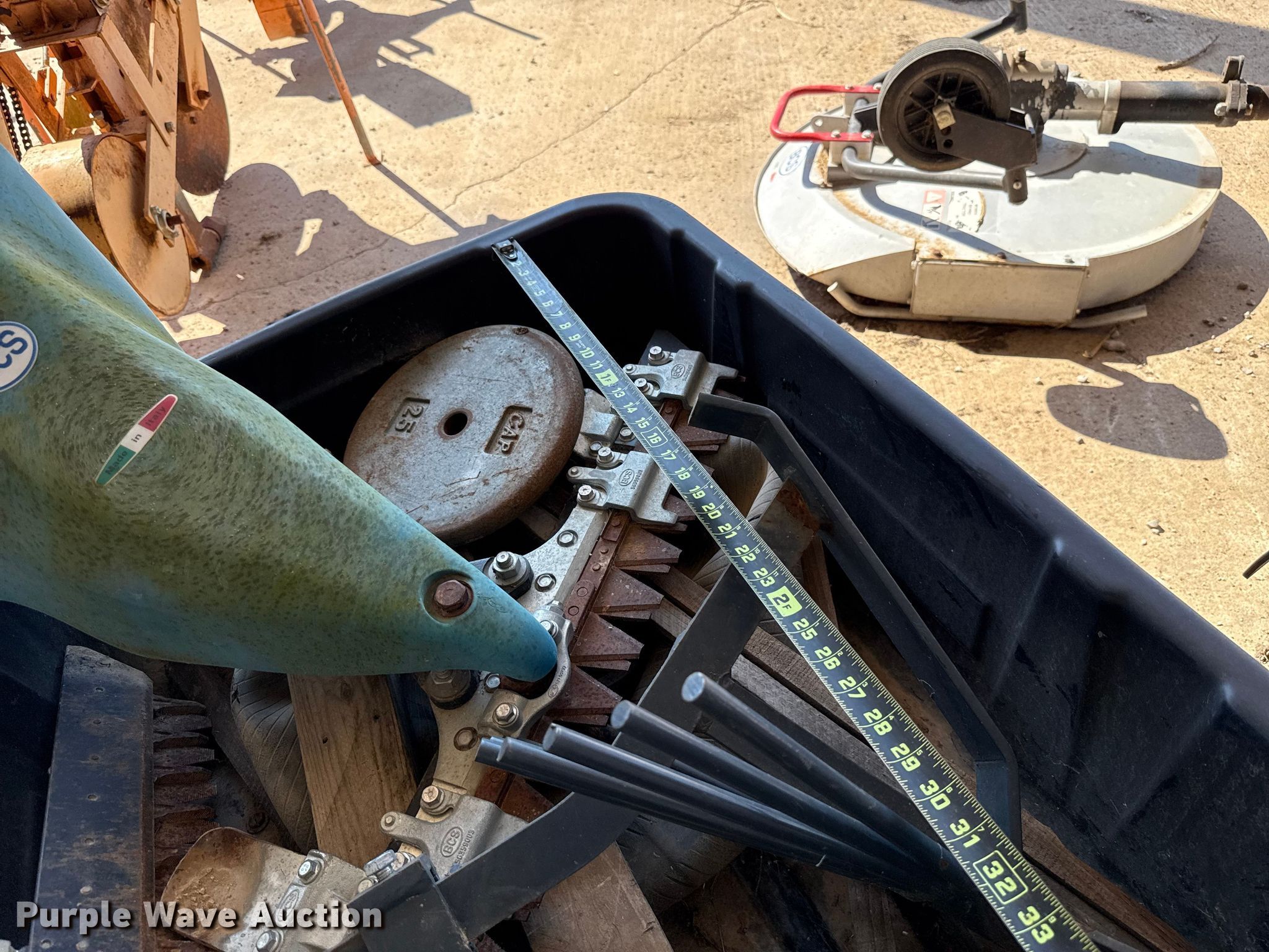 BCS 749 walk-behind tractor. Serial: AA00512618. Features Del Morino 92191229 brush mower Width: 32", Limb mulcher, Del Morino DM100, Berta rear rotary plow, BCS brush mower Width: 30", Grader blade Width: 36", Biagioli ETR-5 chisel Shanks: 5, Width: 21", BSC buddy cart Dump bed, Dump buggy with seat, Sweep plow. Tires Tire size: 6.5/80-12. Noble Research Institute. Ardmore, OK 73401