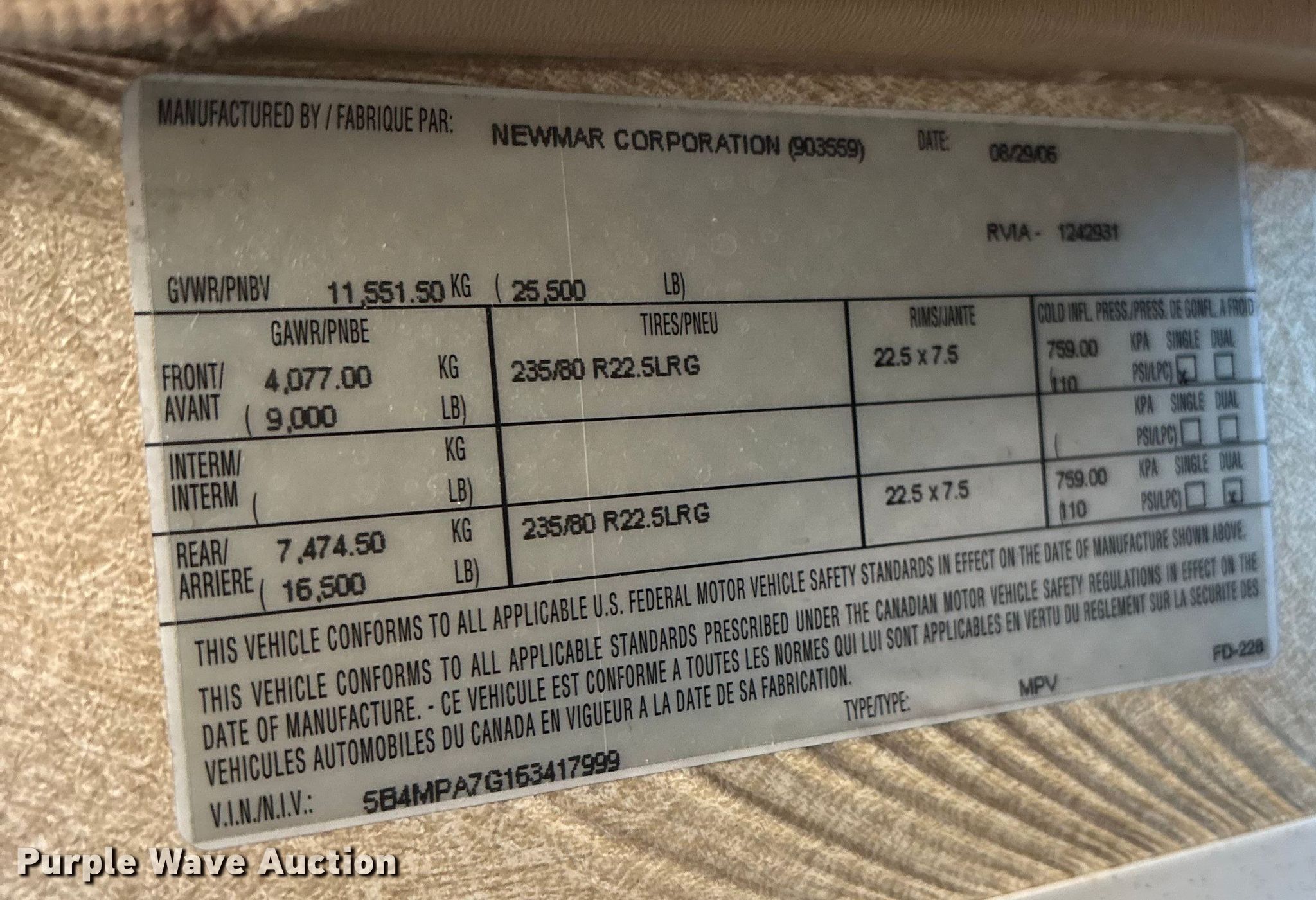 Purple Wave is selling a used RV or Camper in Florida. This item is a 2007 Newmar Mountain Air RV with the following: Miles: 52,341 on odometer, Camper length: 36', VIN: 5B4MPA7G163417999, Unit #: 85853435