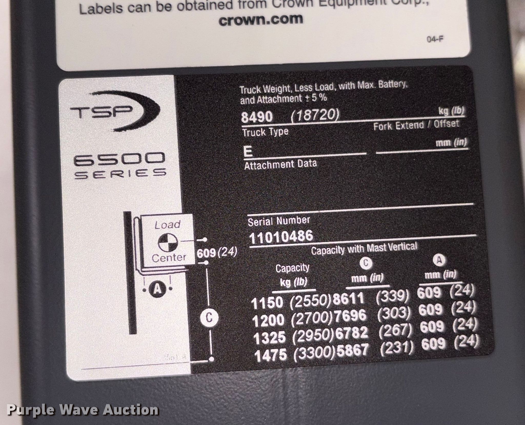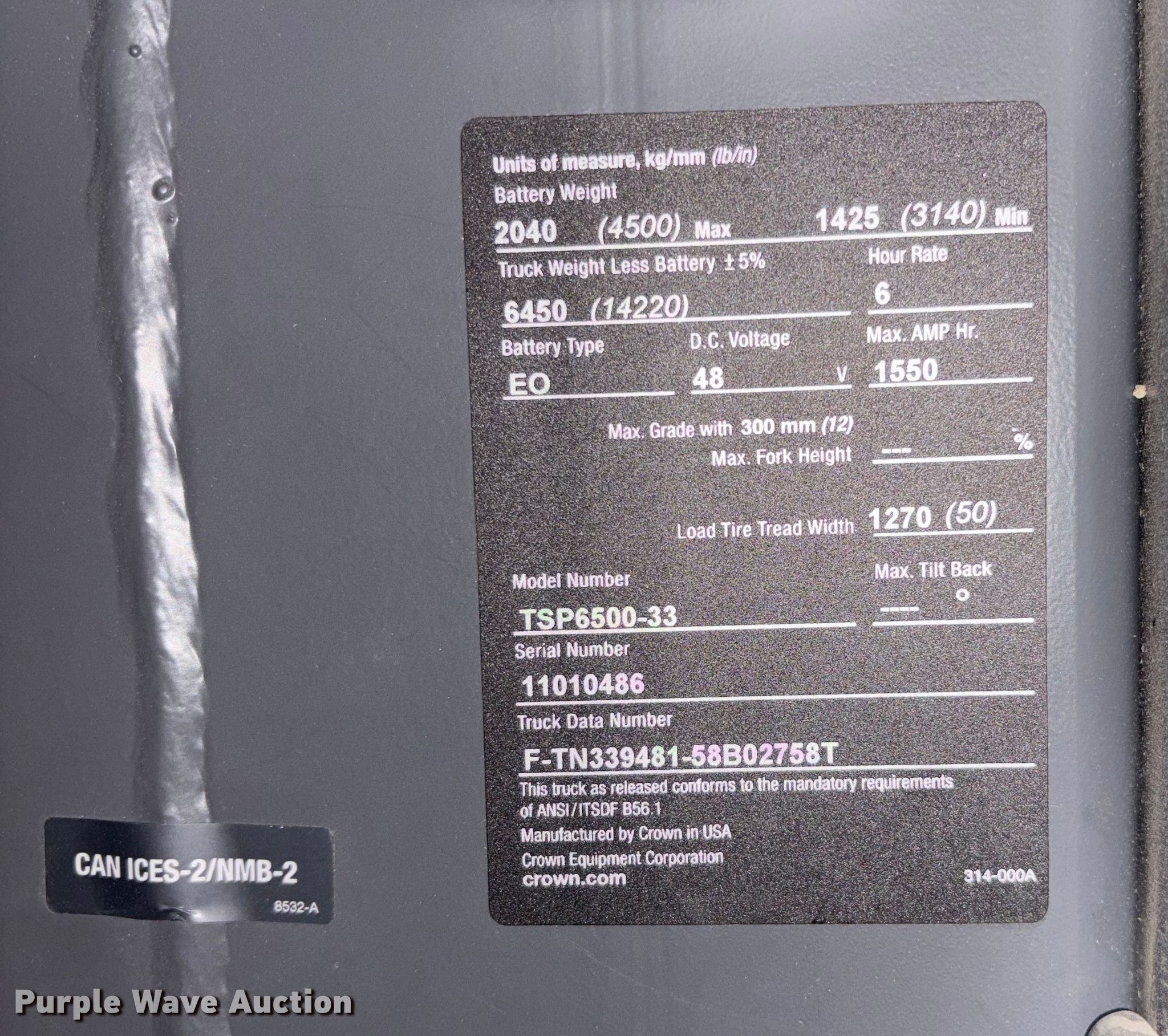 2024 Crown TSP6500-33 order picker. Hours: Unknown, Serial: 11010486, Unit #: 90662085. Electric Motor Volts: 48, Phase: Three, Charger: Three phase. Transmission Electric drive. Operators station OROPS. Features Maximum lift capacity: 3,000 lbs, Maximum lift height: 339", Collapsed mast height: 196", Mast stages: 3, Fork length: 39". Tires Solid, Non-marking. Notes Partially disassembled , Unknown operating condition. Repossessed item, stored at a secured facility. Please review REQUIRED REMOVAL INSTRUCTIONS. Lender Owned. 7320 West 2100 South. Magna, UT 84044