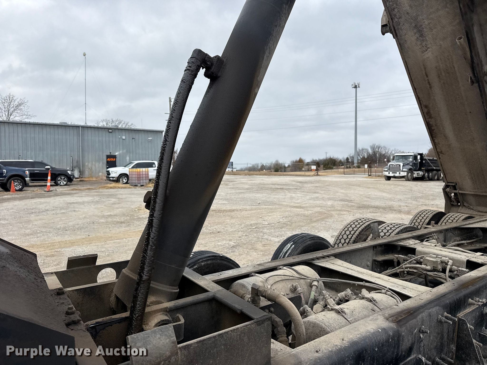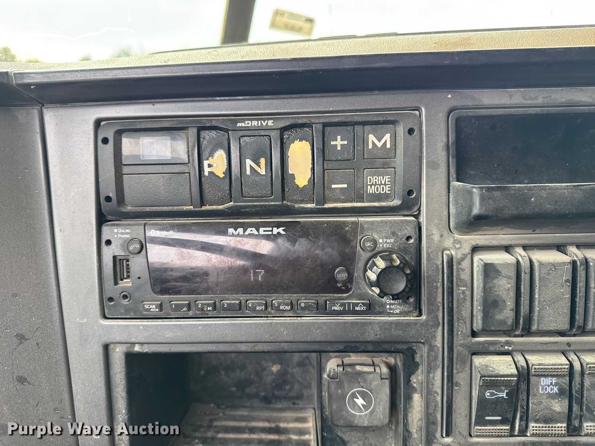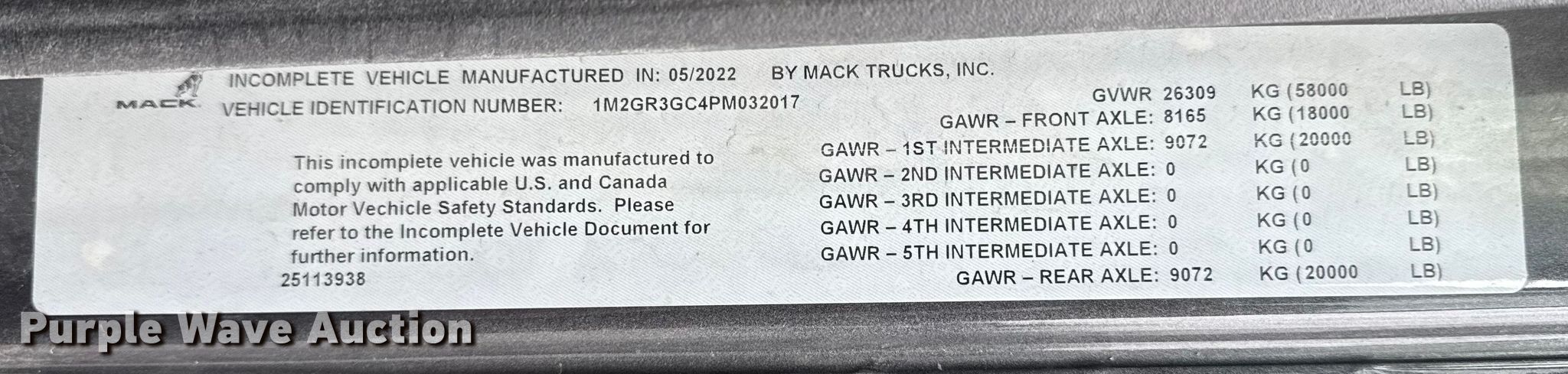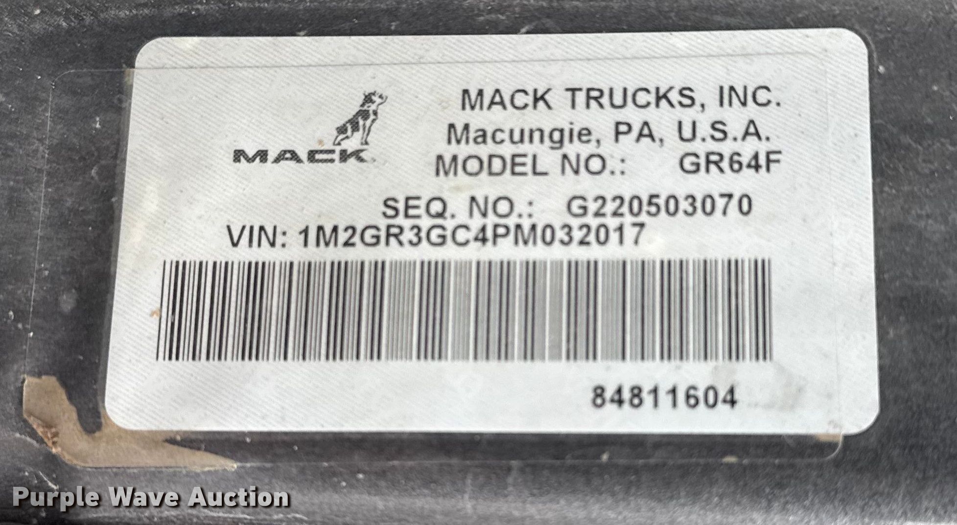 2023 Mack Granite dump truck. Miles: 195,271 on odometer, VIN: 1M2GR3GC4PM032017. Engine Mack MP8, Displacement: 13.0L, Fuel type: Diesel, Engine brake. Transmission Automatic. Chassis Axles: 4, Pusher axle, Differential lock: Inter-axle, Suspension: Spring over walking beam, Brakes: Air, PTO, GVWR: 58,000 lbs FAWR: 18,000 lbs, IAWR: 20,000 lbs, RAWR: 20,000 lbs. Interior AC, Heat, Heated mirrors, Power windows, Cruise control. Features Bed Dump bed, Ox Bodies, Inc. 18FT 17/18YD, Serial: FR220108210055135AL, Length: 18', Width: 96", Side height: 42", Side board height: 6", Bed type: Steel, Roll tarp, Ram: Single, End gate: Air operated. Tires Front: 315/80R22.5, Rear: 11R22.5, Lift axle: 215/75R27.5. Notes Dash warning indicator: Check engine, Traction control, Dash warning indicator: Hill assist, ATC, Windshield chipped or cracked, Tag axle tires damaged. Oklahoma title. Title has a lien that will be released following the close of the auction. Title distribution may be delayed up to 30 days from verification of funds. ARKK Trucking, Inc.. Sand Springs, OK 74063