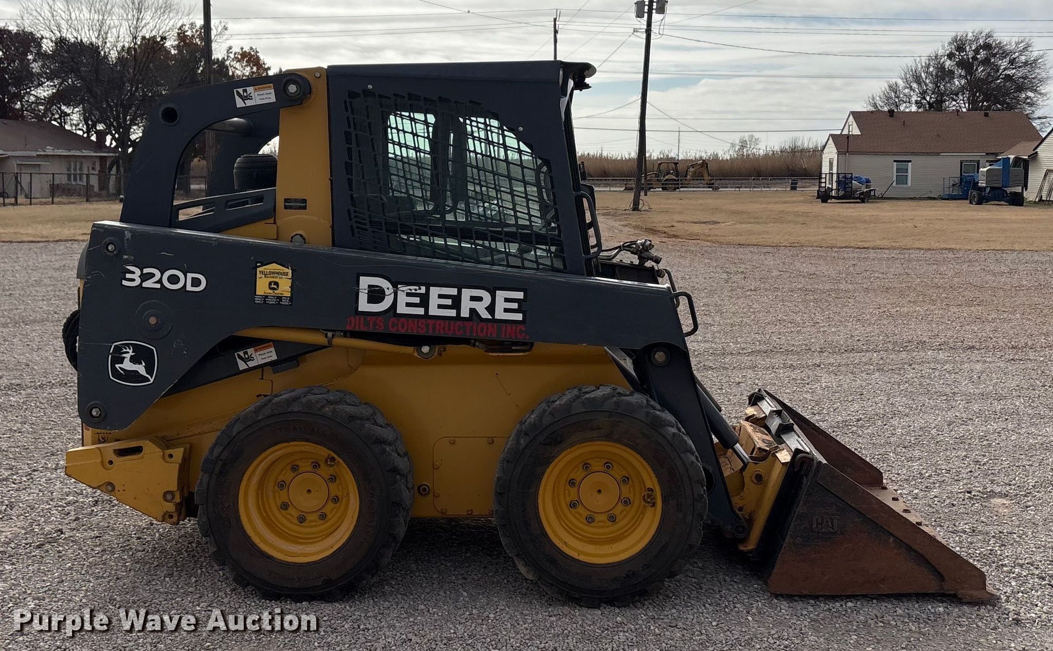 2012 John Deere 320D skid steer loader. Hours: 1,815 on meter, Serial: 1T0320DKPCG220301. Engine Fuel type: Diesel. Transmission Hydrostatic. Operators station Enclosed cab, AC, Heat, Bucket control: Hand, Pattern changer. Features Auxiliary hydraulics, Auxiliary electrical outlet, Quick coupler: Hydraulic, Counter weights, Bucket Width: 62", Cutting edge: Bolt-on. Tires Size: 12X16.5, Brand: Hercules. Dilts Construction. Wichita Falls, TX 76305