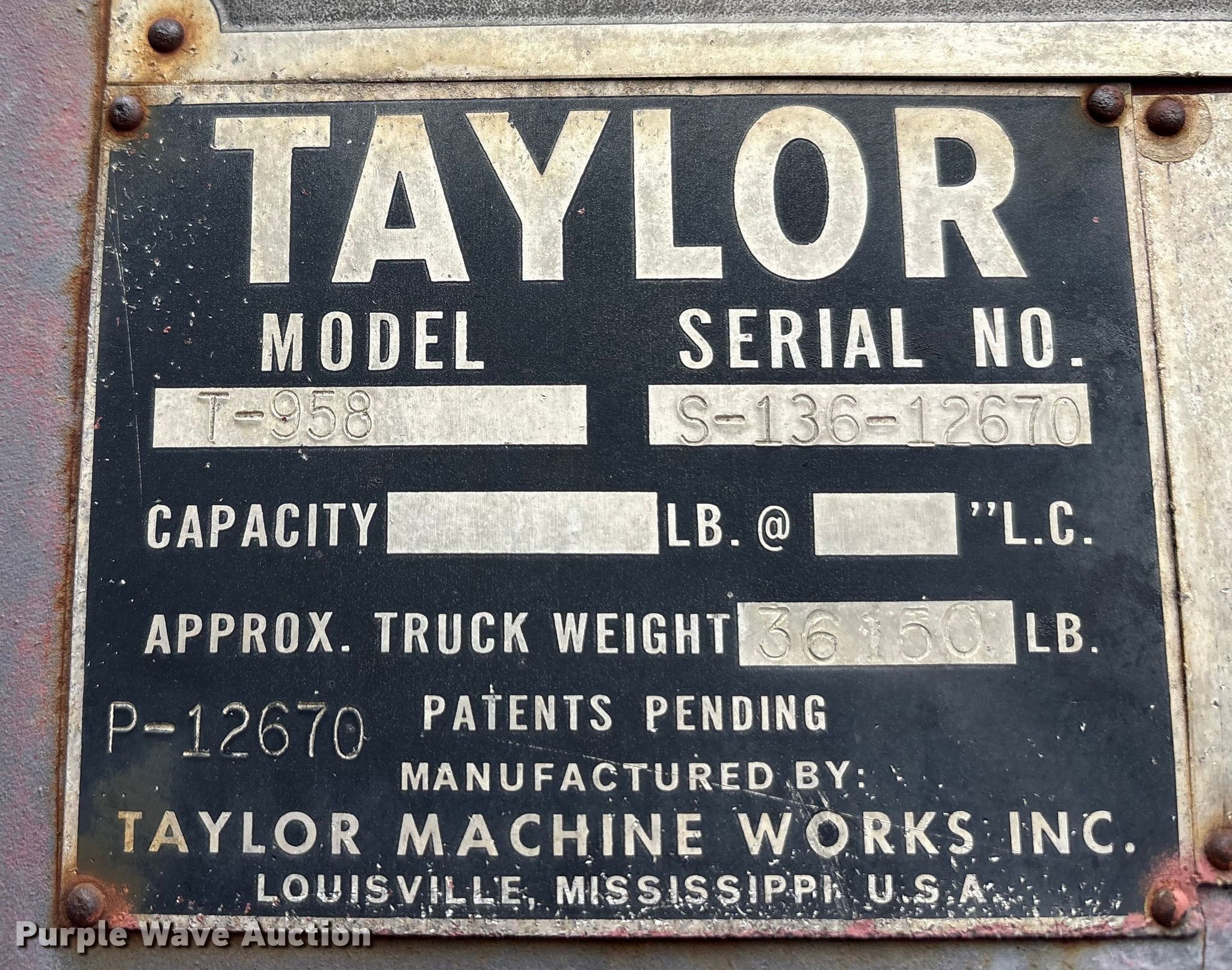 1977 Taylor T-958 wheel loader. Serial: S13612670. Engine Detroit Diesel, Cylinders: 6, Fuel type: Diesel. Transmission Powershift, 4F - 4R. Operators station Enclosed cab, Heat, Bucket controls: Two-lever. Features Bucket Width: 100". Tires Size: 20.5-25. Notes Possible engine issues, turns over but will not start , Non-operational unit. Delta Ag, LLC. Ben Franklin, TX 75415