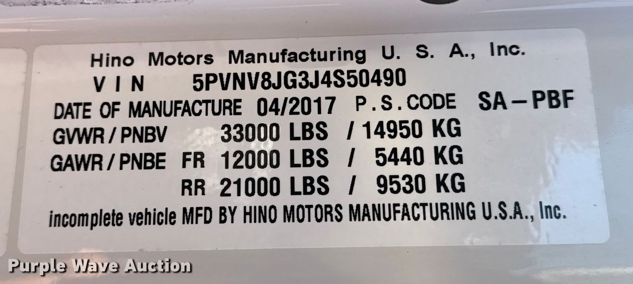 2018 Hino 338 tank truck. Miles: 10,838 on odometer, VIN: 5PVNV8JG3J4S50490. Engine Hino Motors, Ltd, Displacement: 7.6L, Cylinders: 6, Fuel type: Diesel. Transmission Automatic. Chassis Axles: Single, Suspension: Spring, Brakes: Air, PTO, GVWR: 33,000 lbs. Interior AC, Heat, Power windows, Cruise control. Features Bed Tank bed Capacity: 2000 gallons, Length: 9', Width: 96", Height: 53", Spray bar: Front, Rear, Side discharge, Hose reel, Top fill, Rear drain: 3". Tires Size: 11R22.5. Oklahoma title. Seller is an Oklahoma licensed motor vehicle dealer. Buyers may be required to provide identification to the licensed dealer to comply with state laws. Title will be assigned and distributed by the dealer. Please contact the seller for distribution questions. Title distribution may be delayed up to 30 days from verification of funds. Collinsville, OK 74021