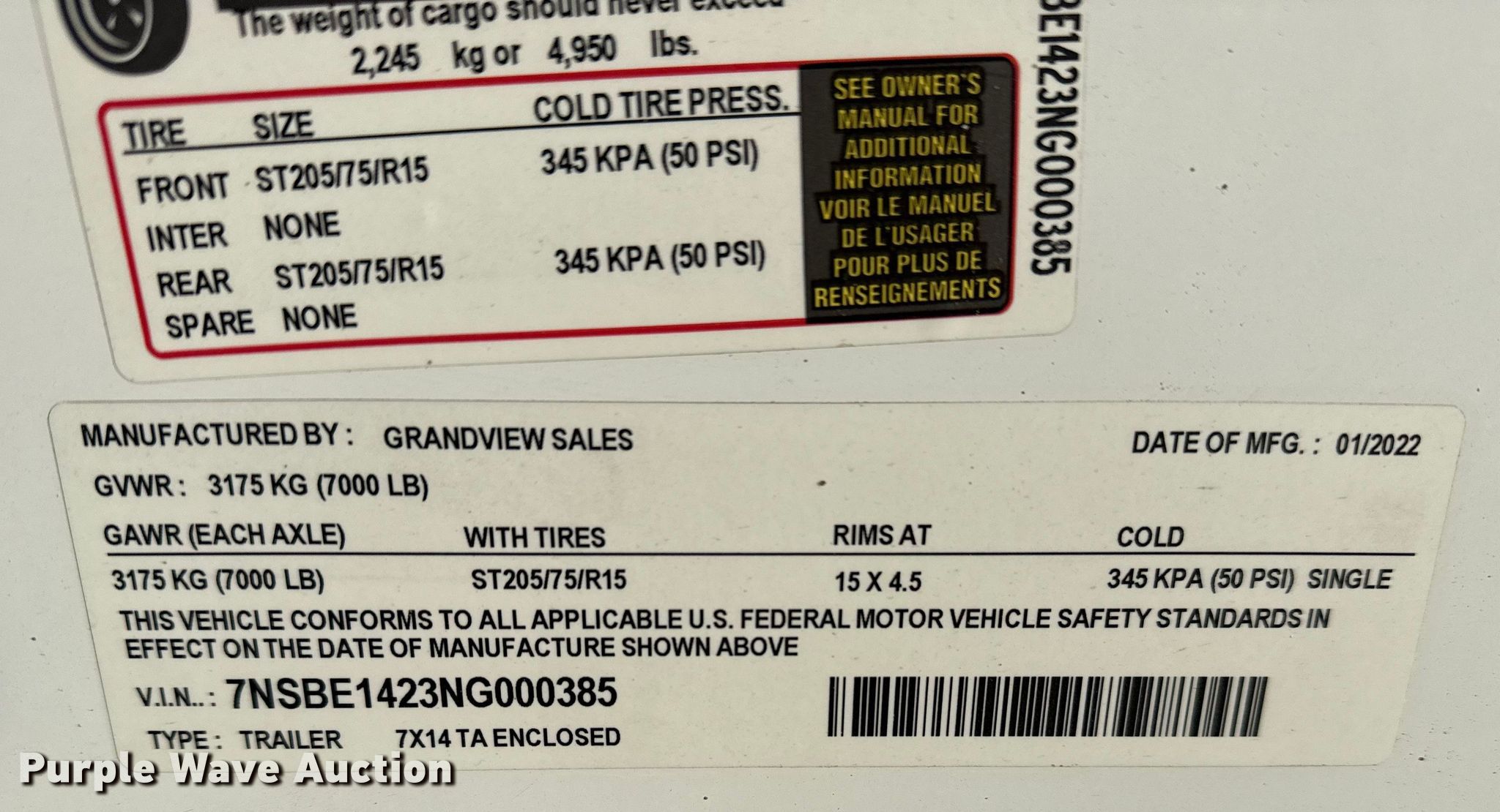 Purple Wave is selling a used Enclosed Cargo Trailer in Oklahoma. This item is a 2022 Grandview Sales 7X14 TA Enclosed enclosed cargo trailer with the following: VIN: 7MSBE1423NG000385