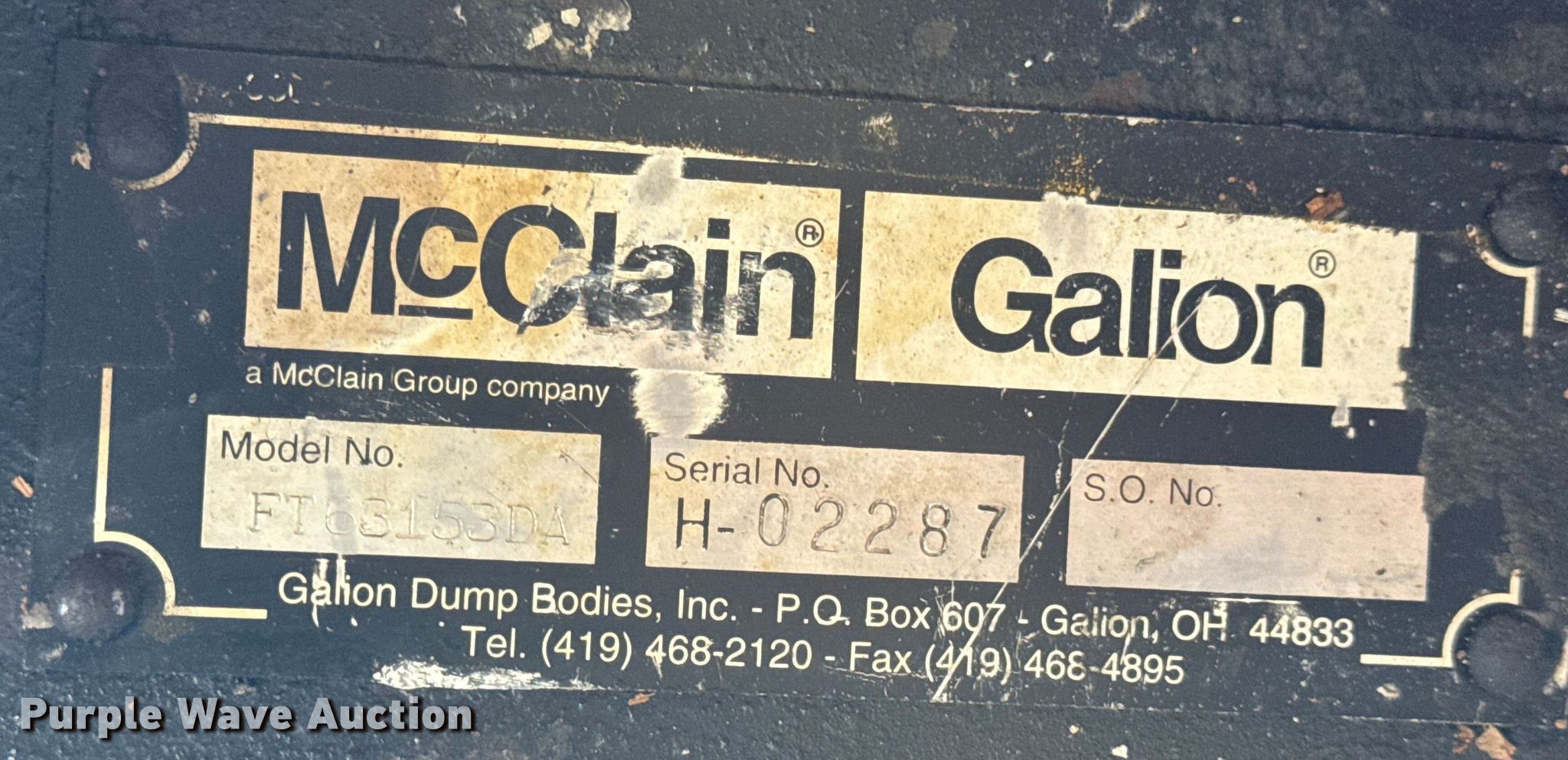Purple Wave is selling a used Truck Part and Attach. in Missouri. This item is a McClain Galion FT63153DA hoist with the following: Serial: H-02287