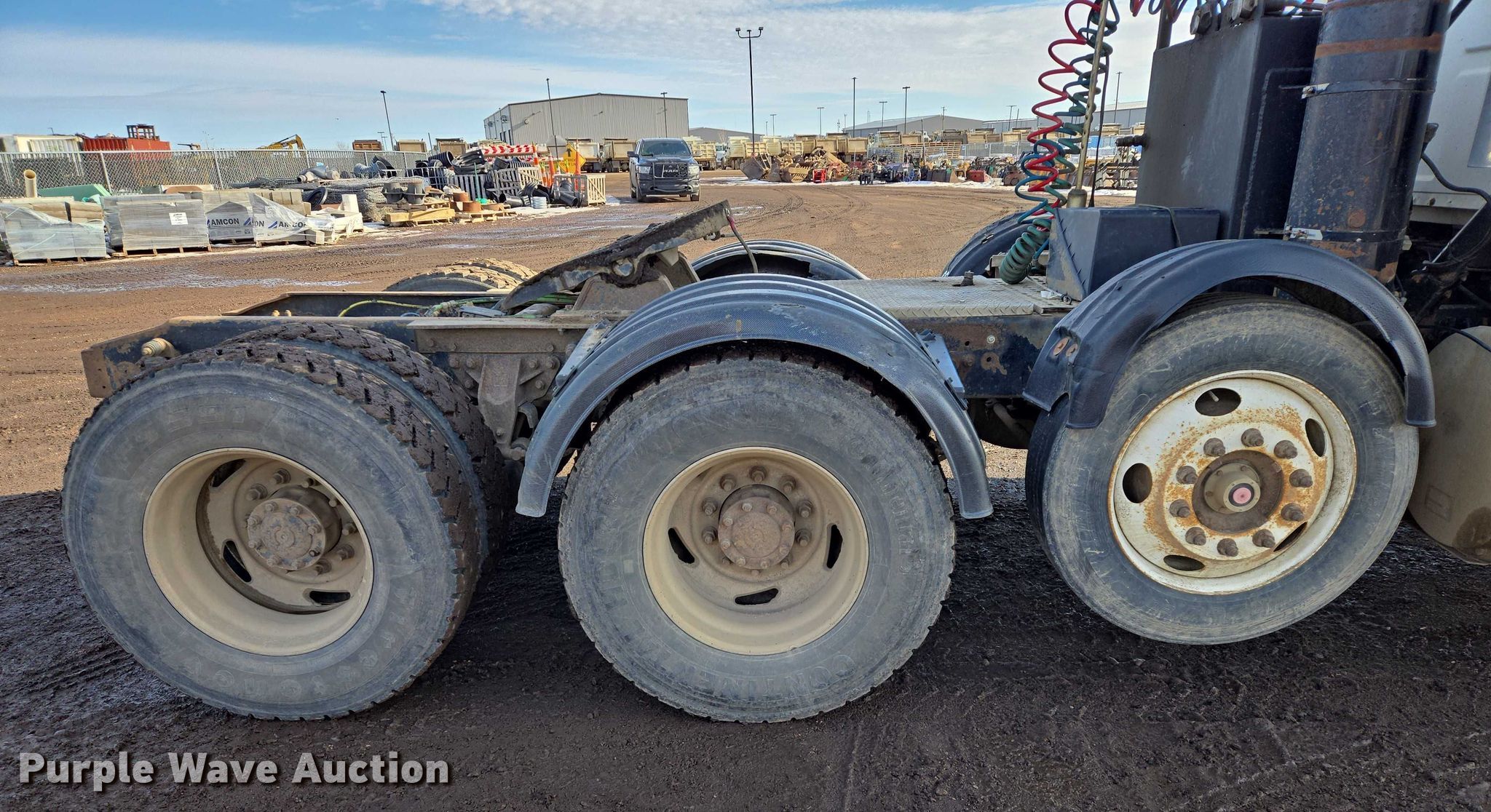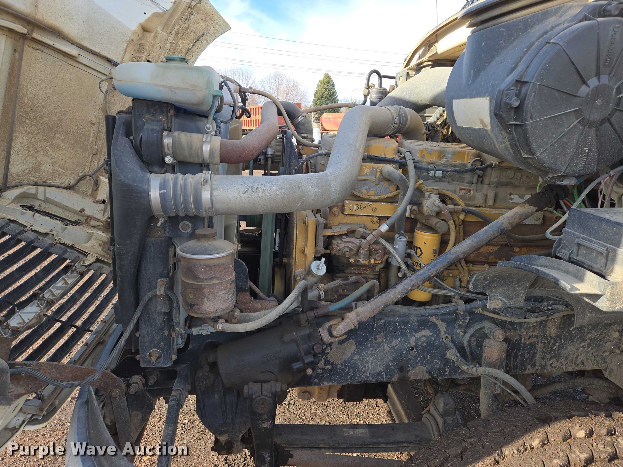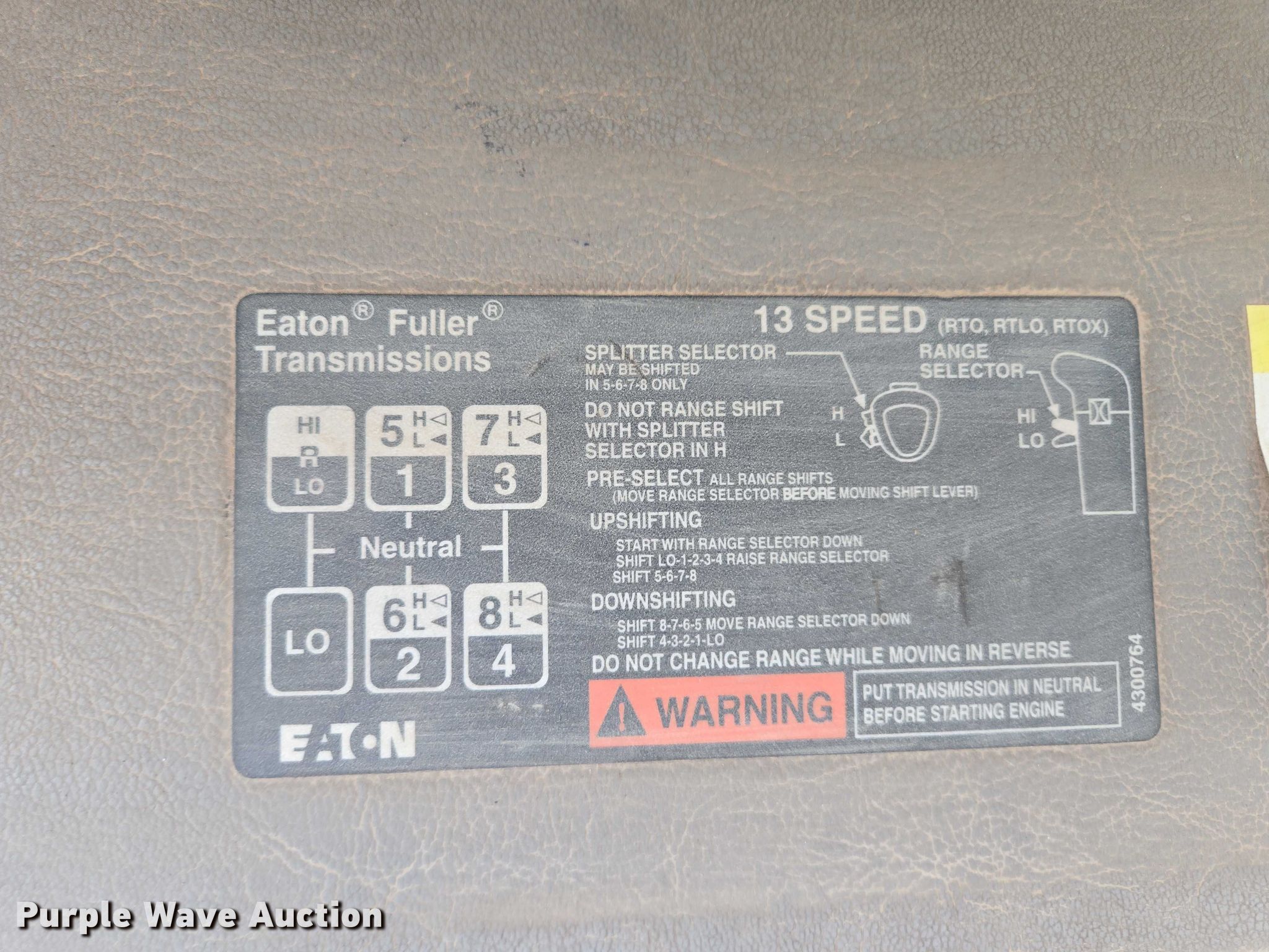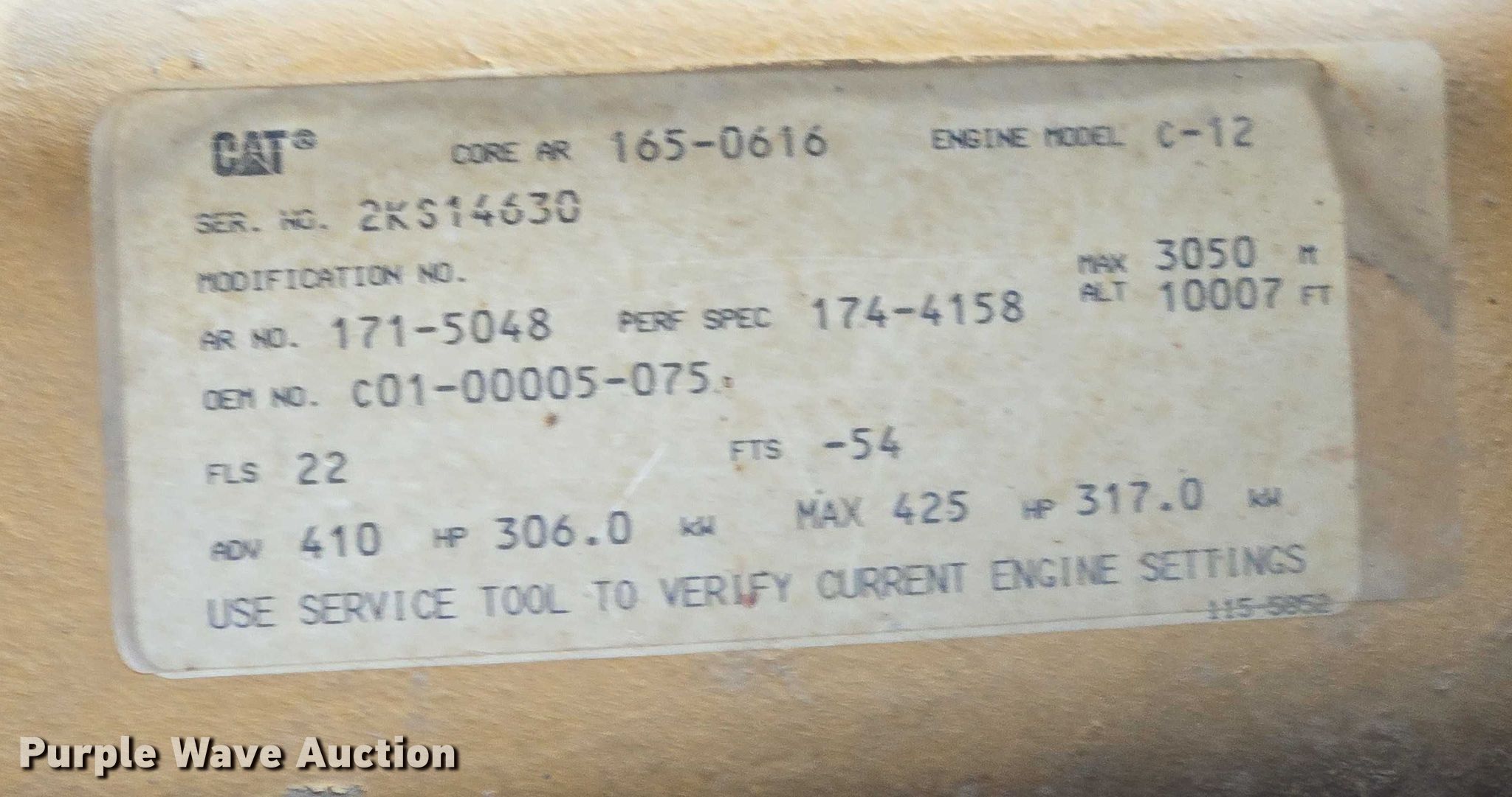 2000 Sterling A9522 semi truck. Miles: 586,552 on odometer, Hours: 30,362 on meter, VIN: 2FWYGWEB7YAB43686, Unit #: 11S. Engine Caterpillar C12, Displacement: 12.0L, Cylinders: 6, Fuel type: Diesel, HP: 408, Engine brake. Transmission Eaton Fuller, Manual, Speed: 13. Chassis Axles: Triple, Pusher axle Steerable, Differential lock: Inter-axle, Suspension: Air Dump valves, Brakes: Air, PTO, Wet kit. Interior AC, Heat, Heated mirrors, Power windows, Cruise control, Air ride cab. Features Deck plate: Aluminum, Fifth wheel type: Fixed, Fuel tank: Dual. Tires Size: 11R22.5, Lift axle: 255/70R22 5. Notes Windshield chipped or cracked. South Dakota title. Title distribution may be delayed up to 14 days from verification of funds. Soukup Construction Inc.. Sioux Falls, SD 57107