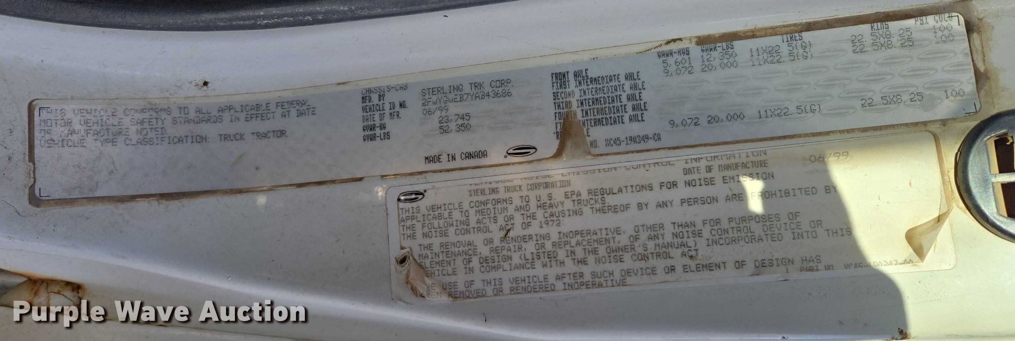 Purple Wave is selling a used Truck Tractor in South Dakota. This item is a 2000 Sterling A9522 semi truck with the following: Miles: 586,552 on odometer, Hours: 30,362 on meter, VIN: 2FWYGWEB7YAB43686, Unit #: 11S