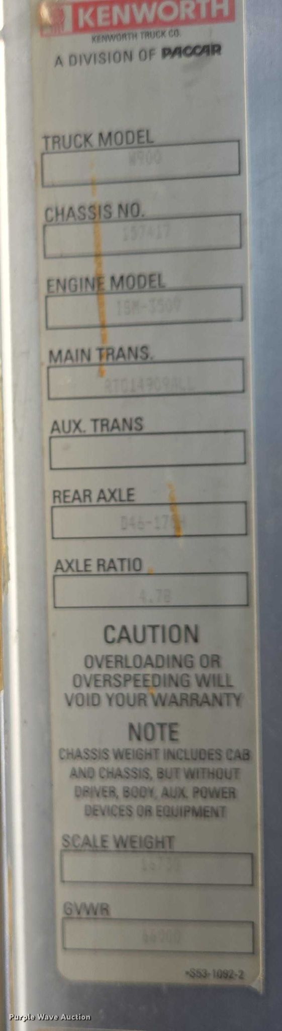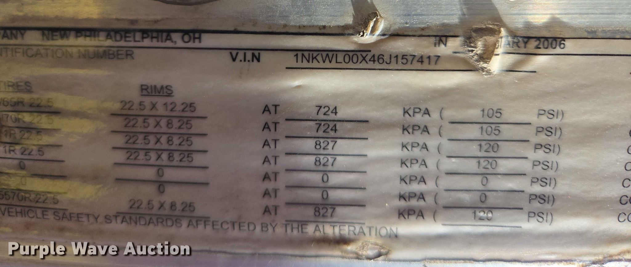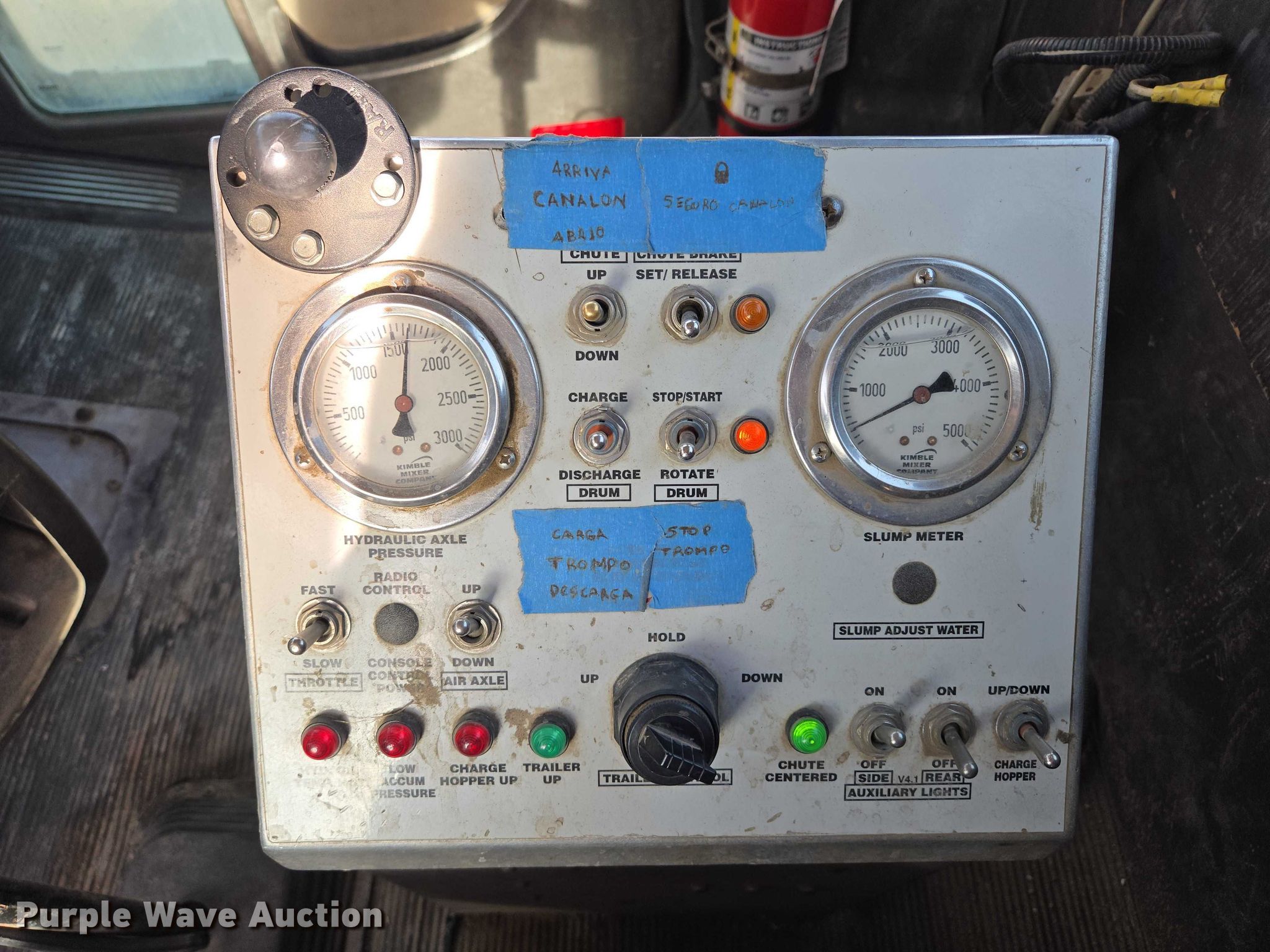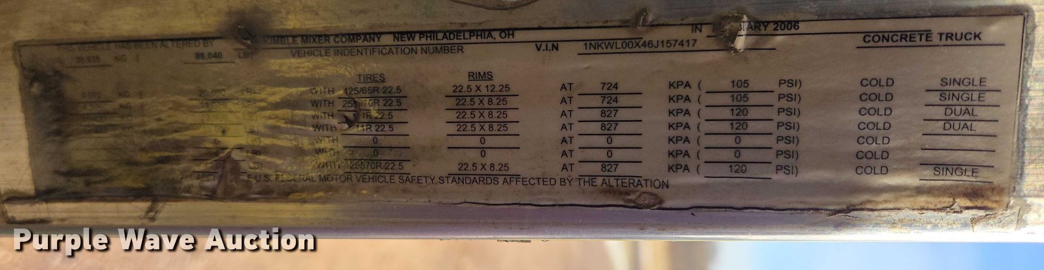 2006 Kenworth W900 ready mix truck. Miles: 220,877 on odometer, Hours: 26,766 on meter, VIN: 1NKWL00X46J157417. Engine Cummins ISM, Displacement: 11.0L, Cylinders: 6, Fuel type: Diesel, HP: 280. Transmission Eaton Fuller 9LL, Manual, Speed: 11. Chassis Axles: 4, Pusher axle Steerable, Tag axle Steerable, Differential lock: Full, Suspension: Spring over walking beam, Brakes: Air, PTO. Interior AC, Heat, Cruise control, Backup camera. Features Mixer Kimble Mixer Company K-2000, Serial: K211HD332, Capacity: 11 cu.yd., Discharge: Rear, In-cab controls, Rear drum controls, Water tank capacity: 150 gallons, Chute Extensions: 3, Chute type: Steel.. Tires Front: 425/65R22.5, Rear: 11R22.5, Lift axle: 255/70R22.5. Notes Dash warning indicator: Check engine. South Dakota title. Title distribution may be delayed up to 14 days from verification of funds. Crooks, SD 57020