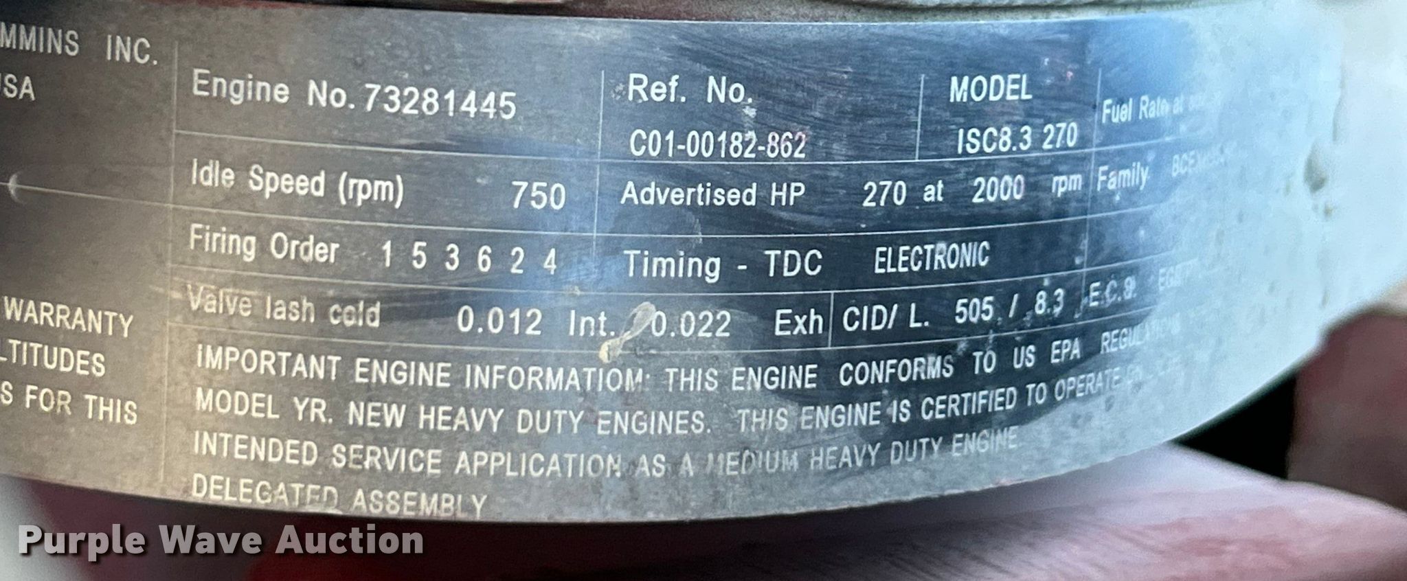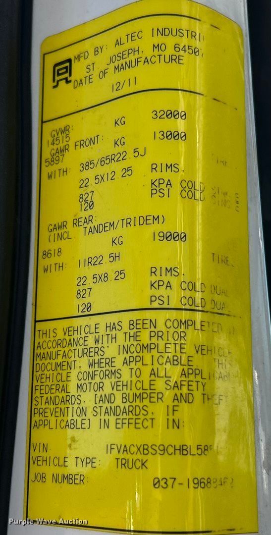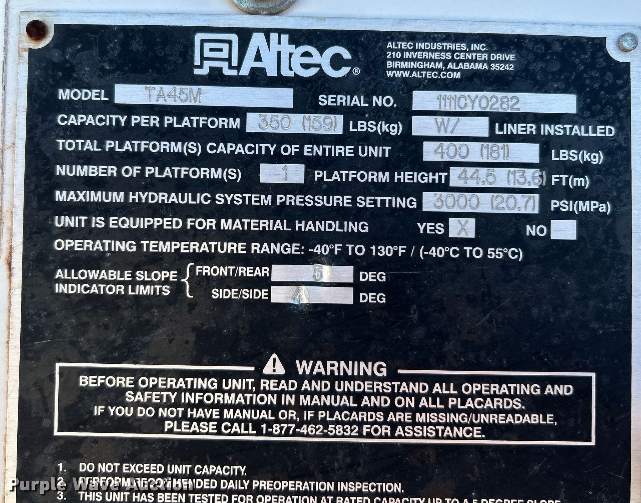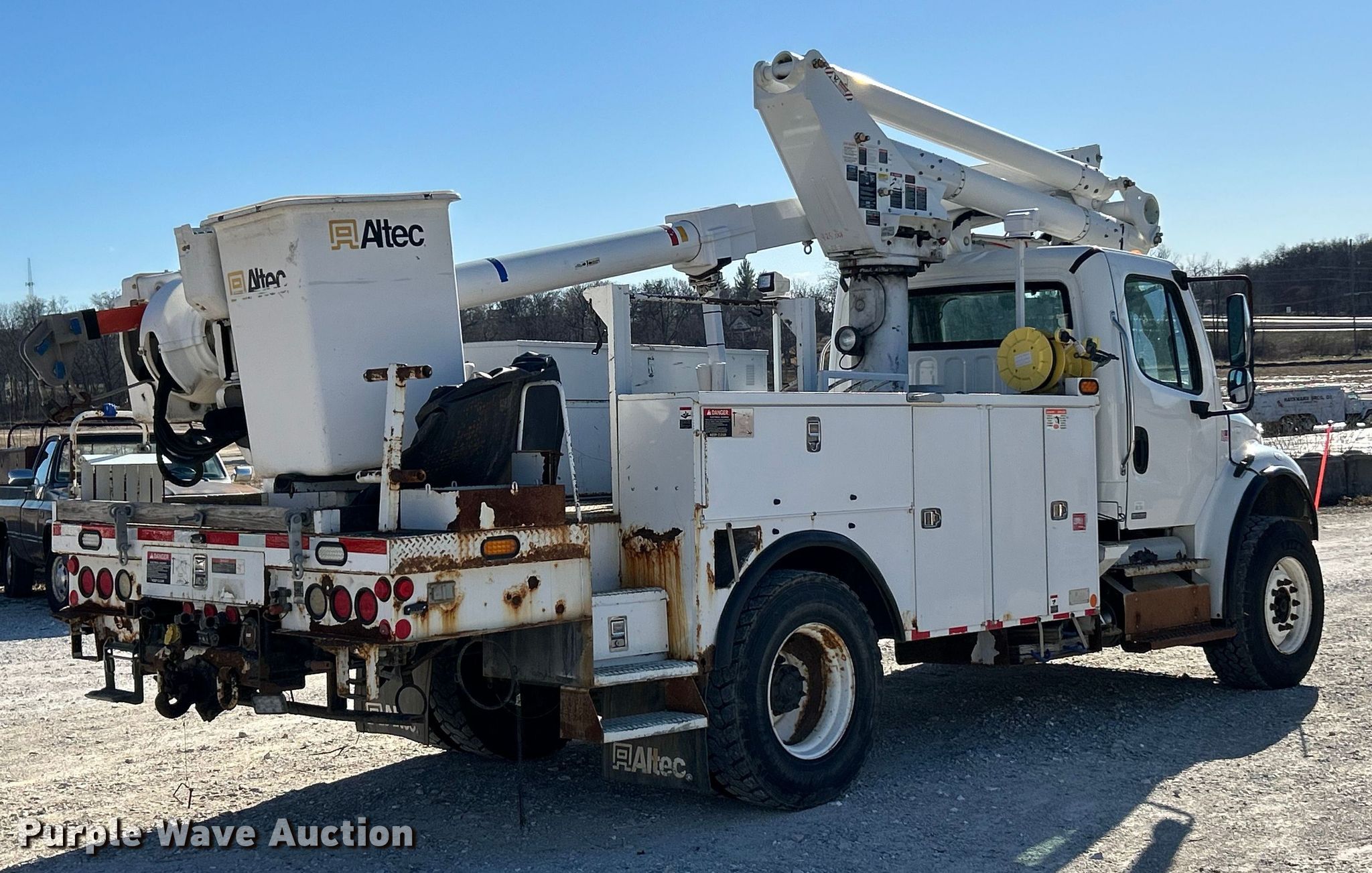 2012 Freightliner Business Class M2 bucket truck. Miles: 137,929 on odometer, Hours: 2,596 on meter, VIN: 1FVACXBS9CHBL5851. Engine Cummins ISC, Serial: 73281445, Displacement: 8.3L, Cylinders: 6, Fuel type: Diesel, HP: 270. Transmission Allison, Automatic. Chassis Axles: Single, Suspension: Spring, Brakes: Air, PTO, GVWR: 32,000 lbs. Interior AC, Heat, Cruise control, Backup camera. Features Bed Utility bed, Altec, Length: 12', Width: 94", Boom Altec TA45M, Serial: 1111CY0282, Mast height: 44.5', Maximum lift capacity: 400 lbs, Boom type: Articulating, Insulated, Telescopic, Man basket, Boom controls Ground, Platform/ basket, Material handler. Tires Front: 385/65R22.5, Rear: 11R22.5. Missouri title. Seller is a Missouri licensed motor vehicle dealer. The buyer may be required to pay sales tax and/or registration fees to the dealer prior to taking possession. Buyers may be required to provide identification to the licensed dealer to comply with state laws. Title will be assigned and distributed by the dealer. Please contact the seller for distribution questions. Title distribution may be delayed up to 30 days from verification of funds. Northpoint Enterprises, LLC. Troy, MO 63379