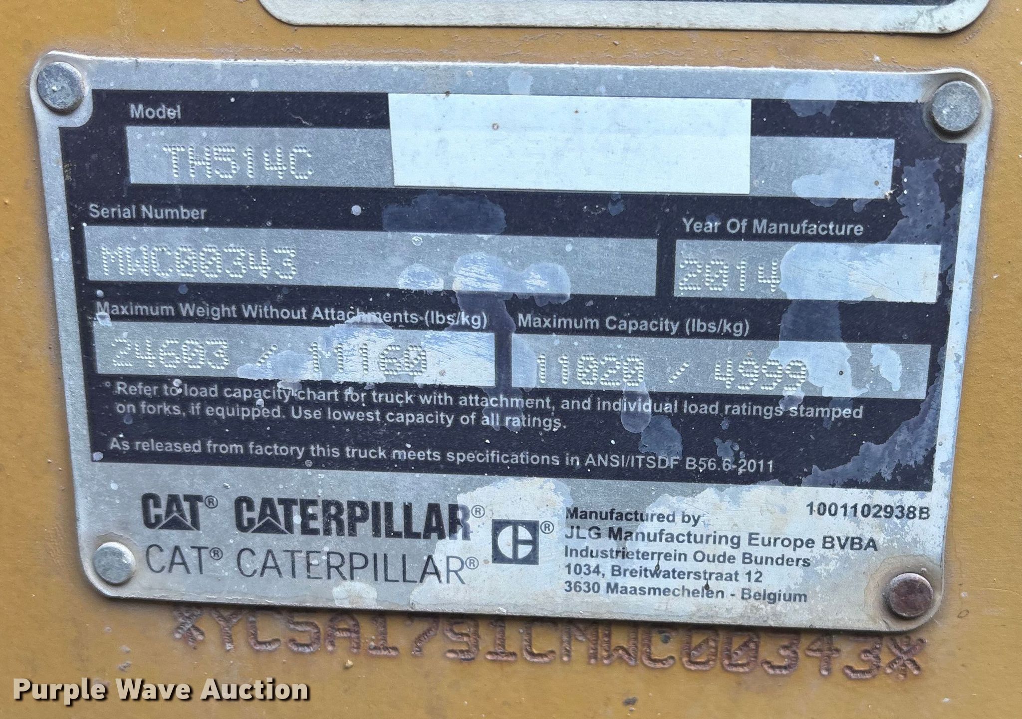 Purple Wave is selling a used Telehandler in Nebraska. This item is a 2014 Caterpillar TH514C telehandler with the following: Hours: 4,948 on meter, Serial: MWC00343