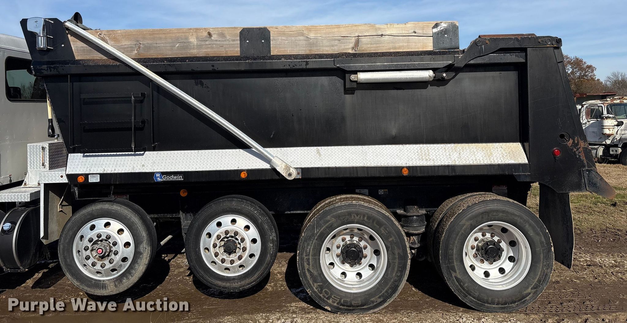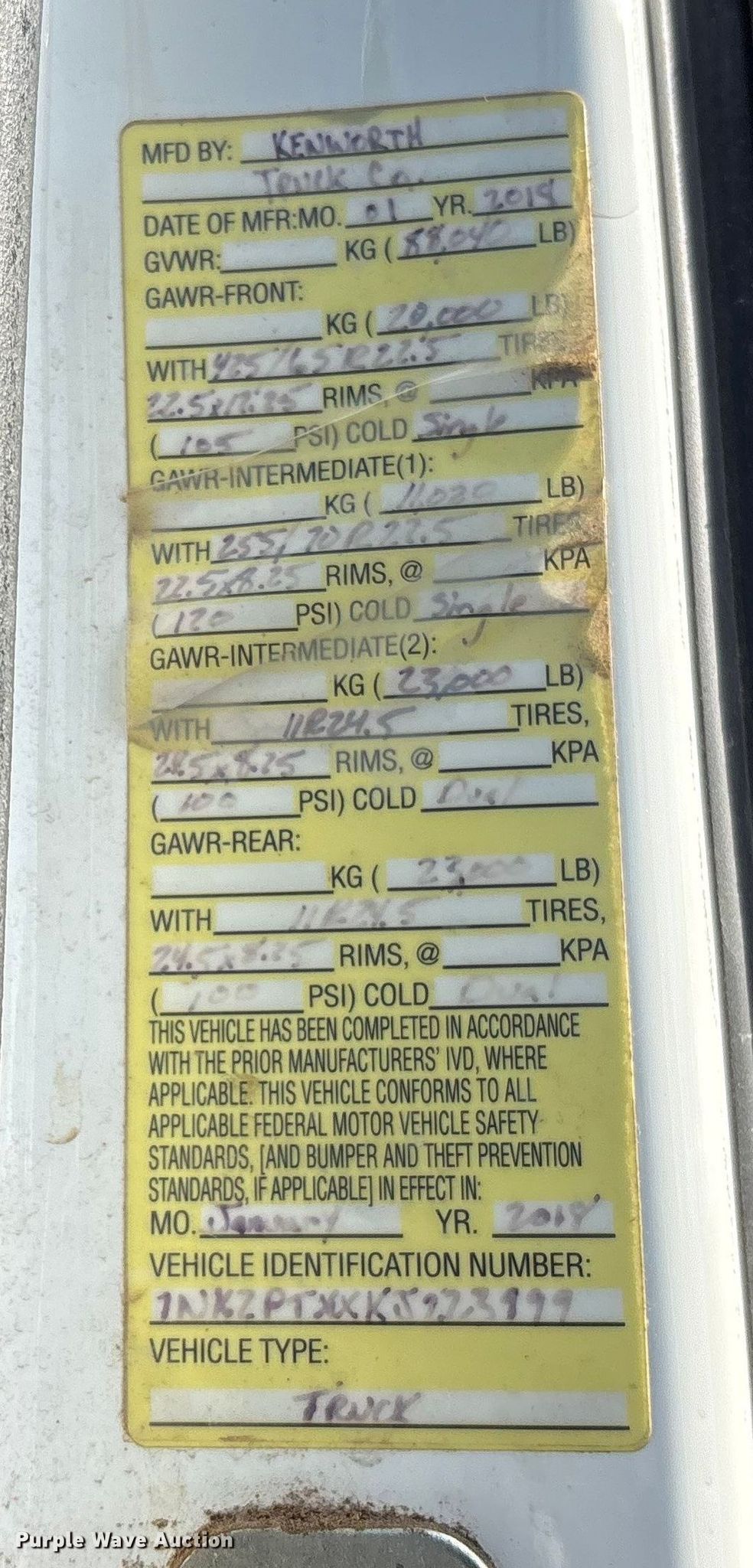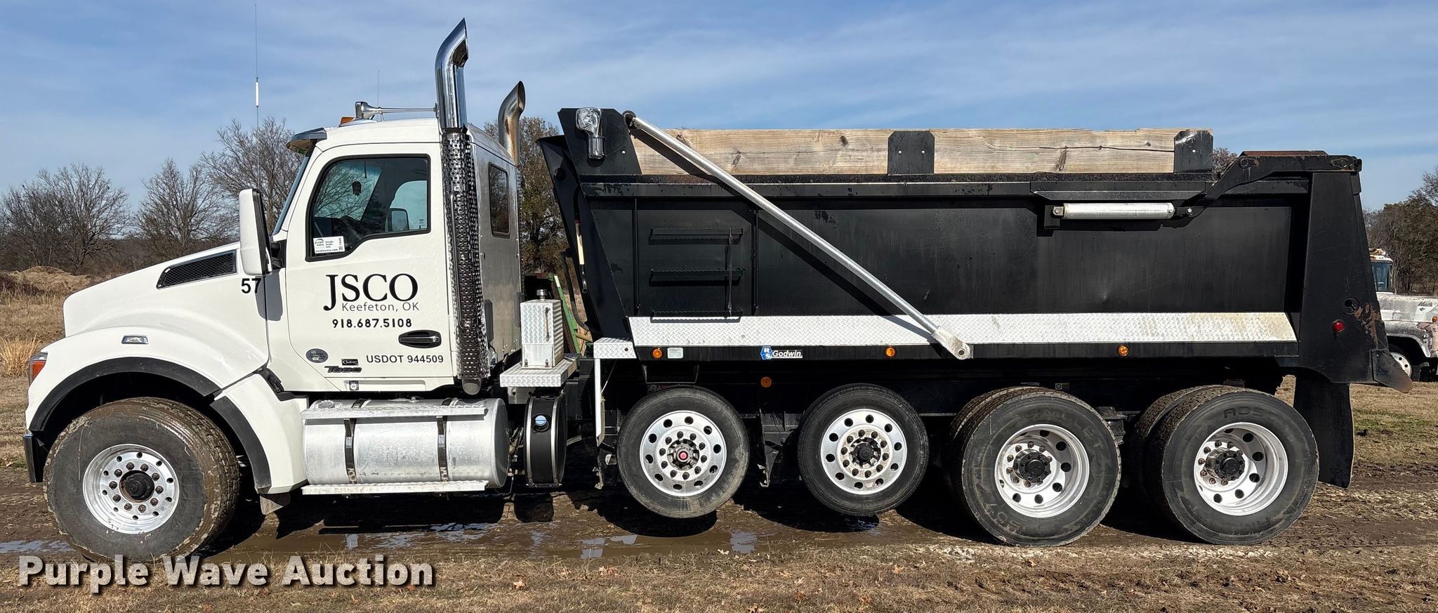 2019 Kenworth T880 dump truck. Miles: 248,612 on odometer, VIN: 1NKZXPTXXKJ223999. Engine Paccar MX-13, Displacement: 12.9L, Cylinders: 6, Fuel type: Diesel. Transmission Automatic. Chassis Axles: 4, Pusher axle, Brakes: Air, GVWR: 88,040 lbs FAWR: 20,000 lbs, IAWR: 23,000 lbs, RAWR: 23,000 lbs, Lift axle GAWR: 11,020 lbs. Interior AC, Heat, Heated mirrors, Power windows, Cruise control. Features Bed Dump flatbed, R/S Godwin, Serial: 0040554, Length: 18', Width: 96", Side height: 48", Side board height: 12", Bed type: Steel, Ram: Single, End gate: Air operated. Tires Front: 425/65R22.5, Rear: 11R24.5, Lift axle: 255/70R22.5. Notes Windshield chipped or cracked. Oklahoma title. Title has a lien that will be released following the close of the auction. Title distribution may be delayed up to 30 days from verification of funds. J&S Dozer Svc. Muskogee, OK 74403
