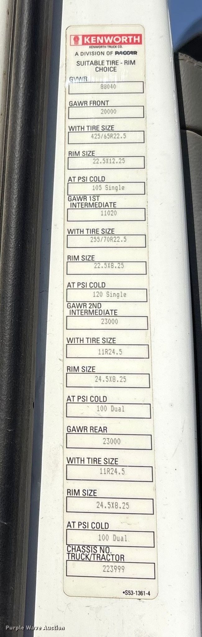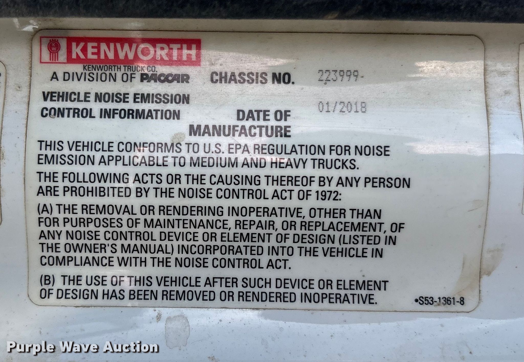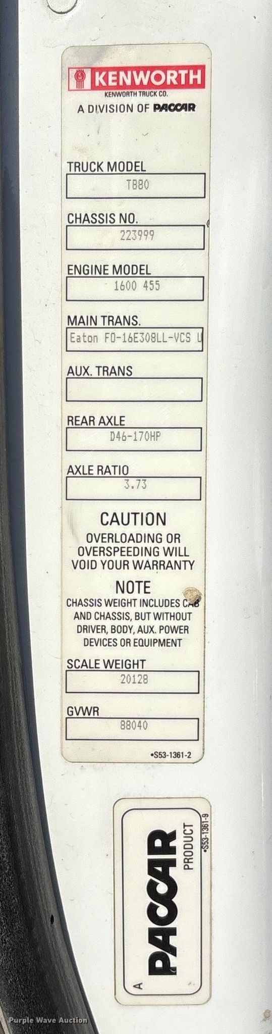 2019 Kenworth T880 dump truck. Miles: 248,612 on odometer, VIN: 1NKZXPTXXKJ223999. Engine Paccar MX-13, Displacement: 12.9L, Cylinders: 6, Fuel type: Diesel. Transmission Automatic. Chassis Axles: 4, Pusher axle, Brakes: Air, GVWR: 88,040 lbs FAWR: 20,000 lbs, IAWR: 23,000 lbs, RAWR: 23,000 lbs, Lift axle GAWR: 11,020 lbs. Interior AC, Heat, Heated mirrors, Power windows, Cruise control. Features Bed Dump flatbed, R/S Godwin, Serial: 0040554, Length: 18', Width: 96", Side height: 48", Side board height: 12", Bed type: Steel, Ram: Single, End gate: Air operated. Tires Front: 425/65R22.5, Rear: 11R24.5, Lift axle: 255/70R22.5. Notes Windshield chipped or cracked. Oklahoma title. Title has a lien that will be released following the close of the auction. Title distribution may be delayed up to 30 days from verification of funds. J&S Dozer Svc. Muskogee, OK 74403