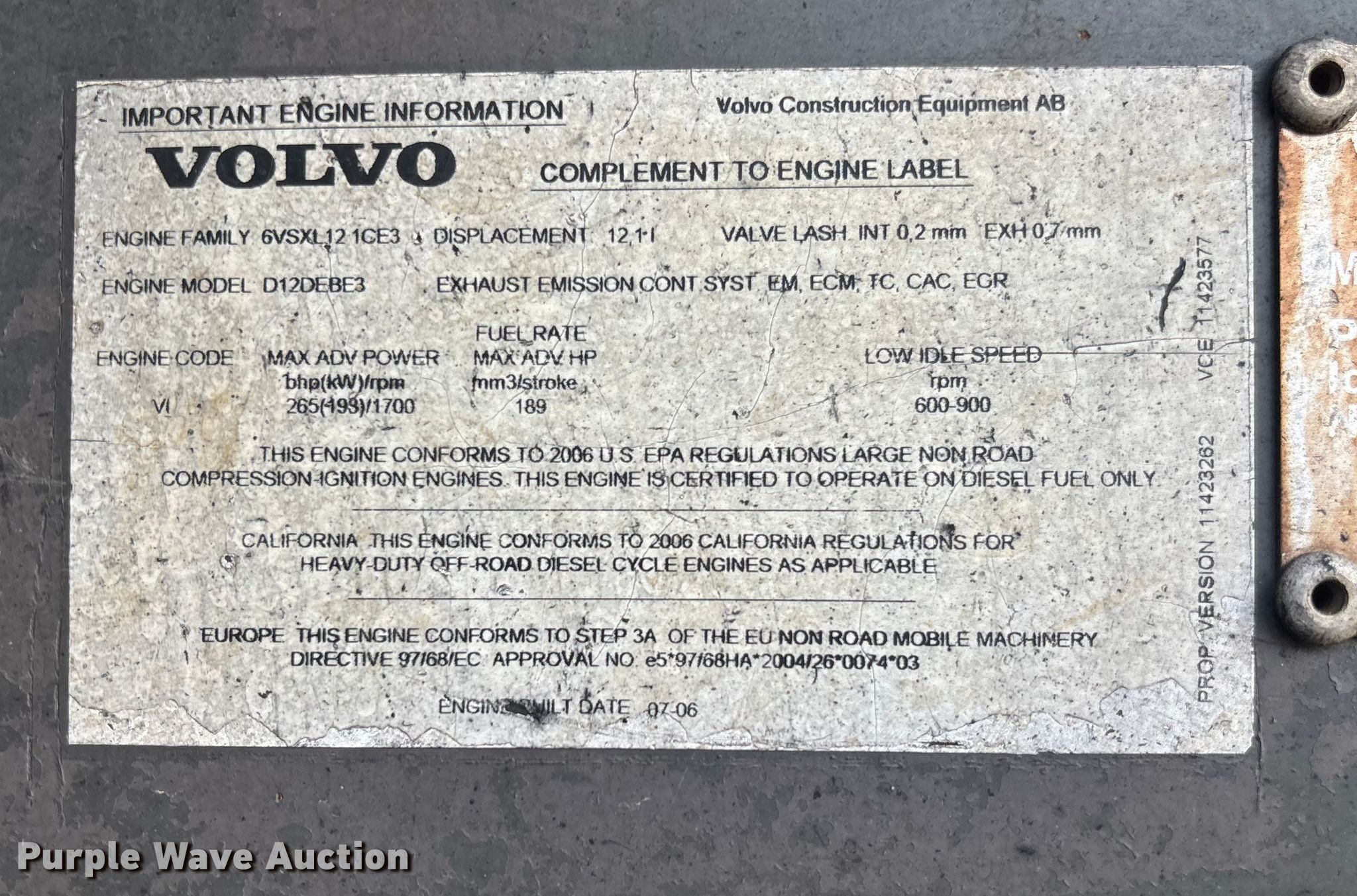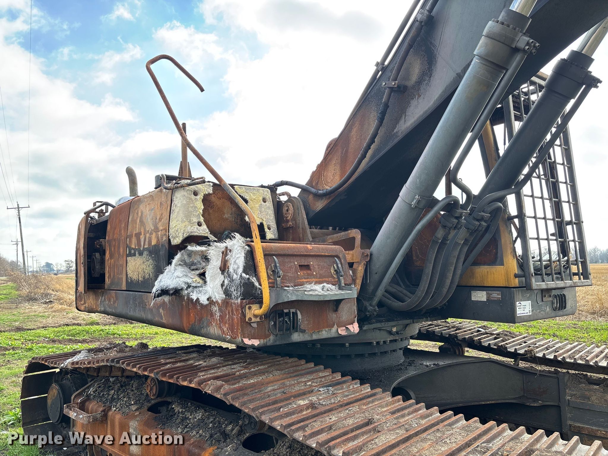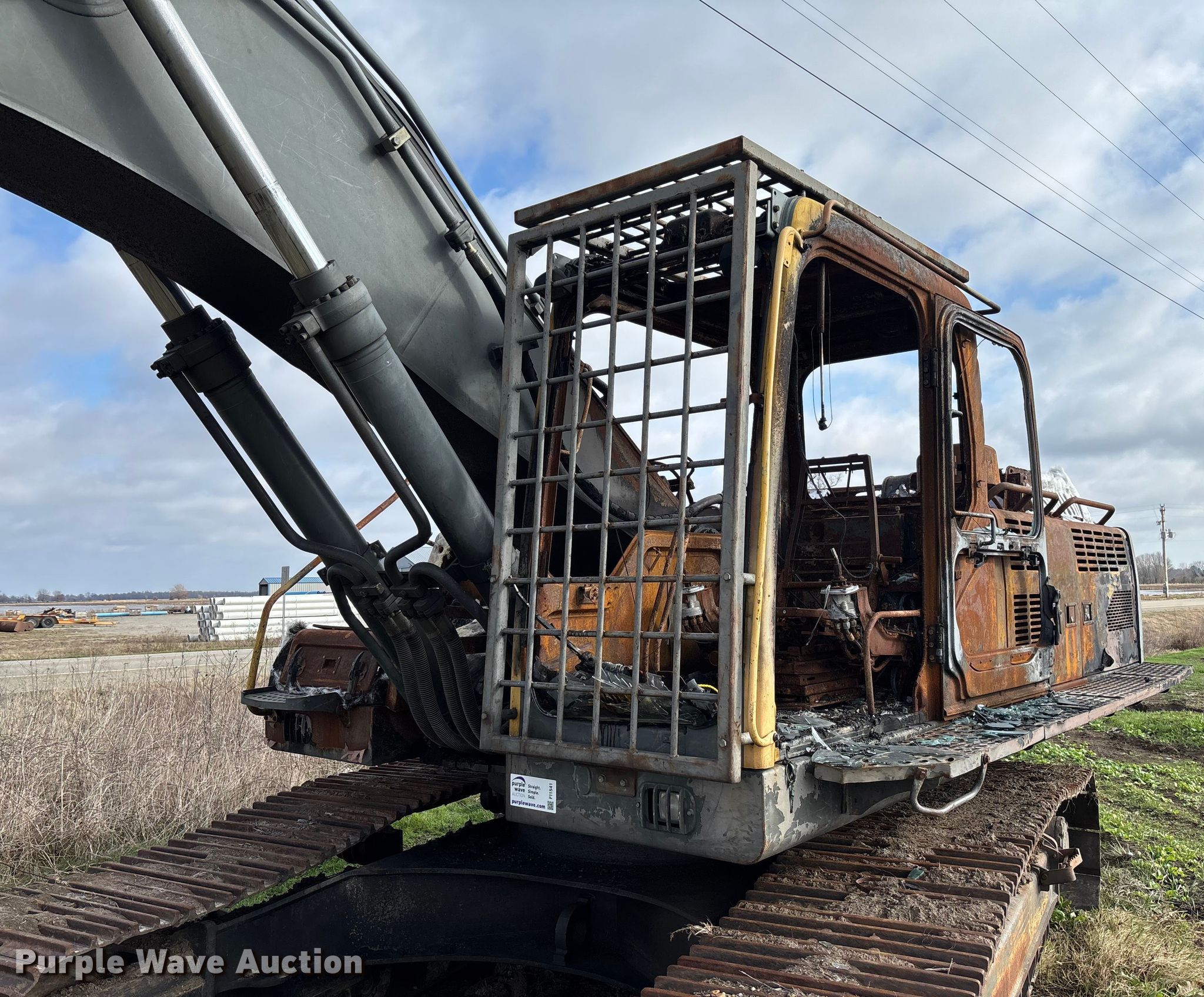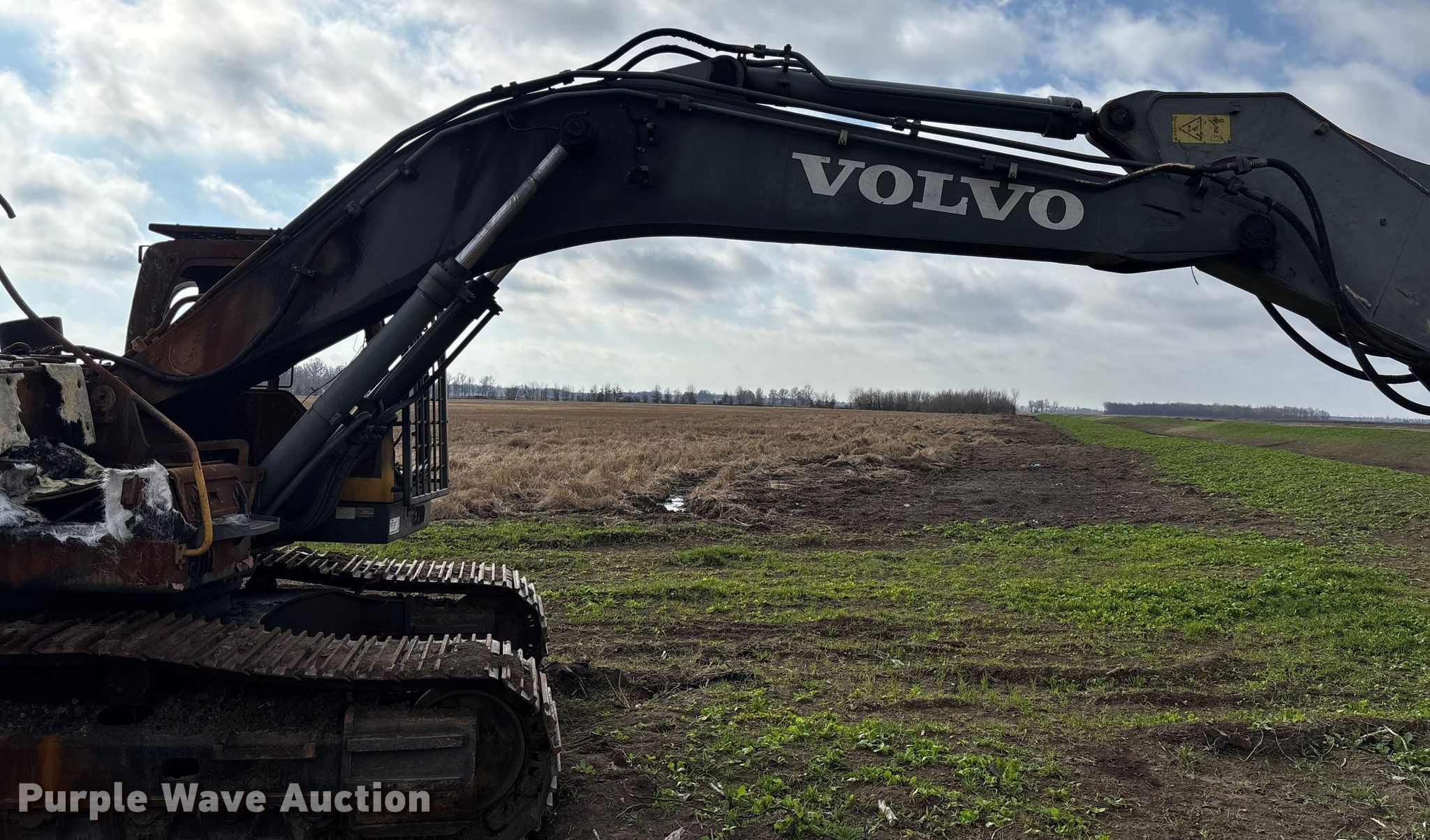 2007 Volvo EC330BLC Excavator. Serial: VCEC330BC00080226. Engine Volvo D12DEBE3, Displacement: 12.1L, Cylinders: 6, Fuel type: Diesel, HP: 265. Transmission Hydrostatic. Operators station Enclosed cab. Features Auxiliary hydraulics Standard, Boom Standard, Stick Stick length: 12' 2", Thumb: Hydraulic Geith, Bucket Geith, Width: 60", Teeth: 5. Tracks Width: 31.5", Steel. Notes Unable to get hour meter due to damage, Fire damage to engine / cab, Non-operational unit. Kinder Brothers Excavating. Delaplaine, AR 72425