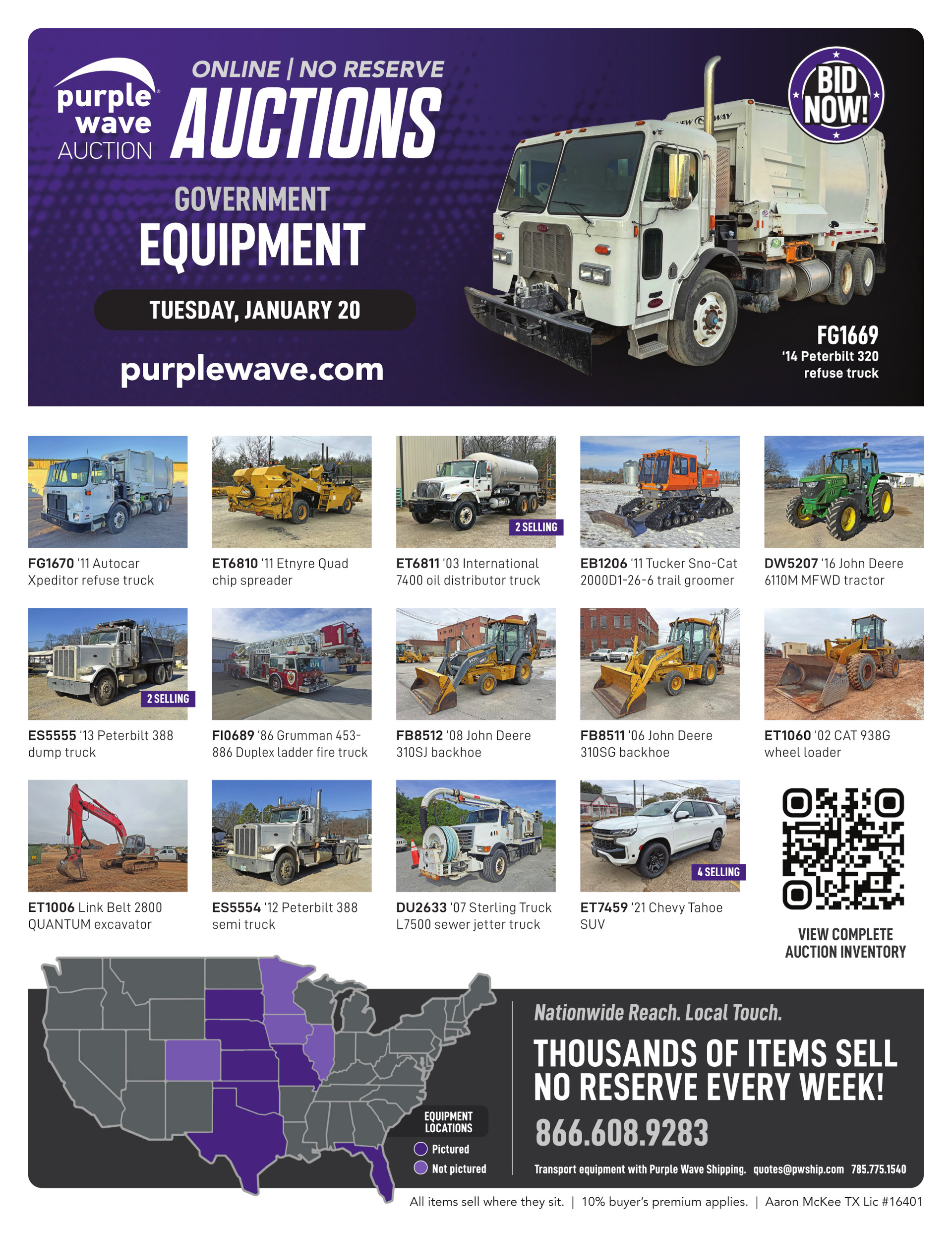 Purple Wave attempts to give its customers an industry leading experience by providing detailed equipment listings. Listings include written descriptions, photographs, location, and consignor information. Equipment descriptions are based on our direct observation and information provided by our selling customer. All information is intended to be as accurate as possible. However, we recommend customers inspect prior to bidding. Purple Wave listings are not intended to be substitutions for inspection. The details provided may differ on equipment based on information provided by the consignor. An error or omission in the listing will not change the results of the bid. It is the responsibility of the buyer to conduct any inspection and examination necessary to satisfy the buyer of all material facts before placing a bid. Purple Wave is not responsible for any statements about the item made by the Seller.