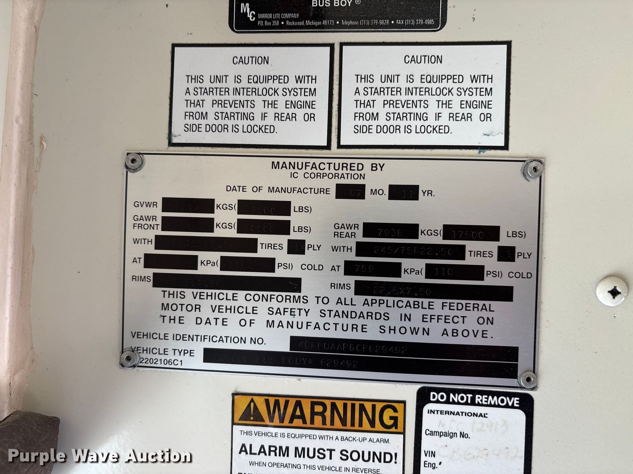 Take a look at this used 2012 IC PB105 school bus being sold on January 20th, 2026 in the Tuesday January 20 Government Auction made by IC. Take a look at all of the item information below or take a look at similar auctions for Transit Vehicles.