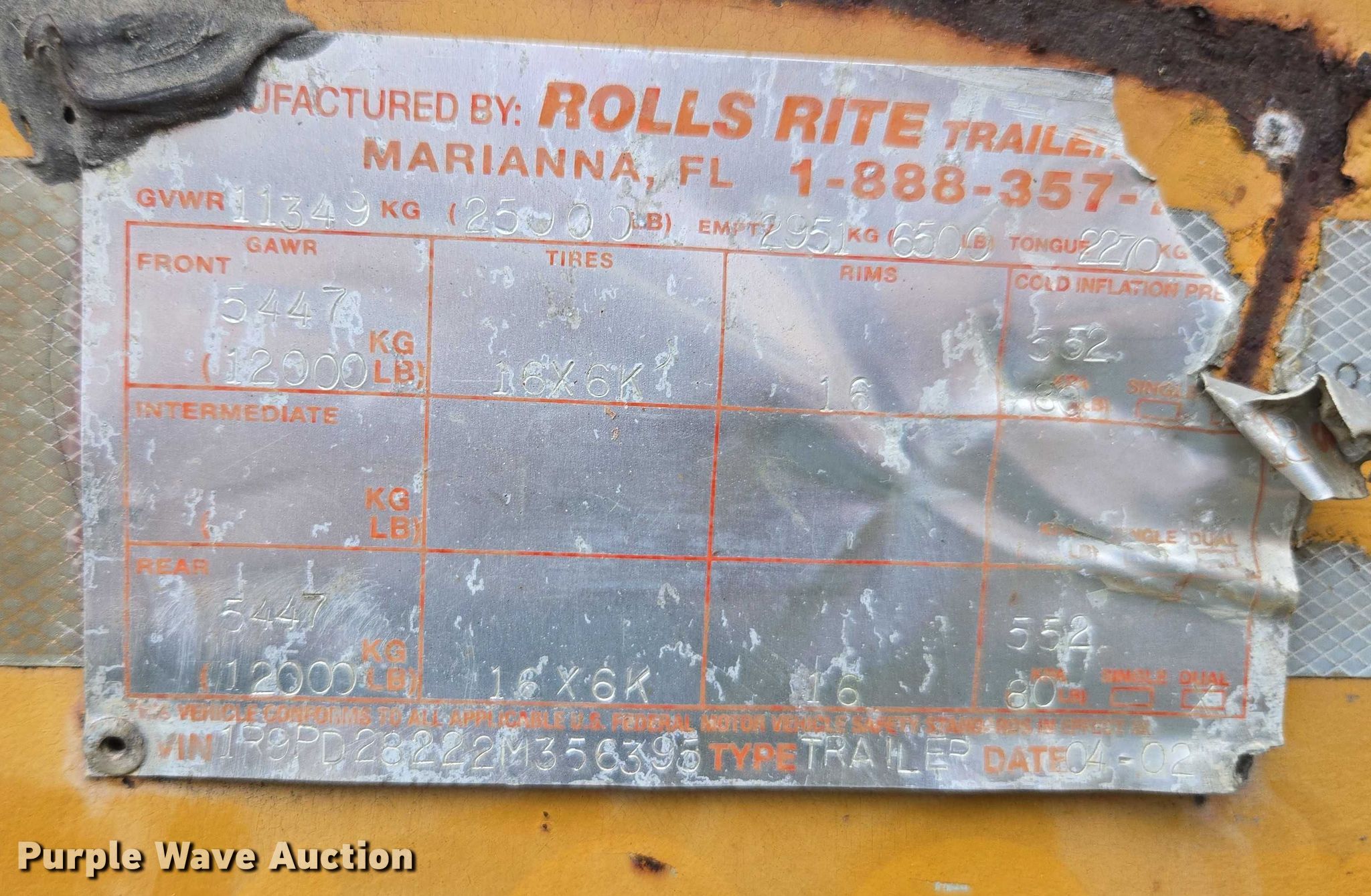 2002 Rolls Rite equipment trailer. VIN: 1R9PD28222M356395, Unit #: PWS-6395. Dimensions Overall Length: 33', Width: 102", Deck Length: 23', Width: 96", Tail length: 5', Ramps: Manual Length: 5'. Features Deck type: Wood. Chassis Hitch: Pintle, Landing gear: Single, Suspension: Spring, Brakes: Air, Axles: Tandem, GVWR: 25,000 lbs, GAWR: 12,000 lbs. Tires Steel wheels, Size: 235/85R16. Notes Deck board damage. Florida title. Seller is a government entity who will be assigning and distributing the title. Please contact the seller for distribution questions. City of Port St. Lucie. Port St. Lucie, FL 34953