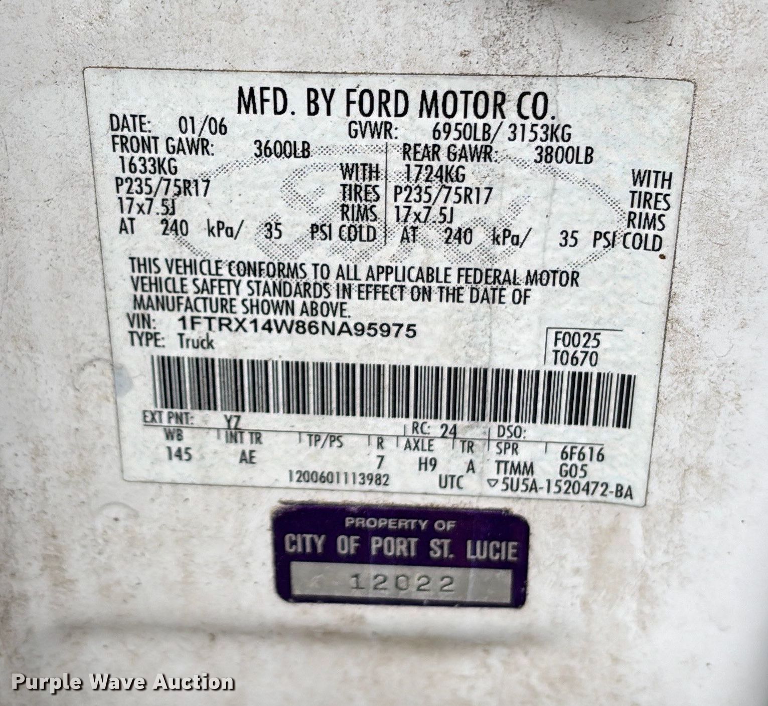 Purple Wave is selling a used 1/2 Ton Pickup or Van in Florida. This item is a 2006 Ford F150 Ext. Cab pickup truck with the following: Miles: Unknown, VIN: 1FTRX14W86NA95975