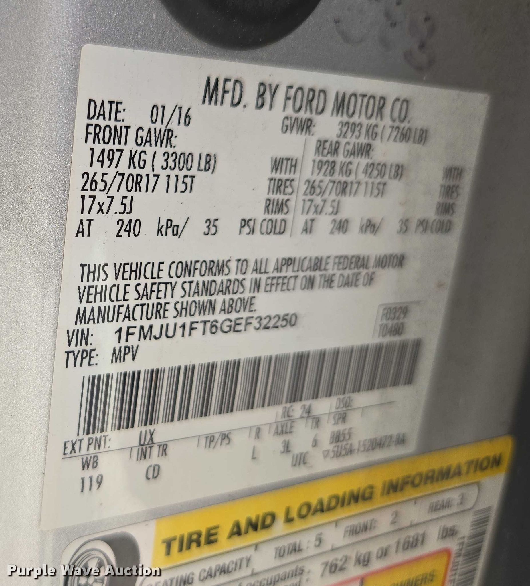 Purple Wave is selling a used Passenger Vehicle in Florida. This item is a 2016 Ford Expedition XL SUV with the following: Miles: 97,506 on odometer, VIN: 1FMJU1FT6GEF32250