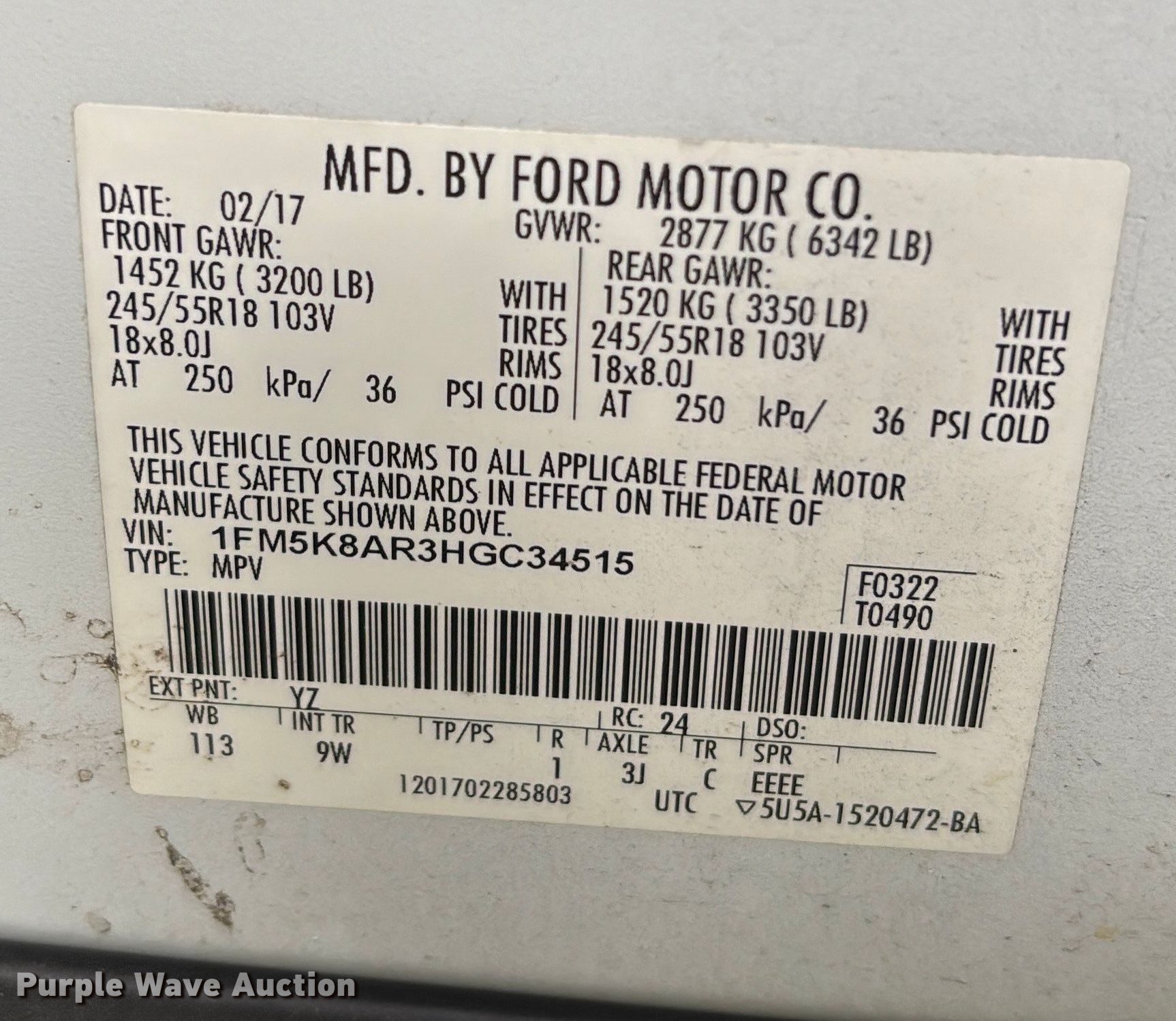 - VIN: 1FM5K8AR3HGC34515