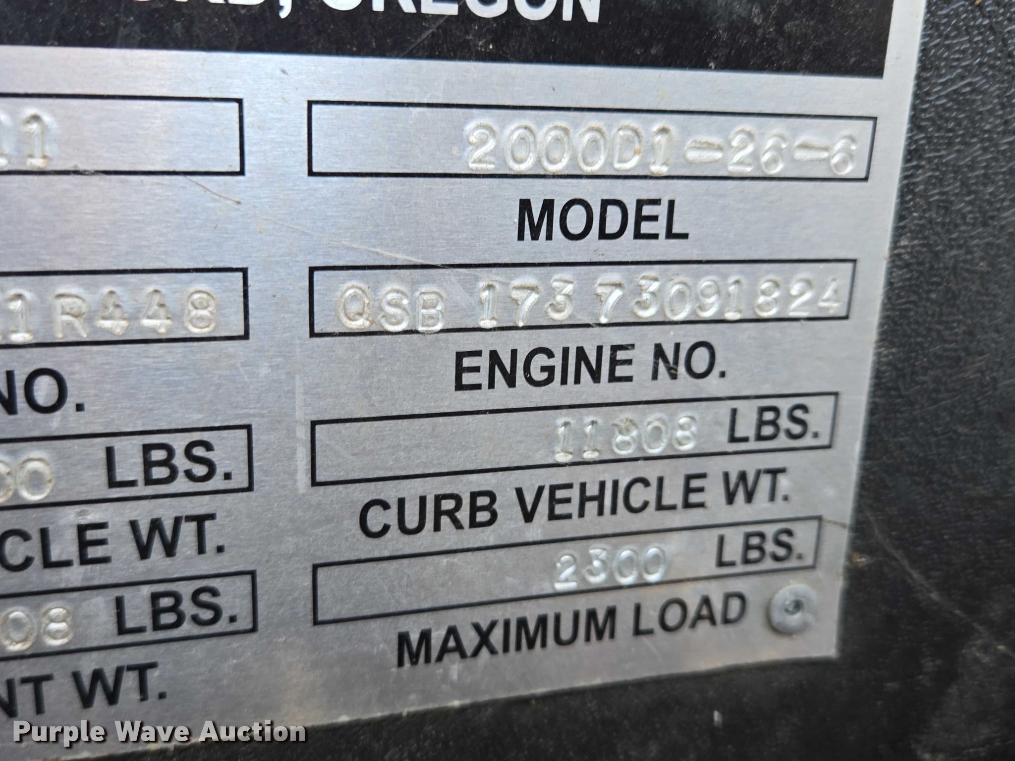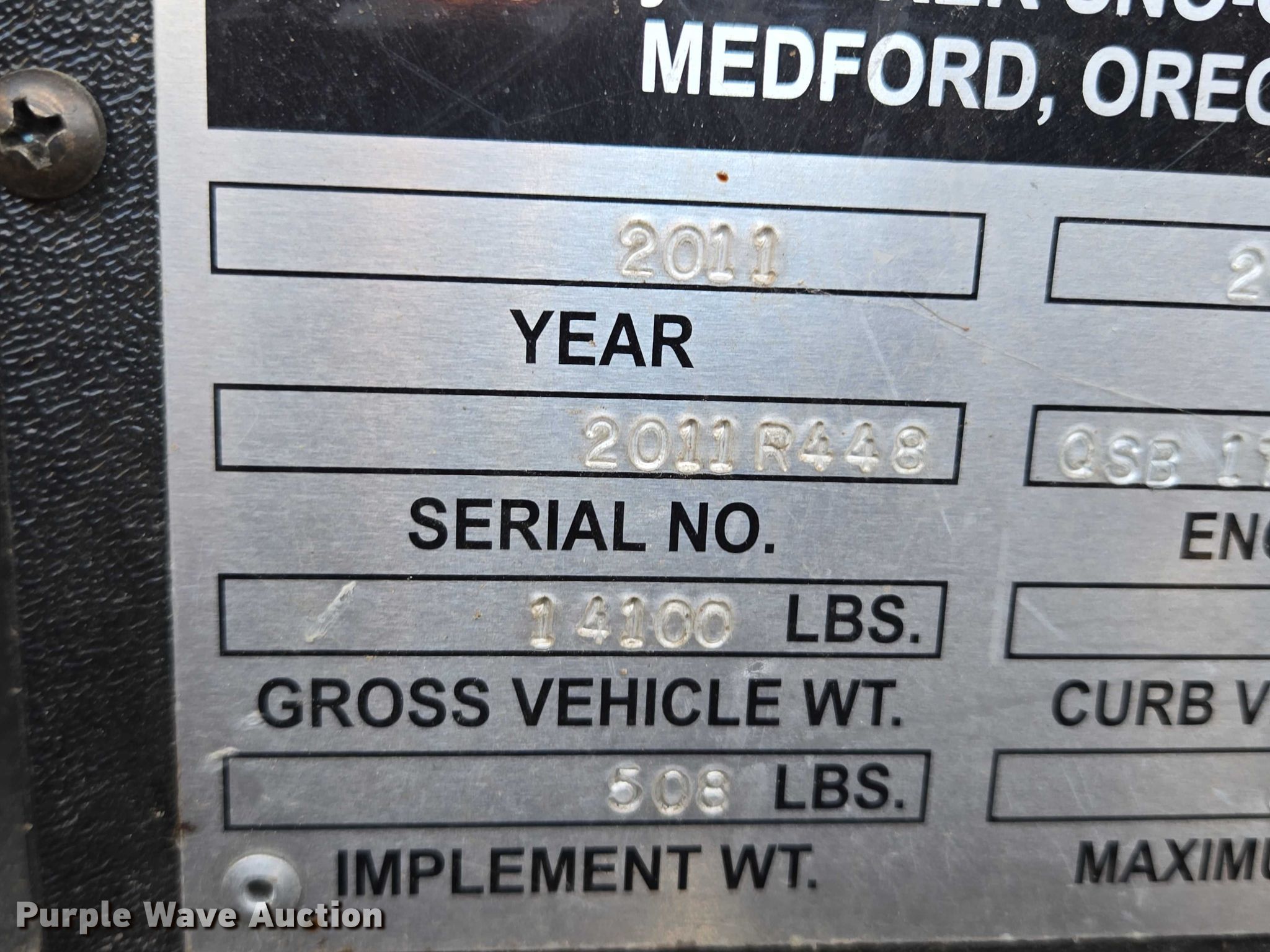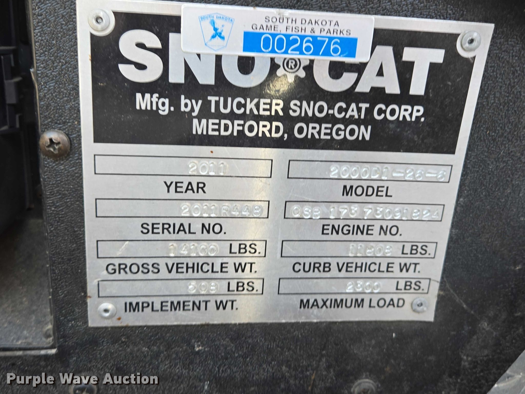 2011 Tucker Sno-Cat 2000D1-26-6 trail groomer. Hours: 3,487 on meter, Serial: 2011R448, Unit #: 2676. Engine Cummins, Displacement: 6.7L, Cylinders: 6, Fuel type: Diesel. Transmission Allison, Automatic. Operators station Heat. Features Hydraulic remote sets Rear: 3, Front blade Width: 101", Blade controls: Joystick. Tracks Width: 26". Notes Parking brake issues, sticks. State of South Dakota. Sisseton, SD 57262