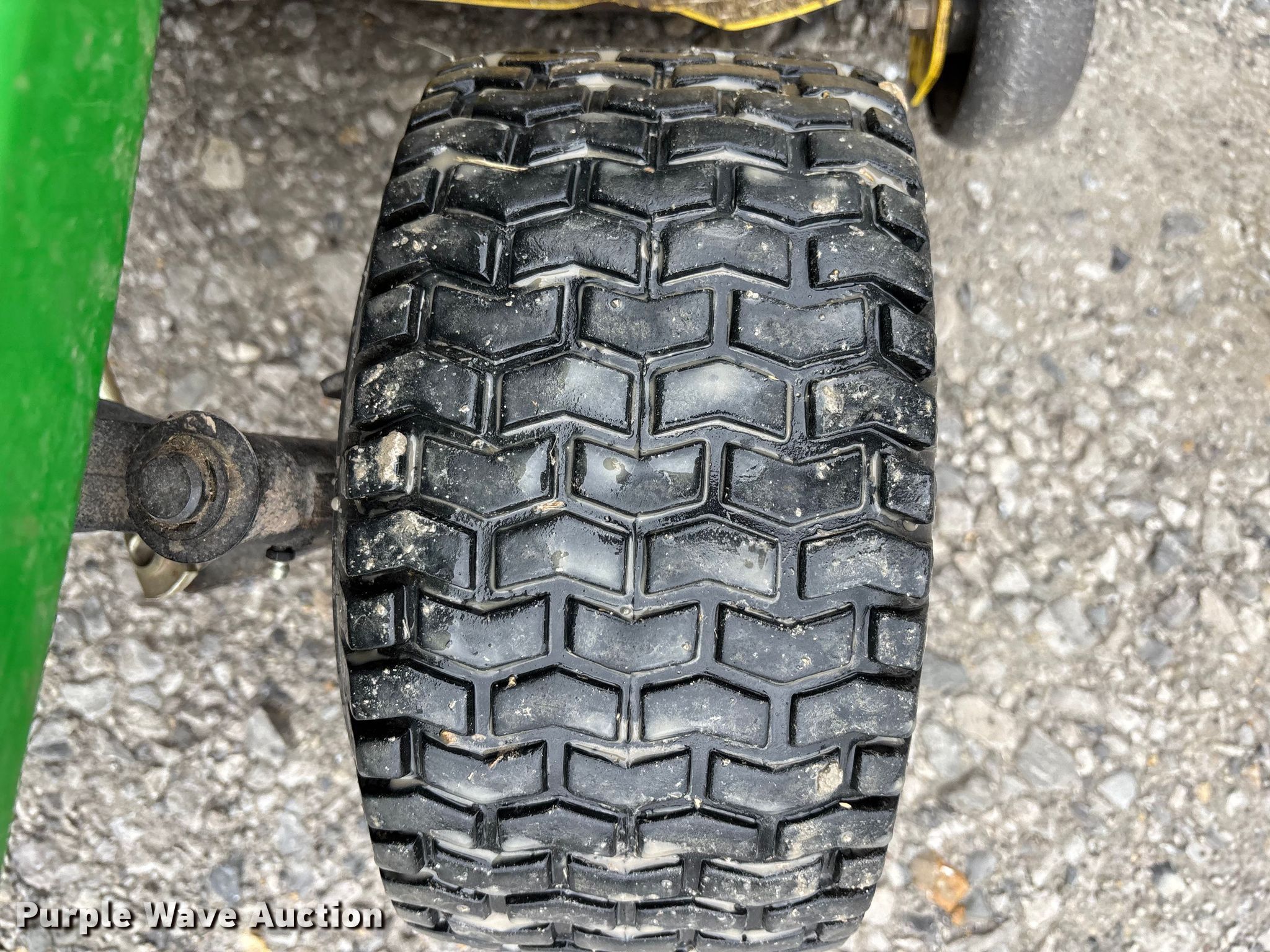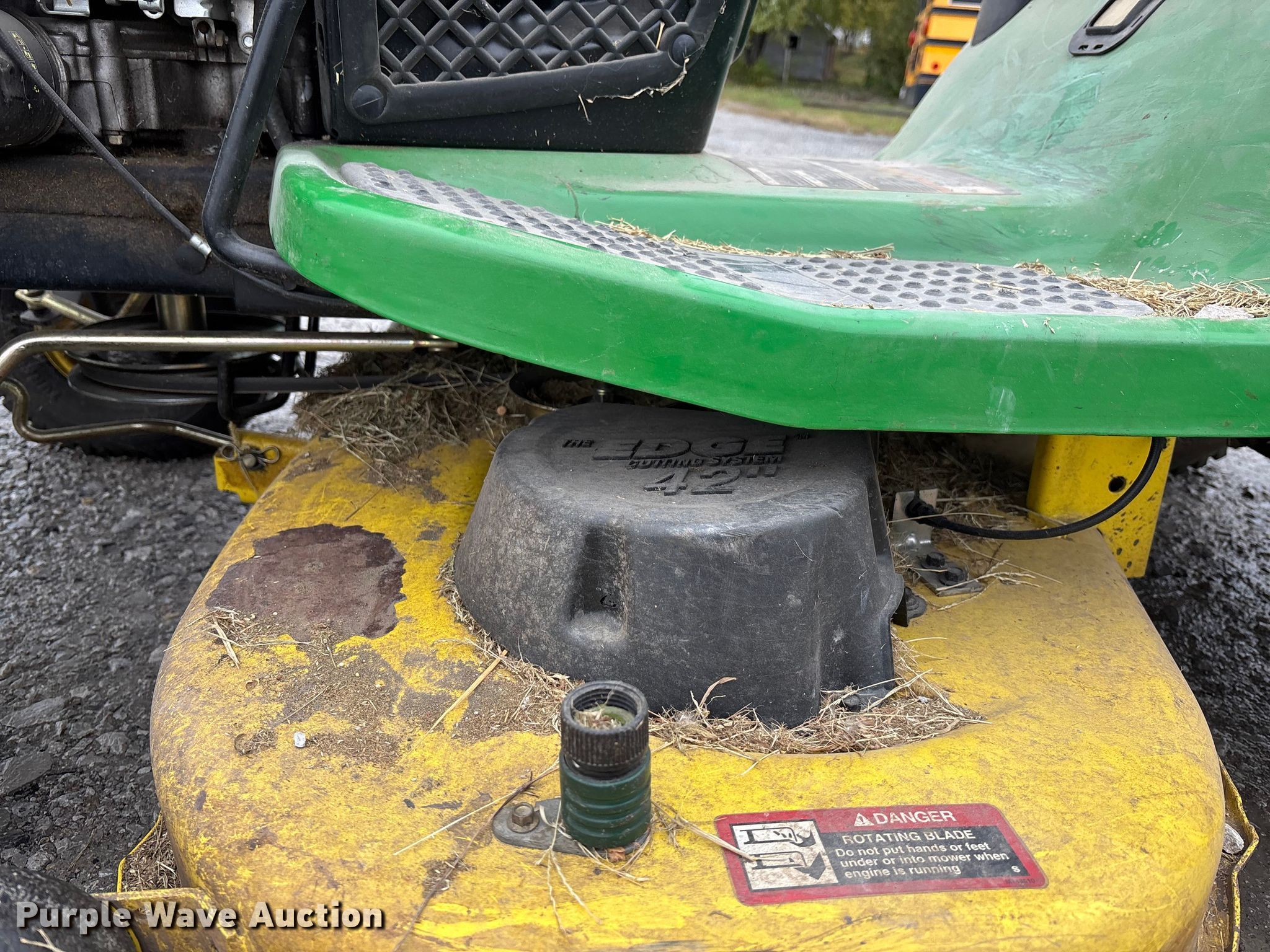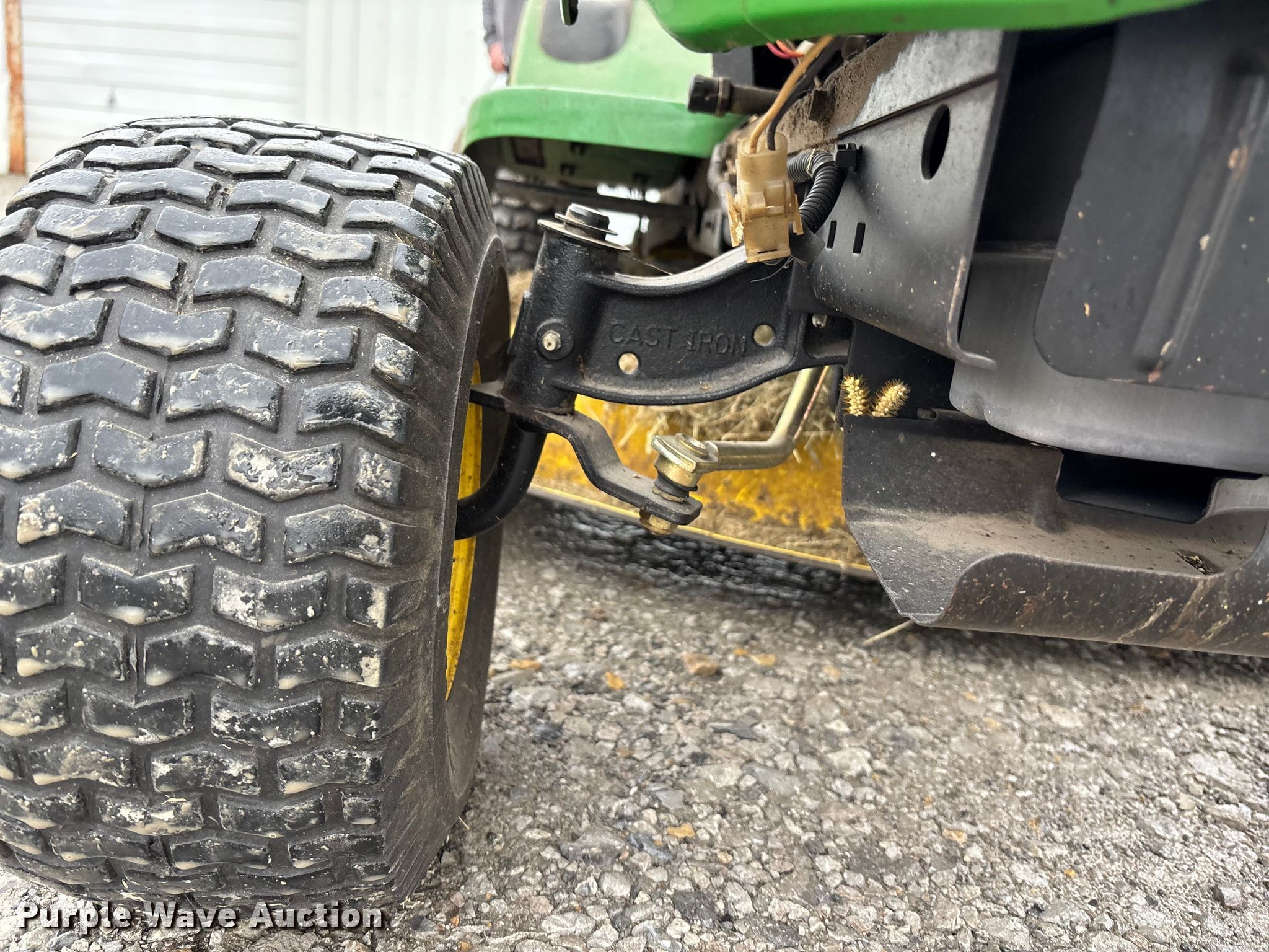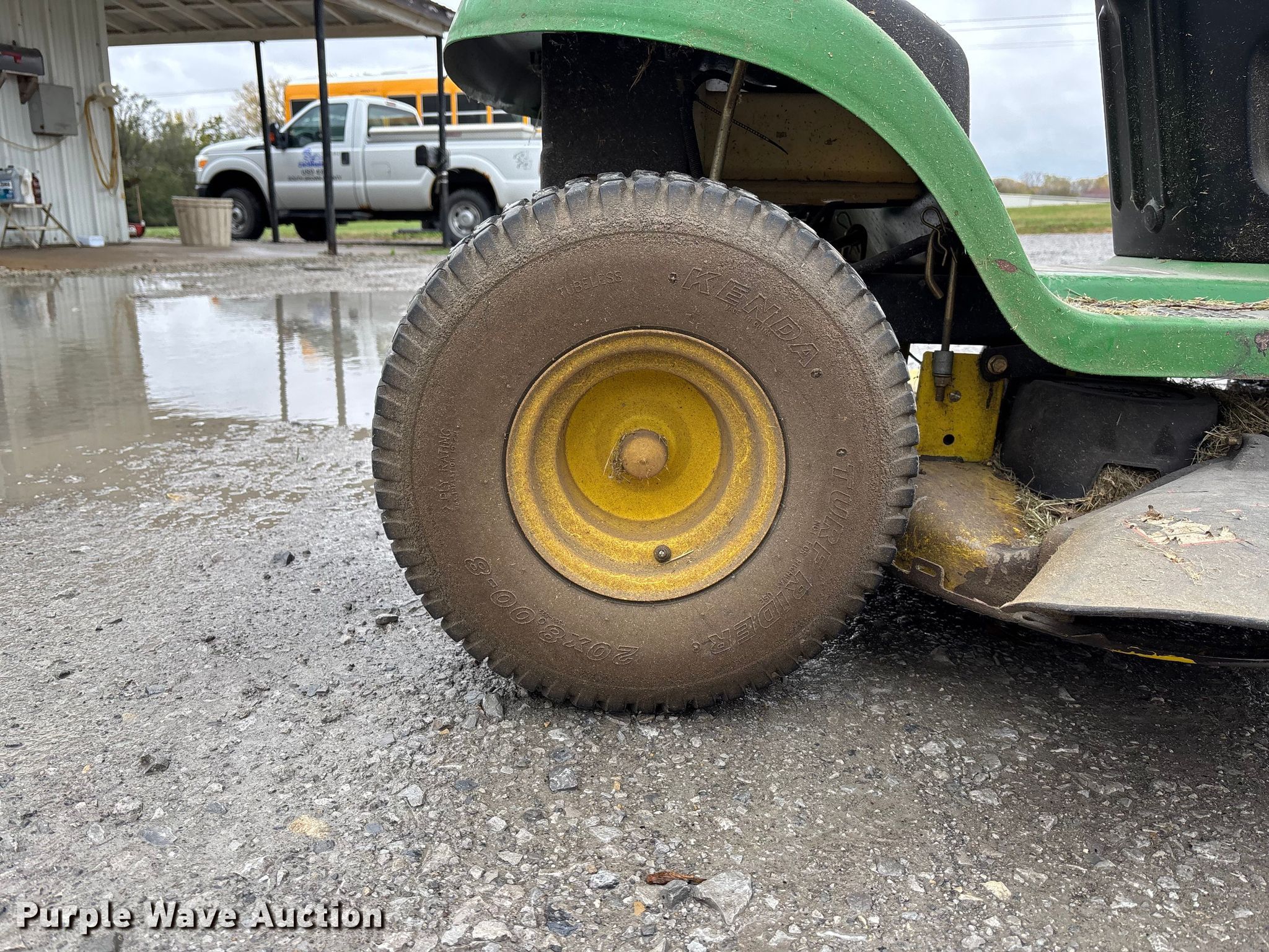 2009 John Deere LA105 lawn mower. Hours: 289 on meter, Cutting width: 42", Serial: GXA105A230866. Engine John Deere, Cylinders: 1, Fuel type: Gas, HP: 19.5. Transmission Manual, Speed: 5. Features Mower deck Width: 42", John Deere. Tires Front: 15x8.00-6, Rear: 20x8.00-8. Notes Jump start required during on-site data collection, Unknown operating condition. Horton, KS 66439