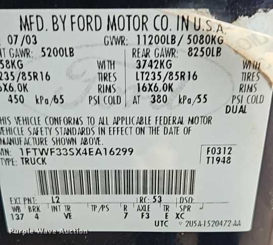 Purple Wave is selling a used 3/4 or 1 Ton Pickup or Van in Kansas. This item is a 2004 Ford F350 Super Duty XL flatbed pickup truck with the following: Miles: 59,555 on odometer, VIN: 1FTWF33SX4EA16299