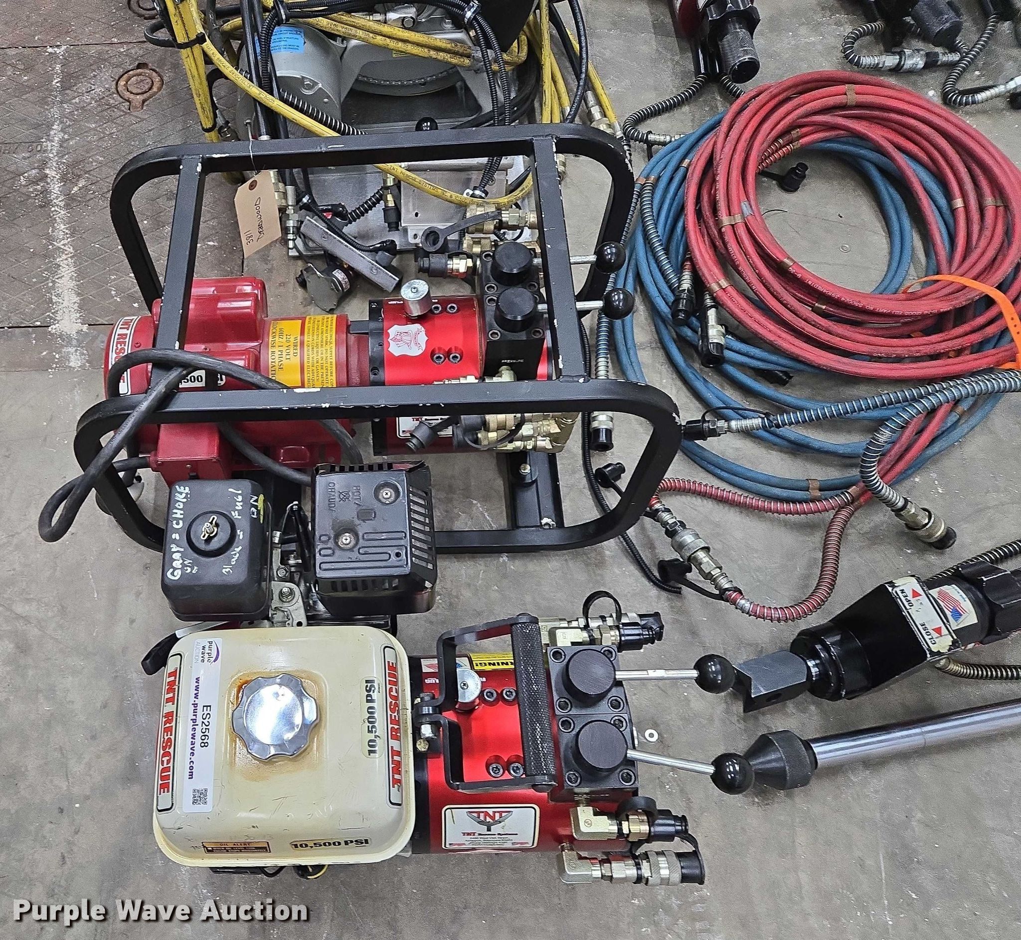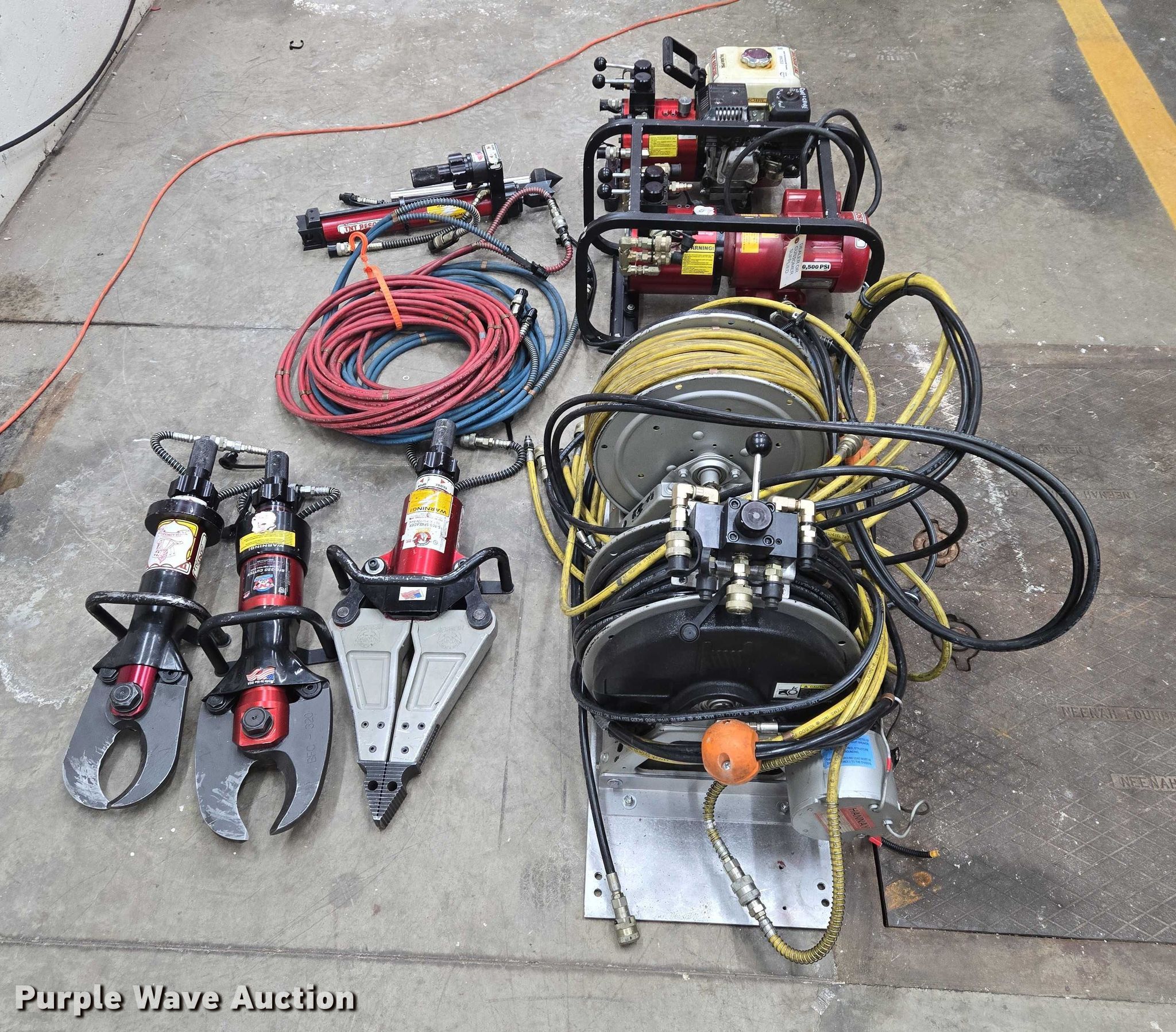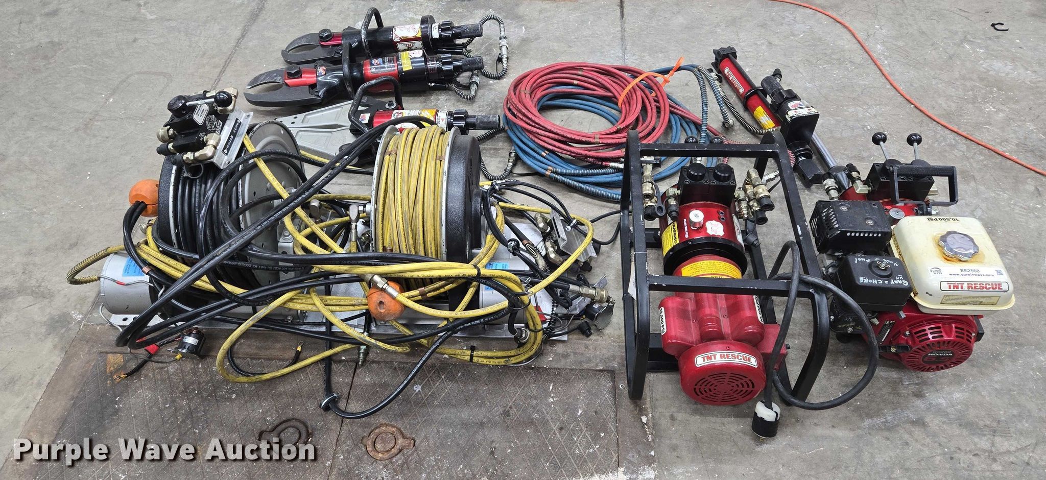 Purple Wave is selling a used Tools in South Dakota. This item is a TNT rescue equipment with the following: (2) hose reels, Lengths:, 50', 200',, BFC-320 cutter, Deadwood cutter, S-100 spreader, Width: 18", R-Series ram, Ram length: 18", Pump, Volts: 220, Pump, Honda gas engine, HP: 6.5