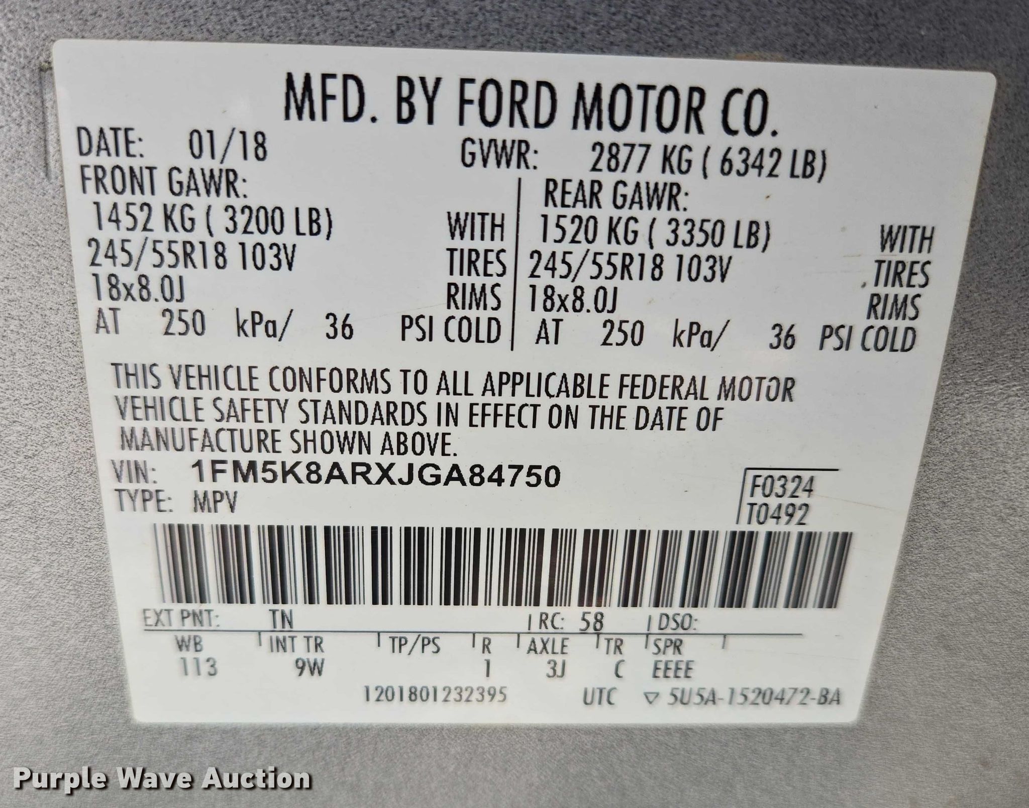 2018 Ford Explorer Police Interceptor SUV. Miles: 261,774 on odometer, Hours: 9,816 on meter, VIN: 1FM5K8ARXJGA84750. Engine Displacement: 3.7L, Cylinders: 6, Fuel type: Gas. Transmission Automatic, All wheel drive. Interior AC, Heat, Seat: Power driver, Heated mirrors, Power windows, Power locks, Cruise control, Backup camera. Tires Size: 255/60R18. Notes Dash warning indicator: Check engine, TPMS, Hail damage, Non-operational rear hatch. South Dakota title. Title distribution may be delayed up to 14 days from verification of funds. McCook County, SD. Salem, SD 57058