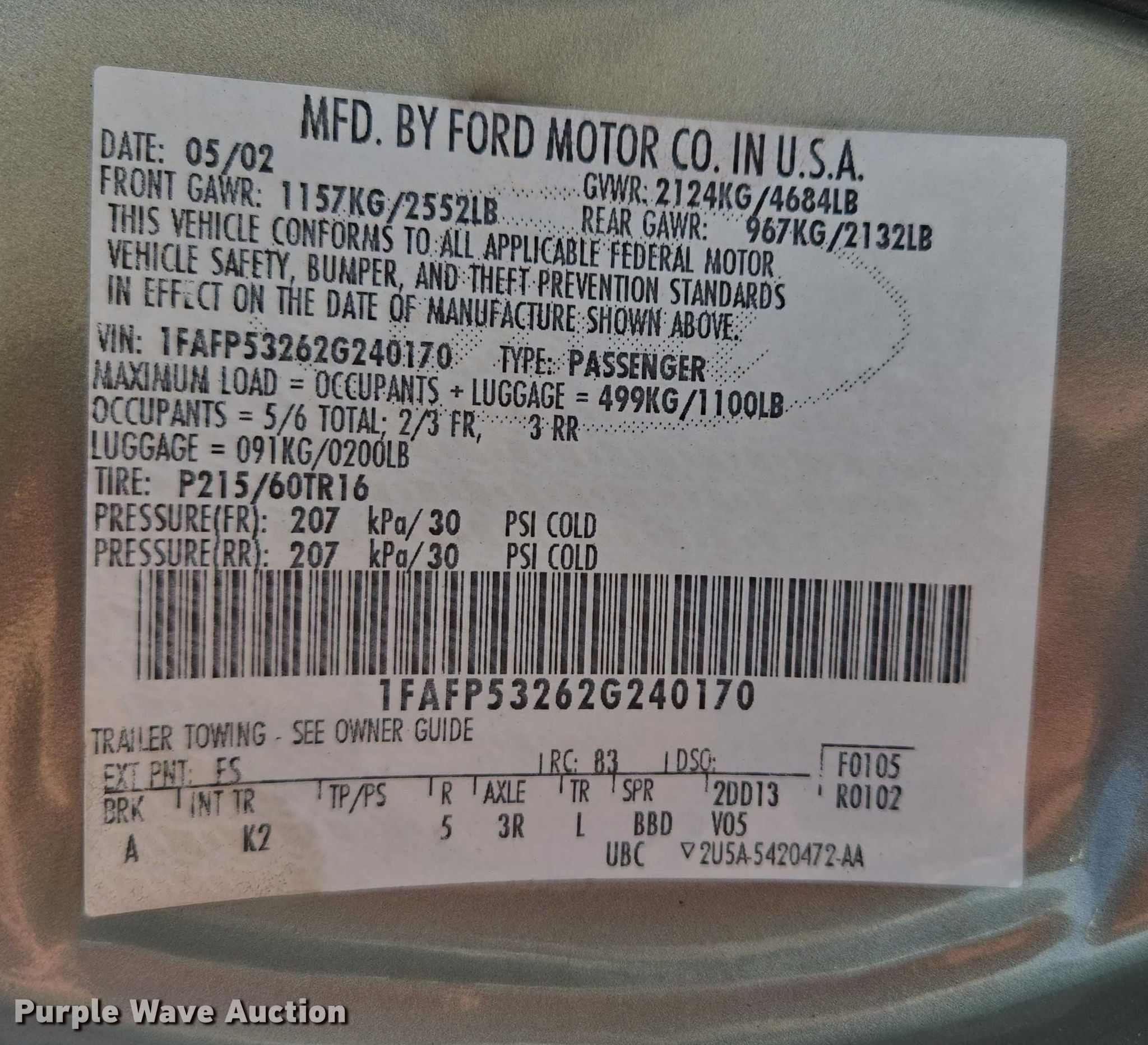 • VIN: 1FAFP53262G240170