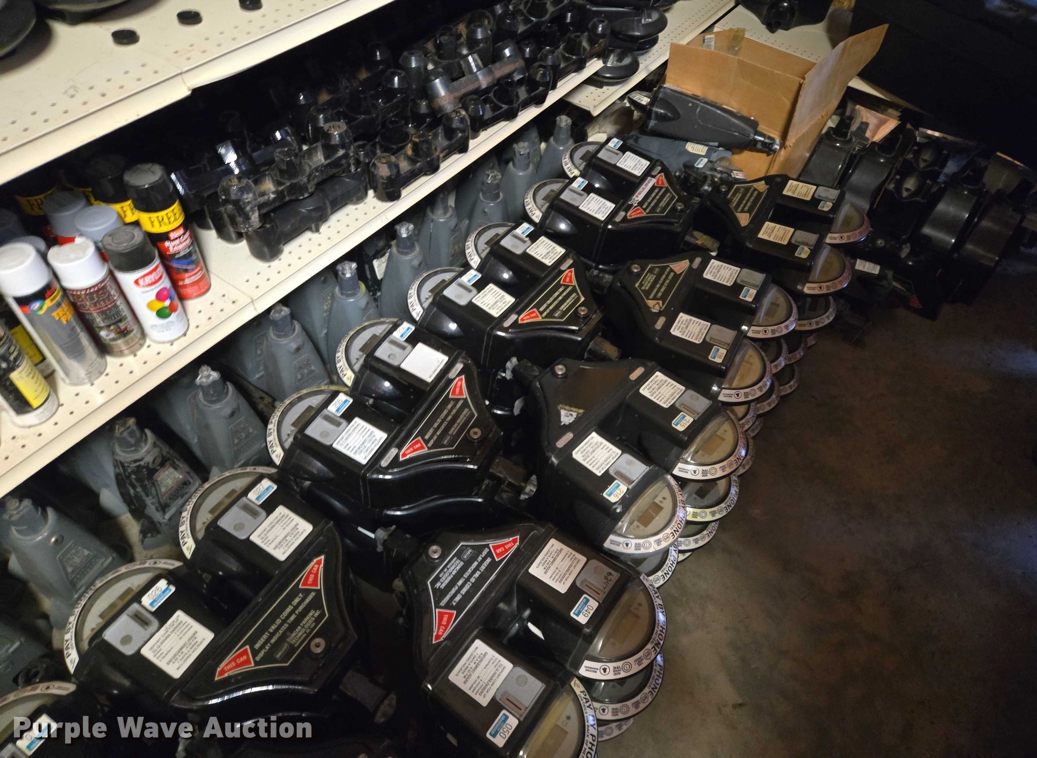 Duncan Industries parking meters. Approx. 437 meter mechanisms, (68) single dome meters, (127) double dome meters, (68) meter bases. Notes Shelving not included. City of Deadwood, SD. Deadwood, SD 57732