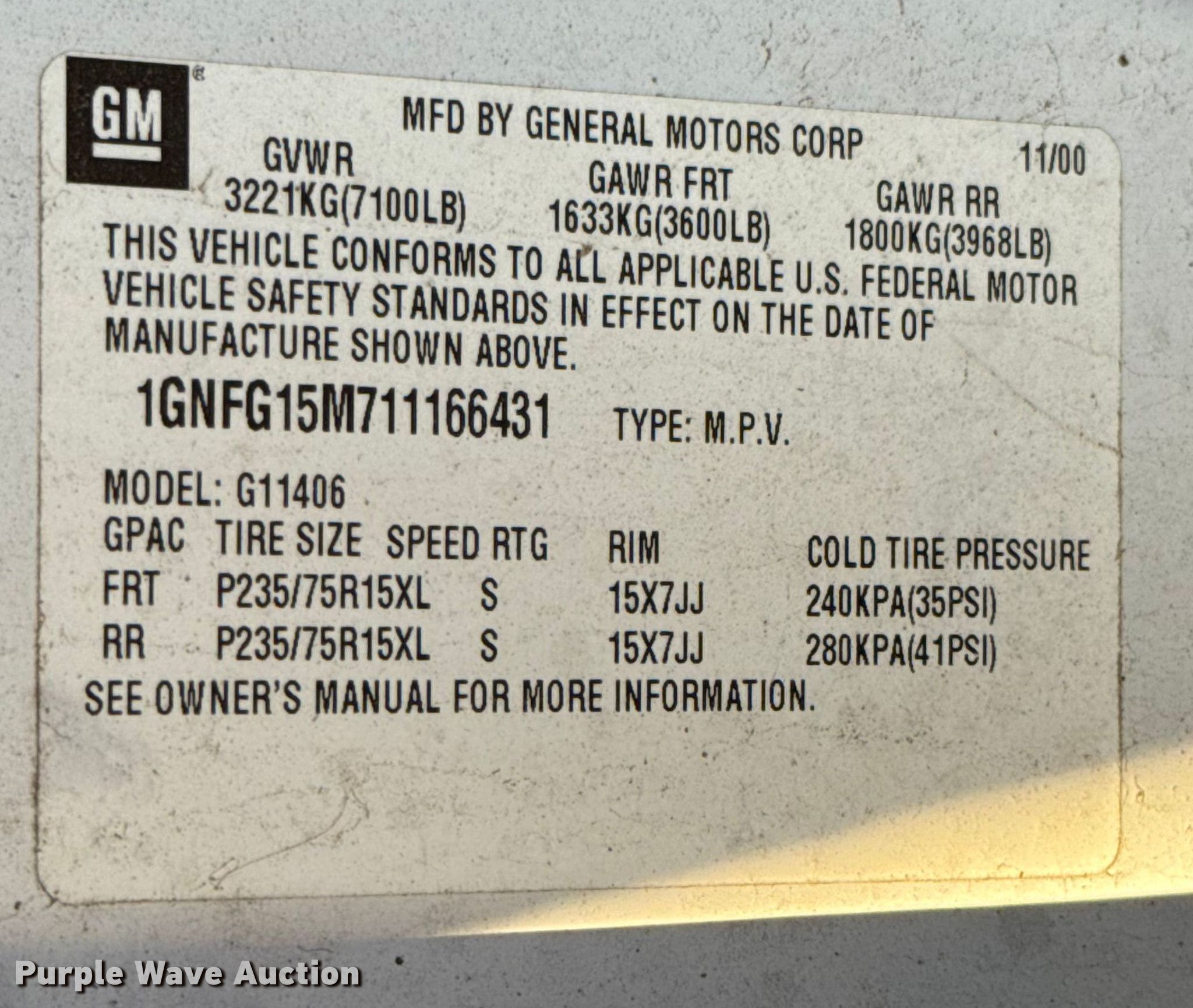 Purple Wave is selling a used 1/2 Ton Pickup or Van in Oklahoma. This item is a 2001 Chevrolet Express 1500 van with the following: Miles: 90,124 on odometer, VIN: 1GNFG15M711166431