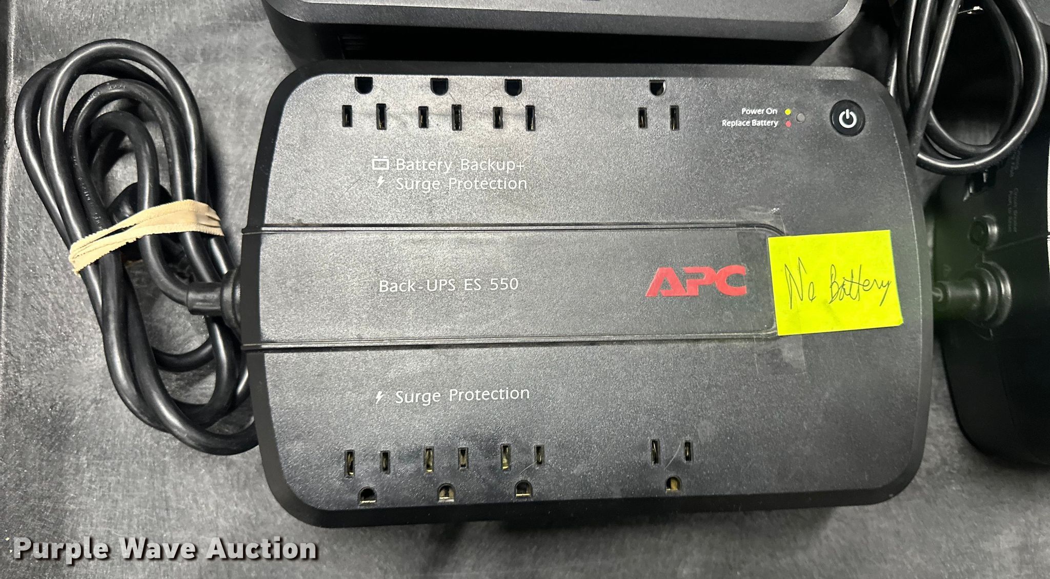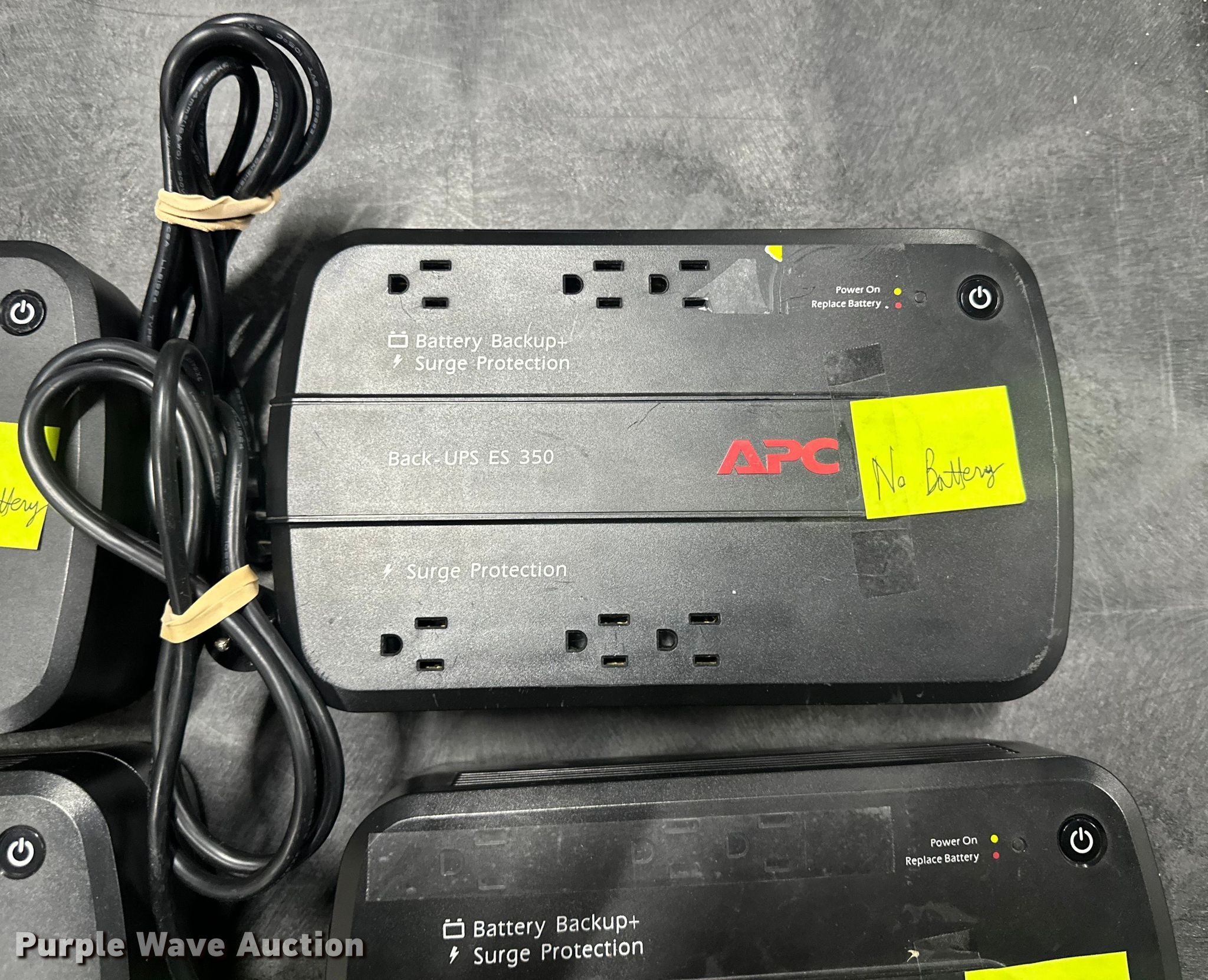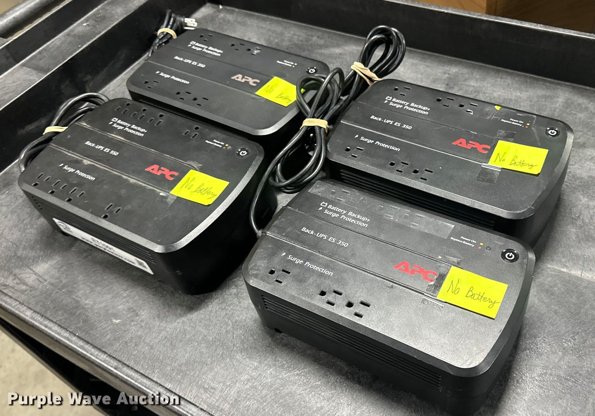 Purple Wave is selling a used Electronics in Oklahoma. This item is a Back up power supplies with the following: (3) APC BACK-UPS ES 350, (1) APC BACK-UPS ES 550, No batteries